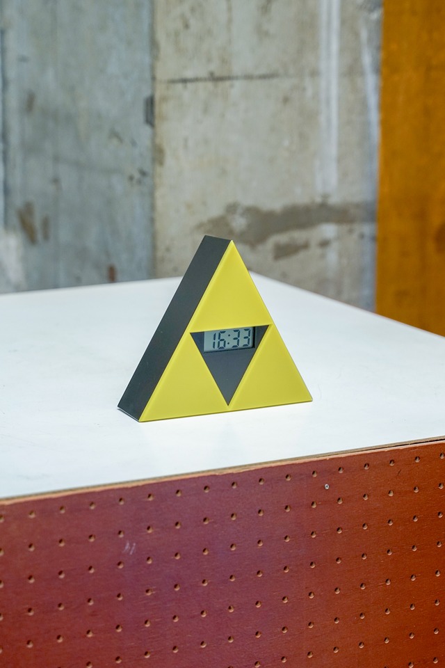 幅17cm 奥行5cm 高さ15cm 三角形で、イエローカラーもかわいくてアイコニックな時計〜と思っていたのですが、調べてみるとこれは「ゼルダの伝説」の「トライフォース」というらしいです。 トライフォースのことを全然知らなかったので調べたら「力・知恵・勇気の3つの要素が組み合わさった金色の神聖な三角形の秘宝」と出てきました。 そんなものが家にあったらすごい。