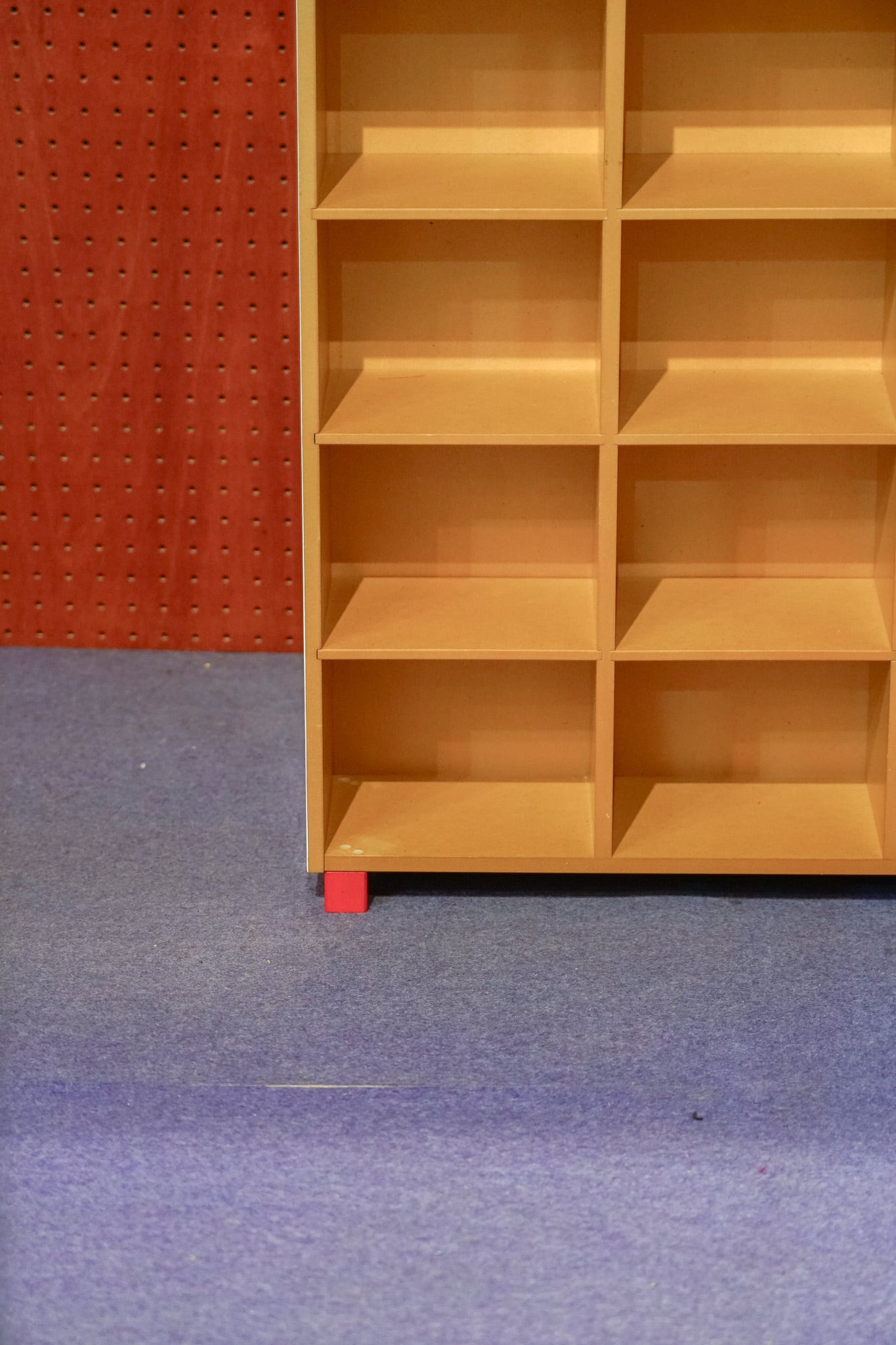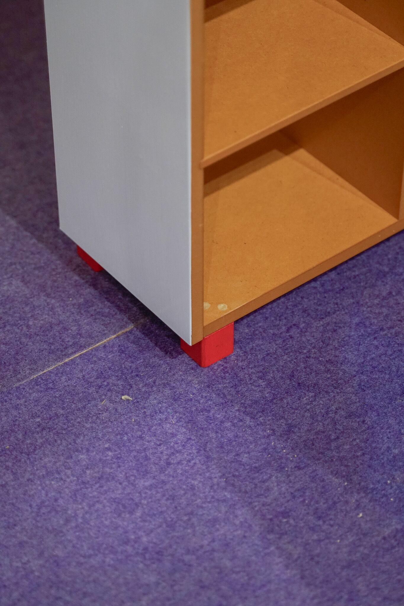 MDFっぽい素材。もともと素材ままの色だったので、外側をペイントして、赤い脚をつけてキャビネット風にリメイクしてみました。