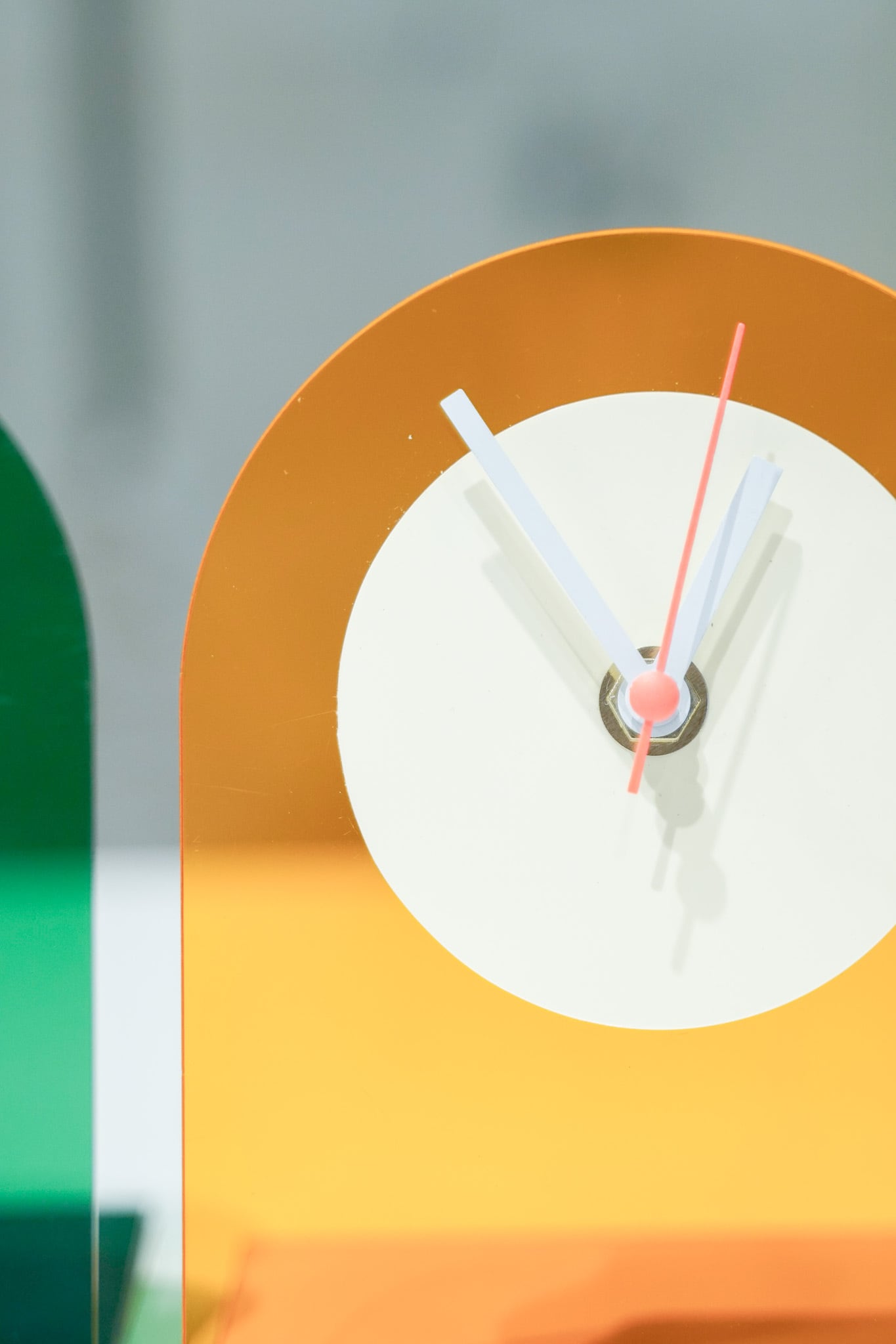 直角だったブックエンドを熱して時計が見やすい角度に曲げたり、秒針を蛍光塗料で塗装したり、見た目以上に意外と手をかけてます。暗闇でヌルッと光る秒針、いいな...