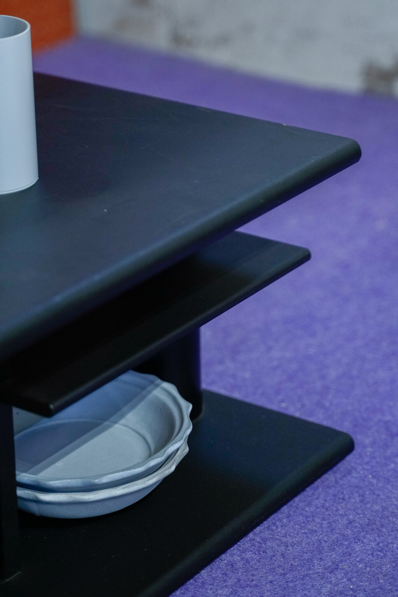 オールブラックで棚板は艶消しのブラック、縦の柱は円柱で金属製です。地味に異素材ミックスなところも素敵ポイント。