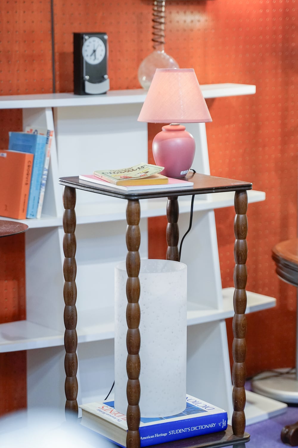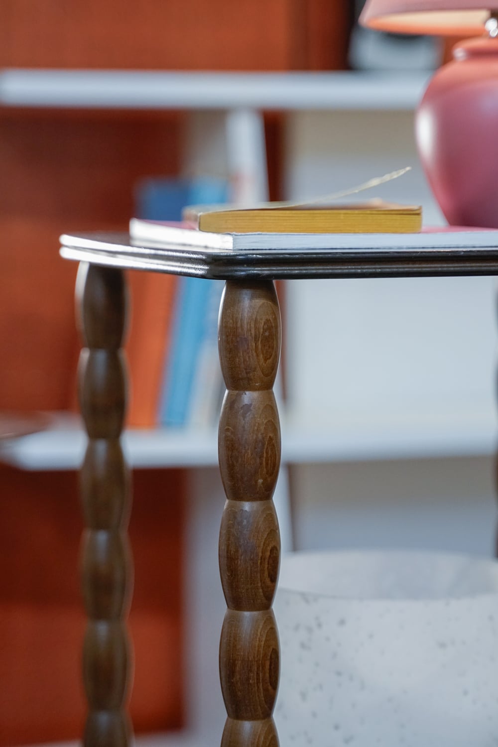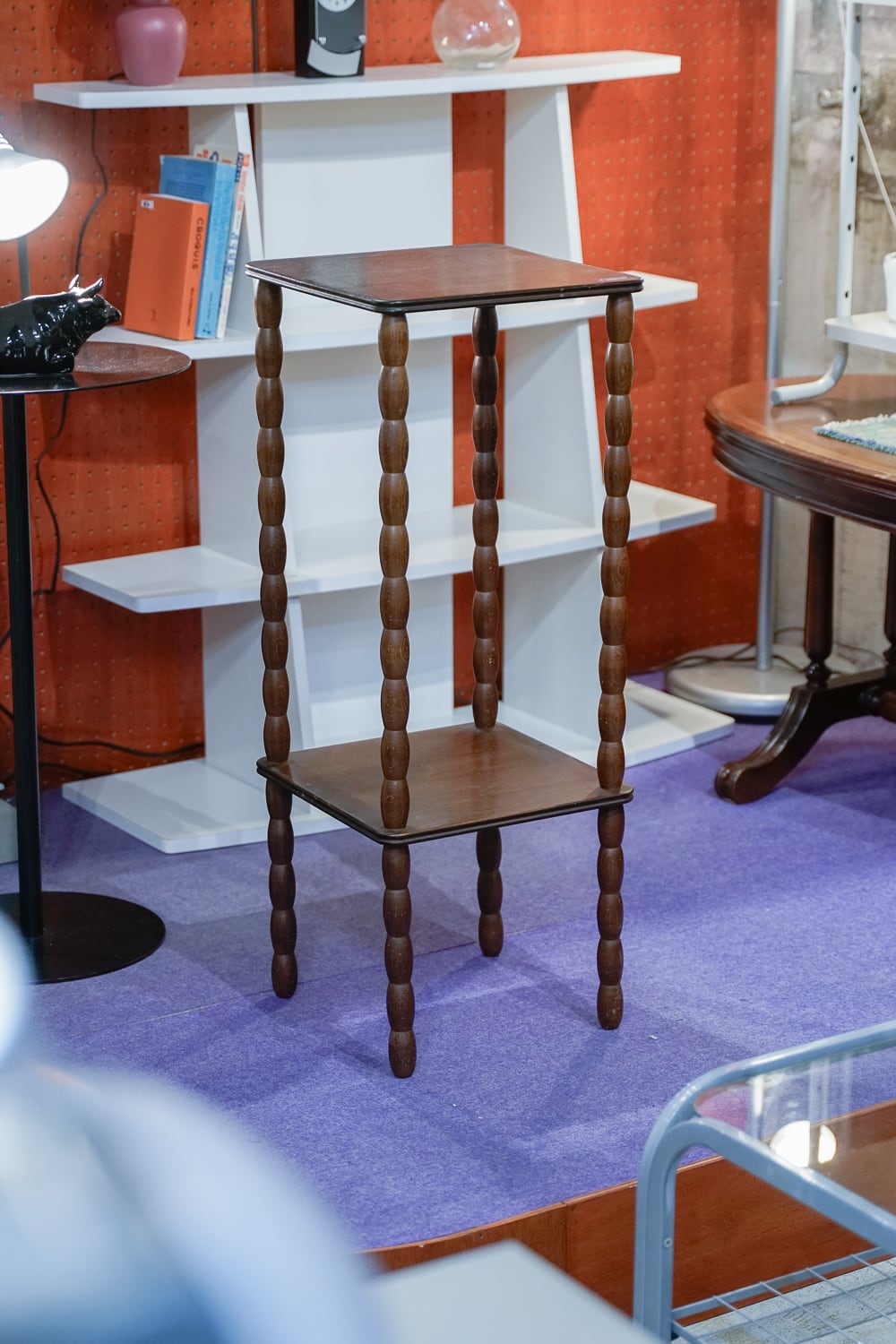脚がぽこぽこしている木製の細身の台です。スレンダーだな〜。心もとない感じがしますがしっかり立っています。高さとサイズ感から、もとは電話台なのかな〜と思っています。