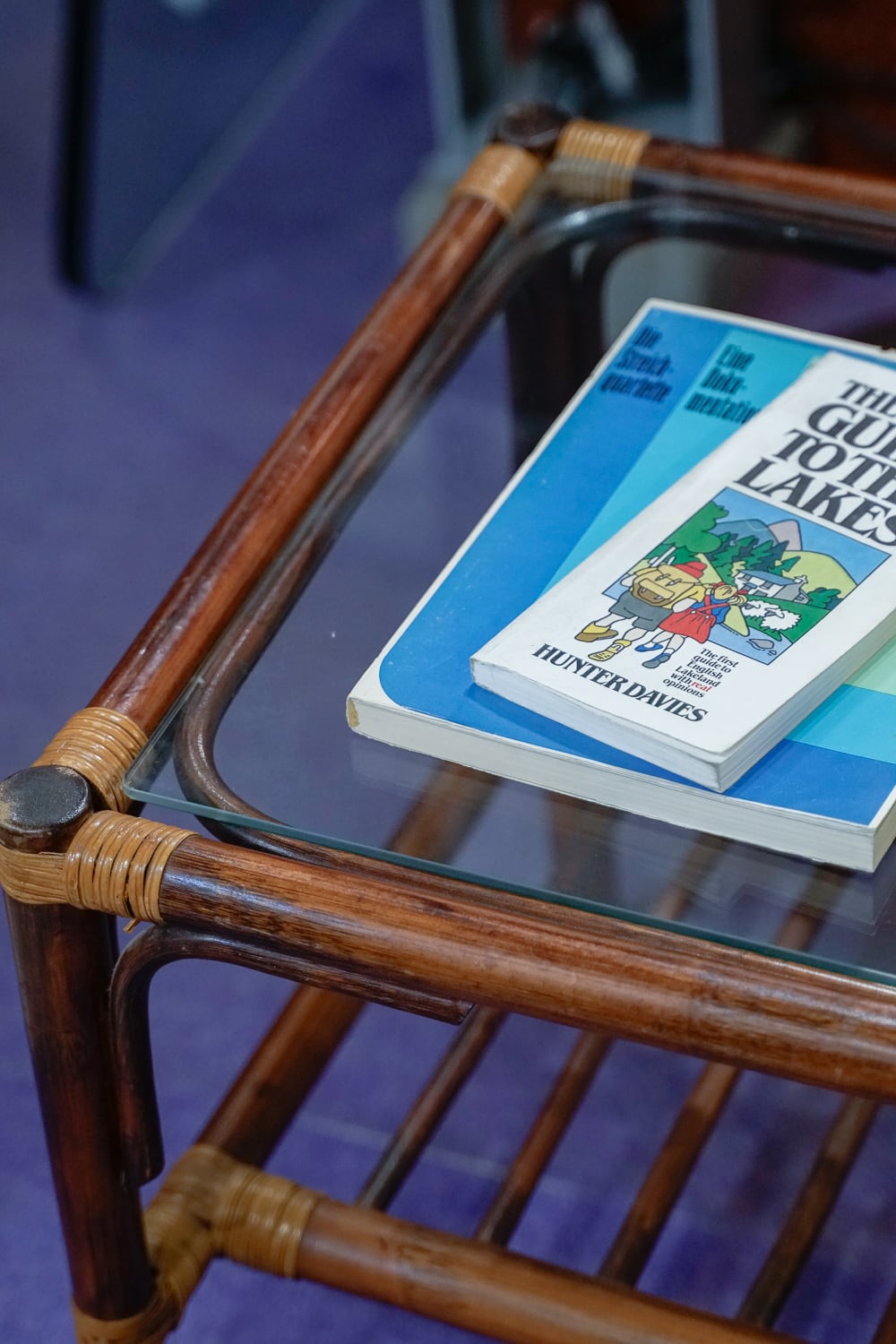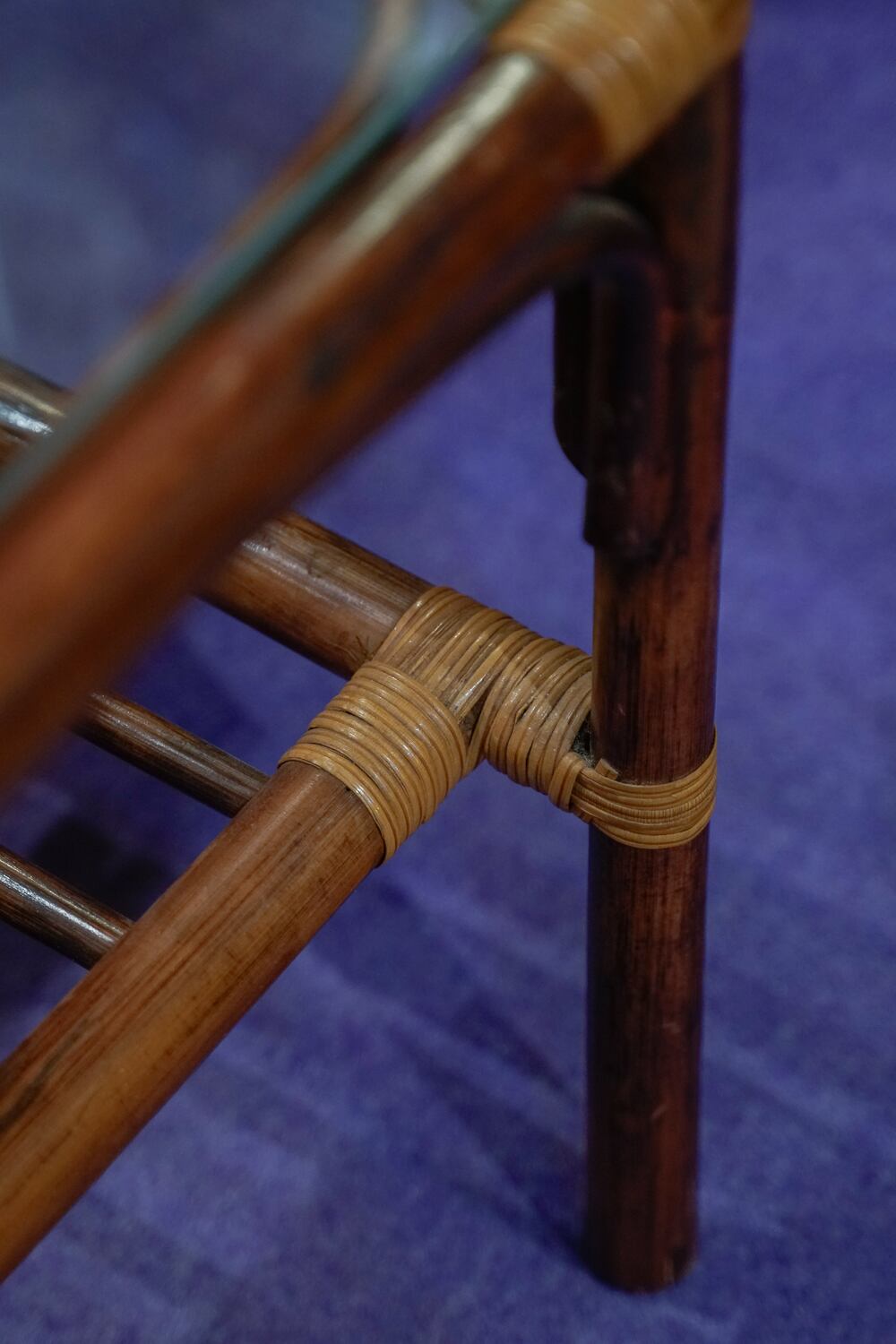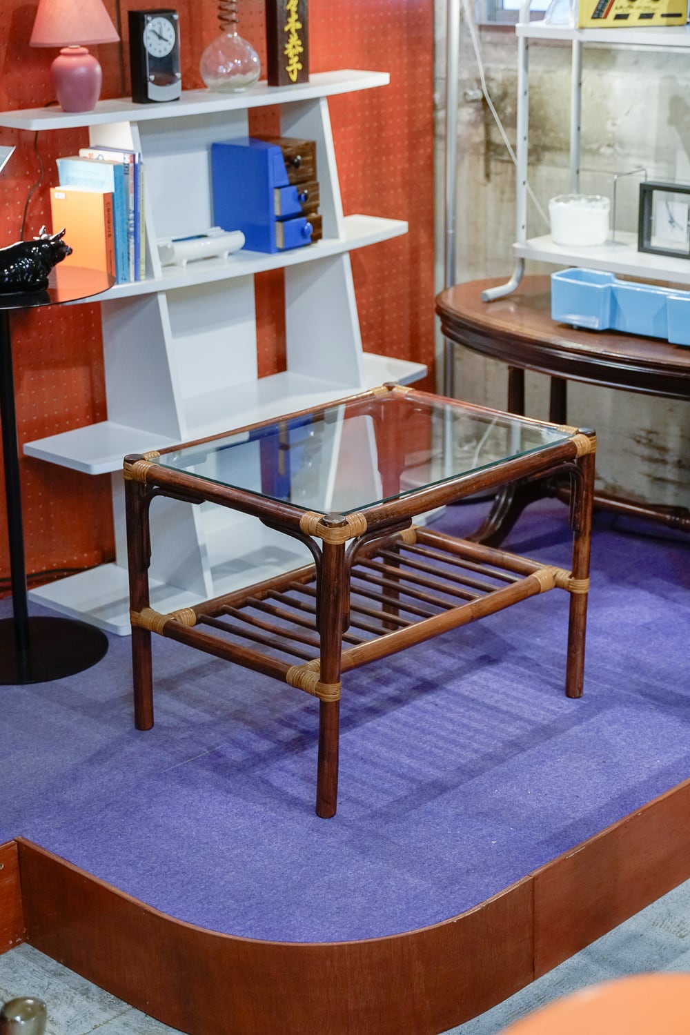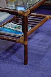 ラタン製のテーブル。ラタンの色が濃いブラウンで、締まって見えます。テーブルとしては手軽なサイズ感なので、ソファの横なんかに置いたらちょうどよさそう。(それがサイドテーブルっていうのか)