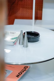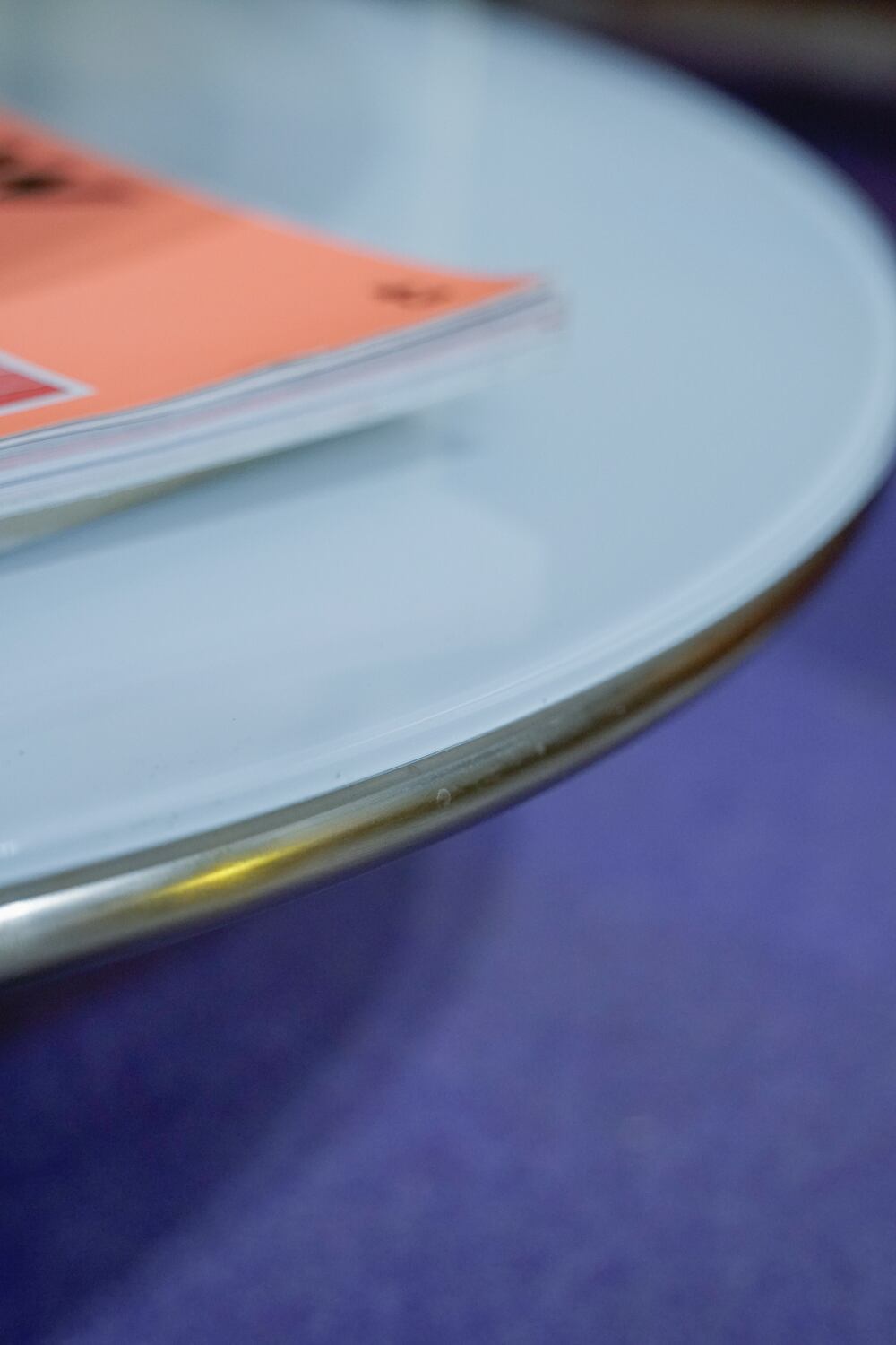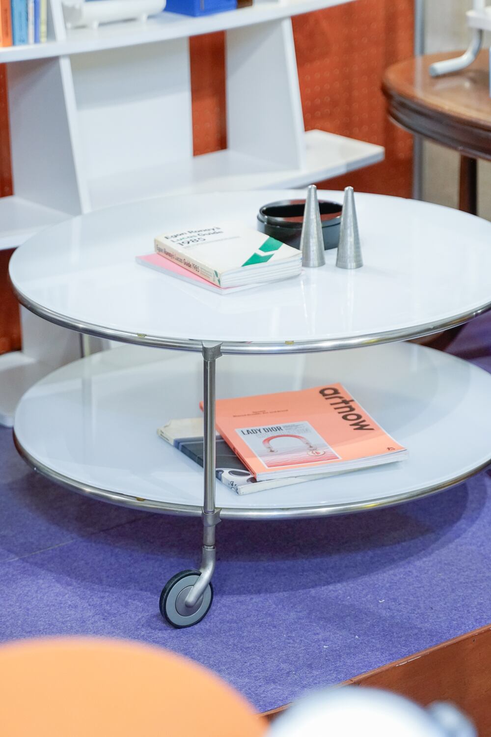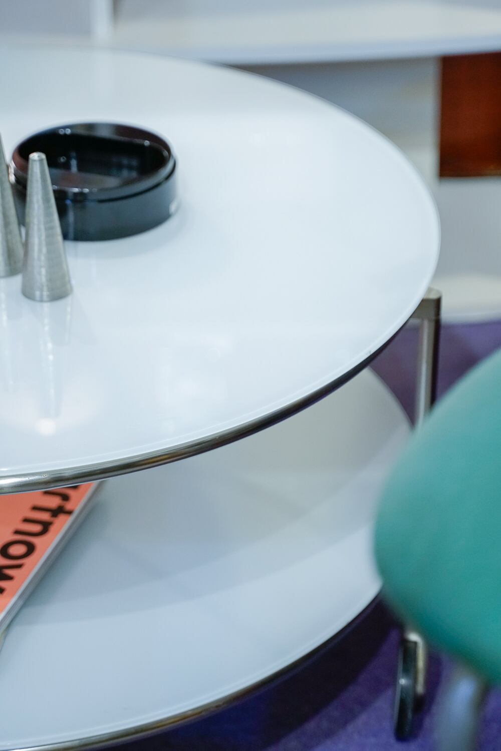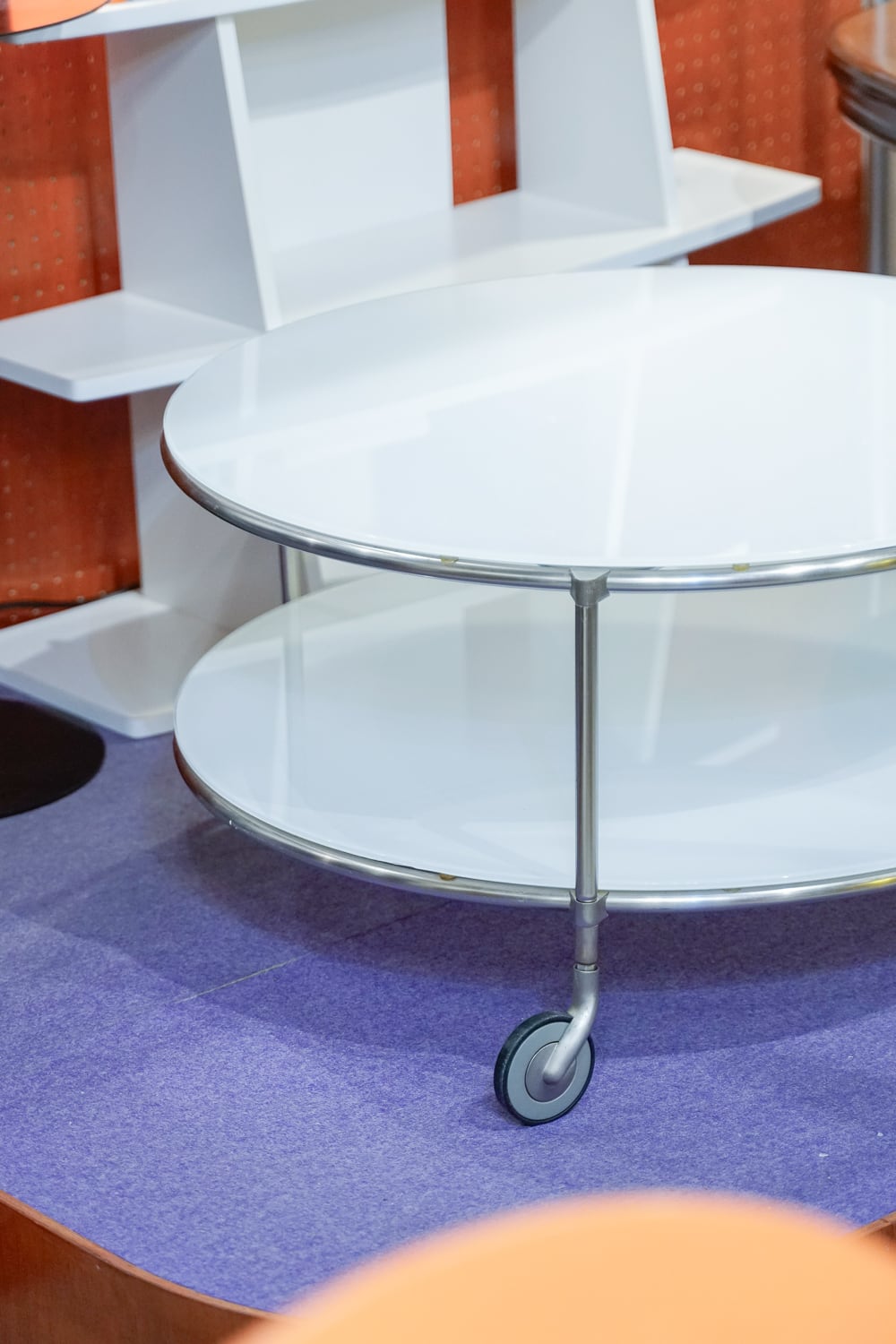 90sオールドIKEAのキャスターつきテーブルです。キャスターはイタリア製の高級家具などに使われるogTMキャスターが使われているのだとか。まんまるの乳白色のガラス天板がかっこいい。