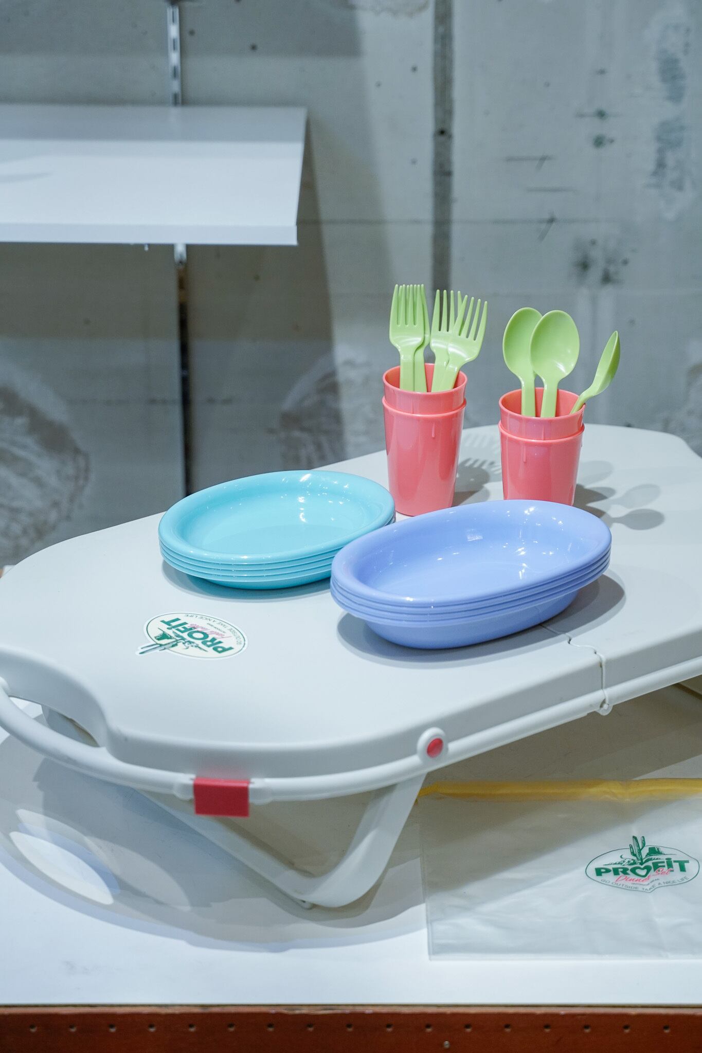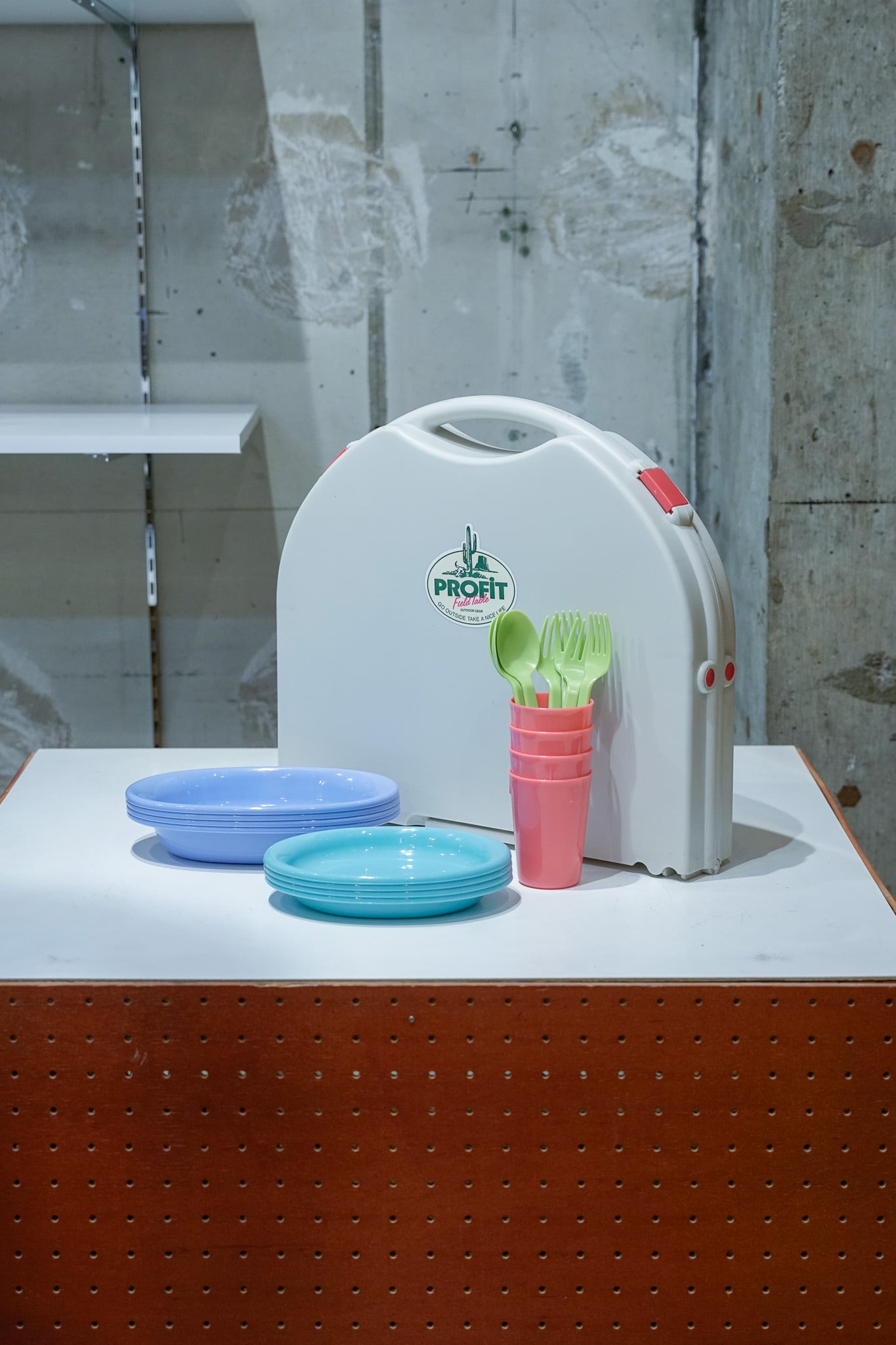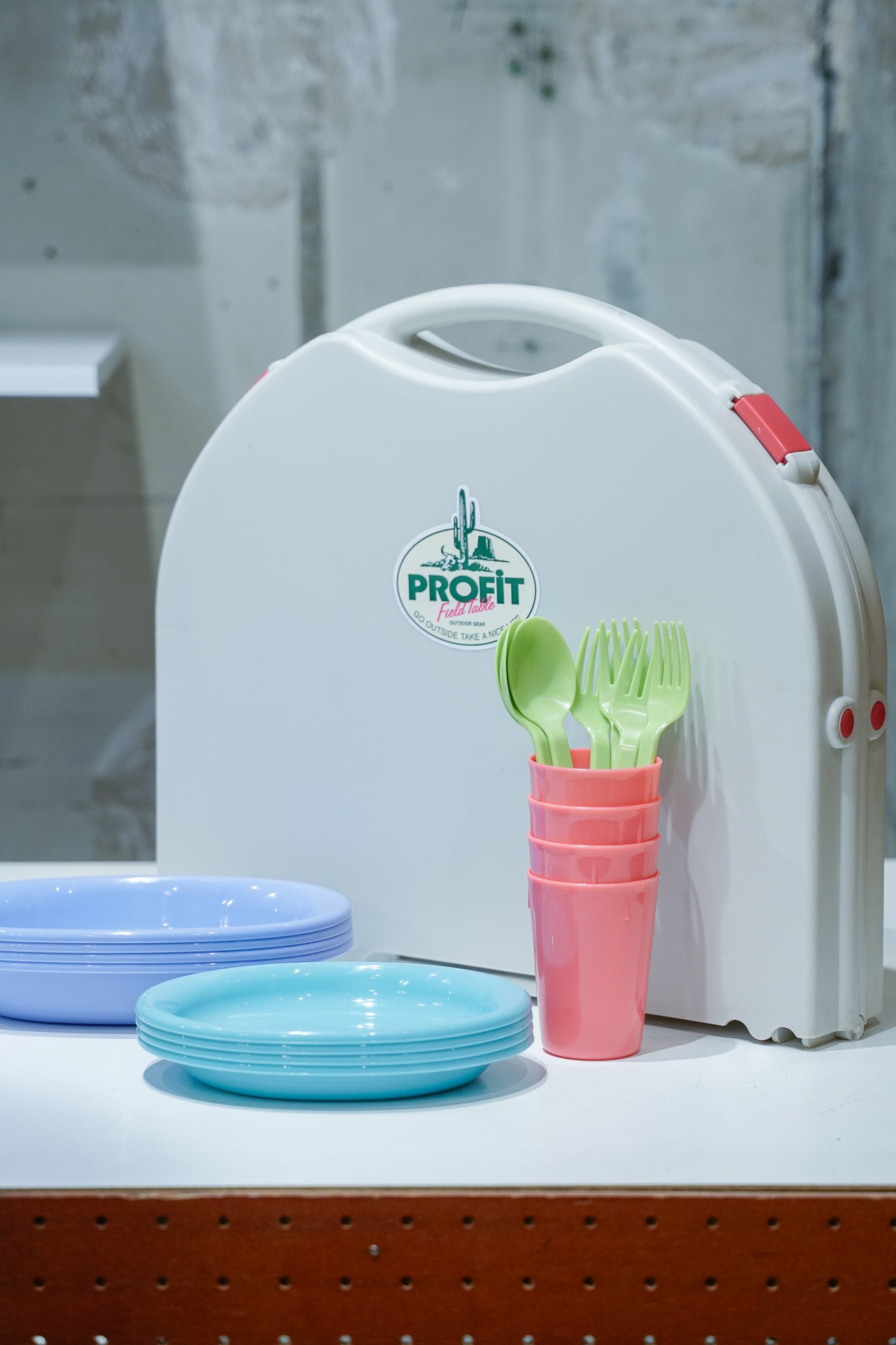 パカリと開けるとパステルカラーのカトラリーセットが出てきます。ケースに内蔵されている脚をセットして、天板を固定するパーツを取り付ければ、高さは低いものの簡易なテーブルに早替わり。