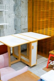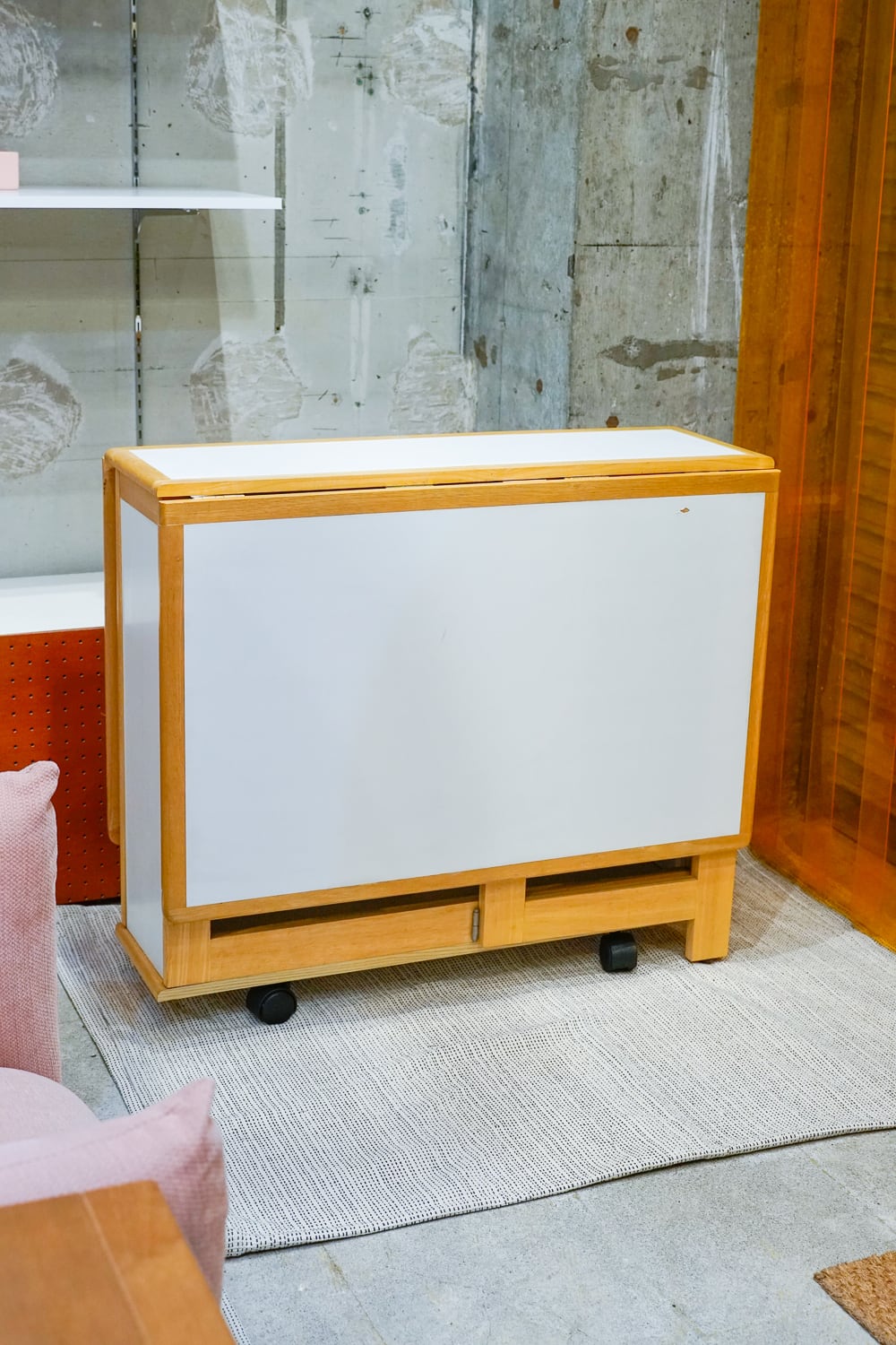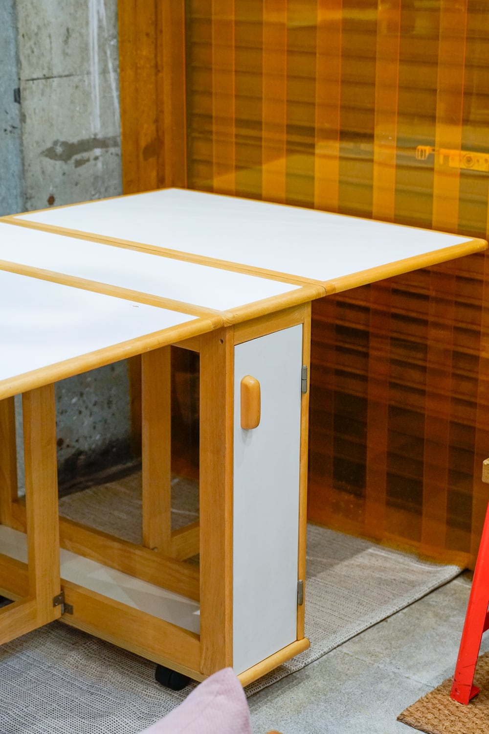 折り畳みできるテーブルです!畳んでる時は結構小さいのに、広げるとだいぶ大きく使えます!(当たり前)片側だけ天板を広げて使うこともできるので、人数に合わせて調整も可能。さらにキャスター付きなので、使わない時は畳んで部屋の隅に置いておくなんてこともできます。