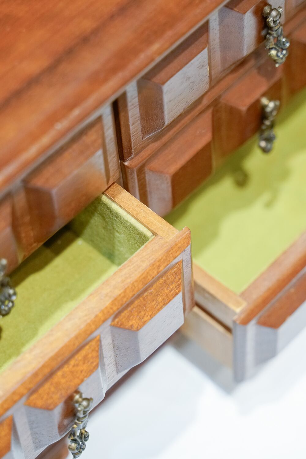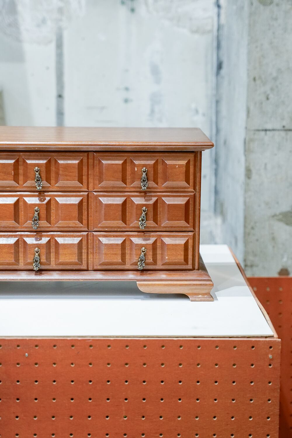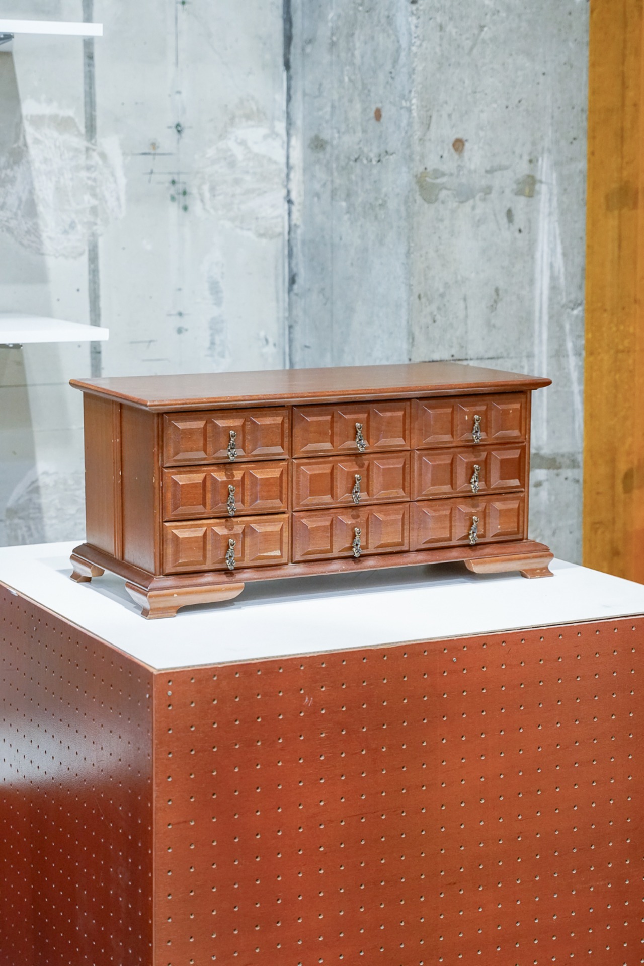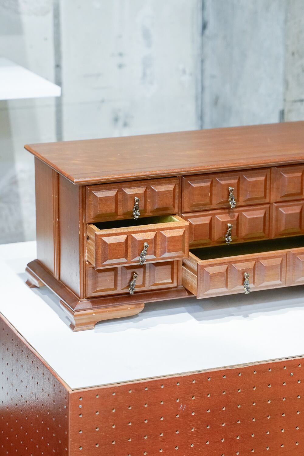 板チョコみたいな建築みたいな、両手で持てるサイズ感の引き出しです。つまみは1段に3つ付いていますが、引き出せるのは1段につき2箱です。説明難しい!!