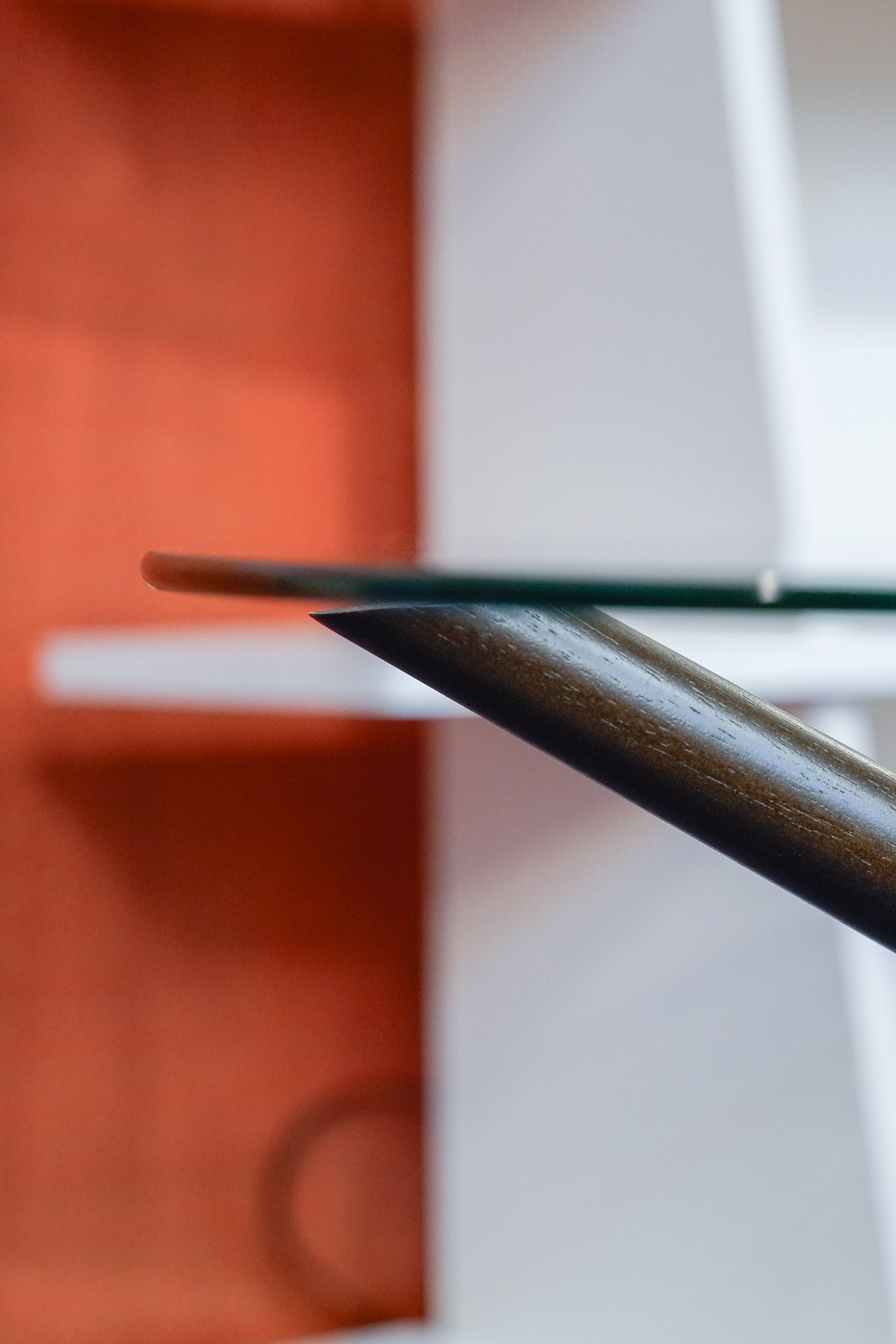 クロスした三本脚と、しっかりめなガラスの天板で構成されています。