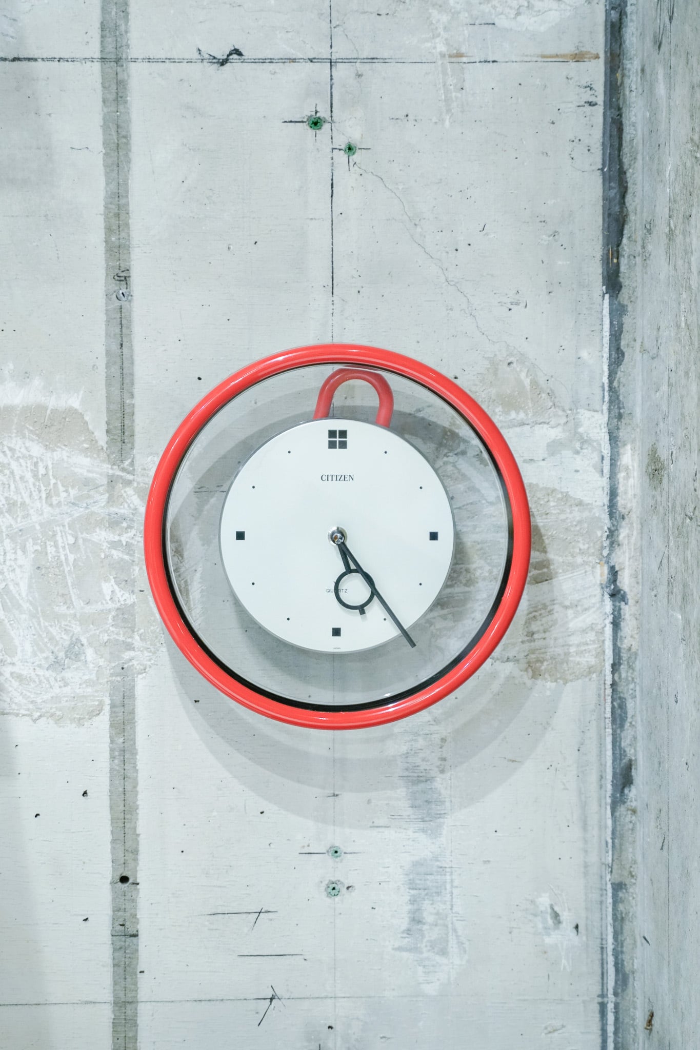クリアな文字盤に赤い枠がついた掛け時計です。