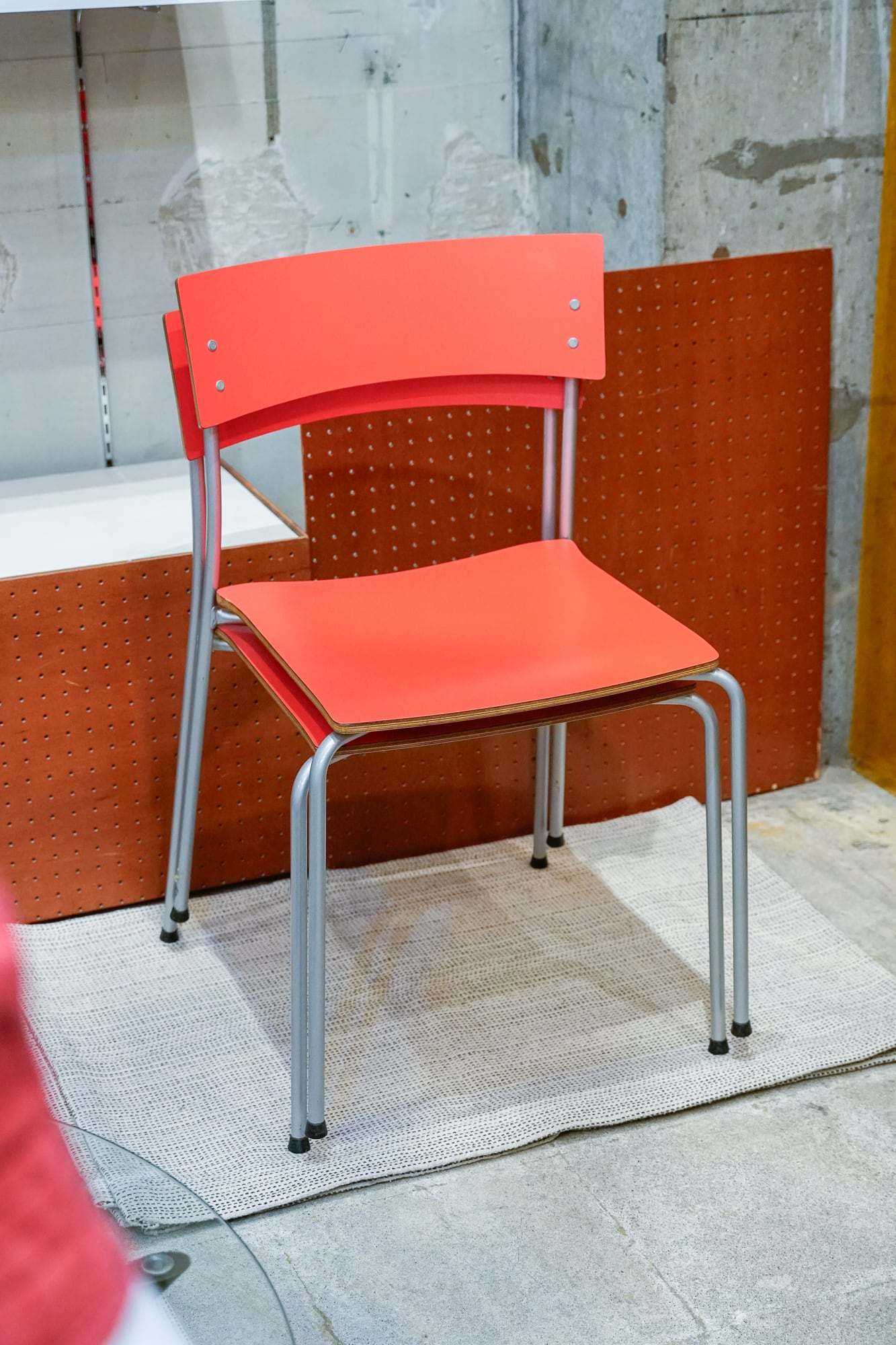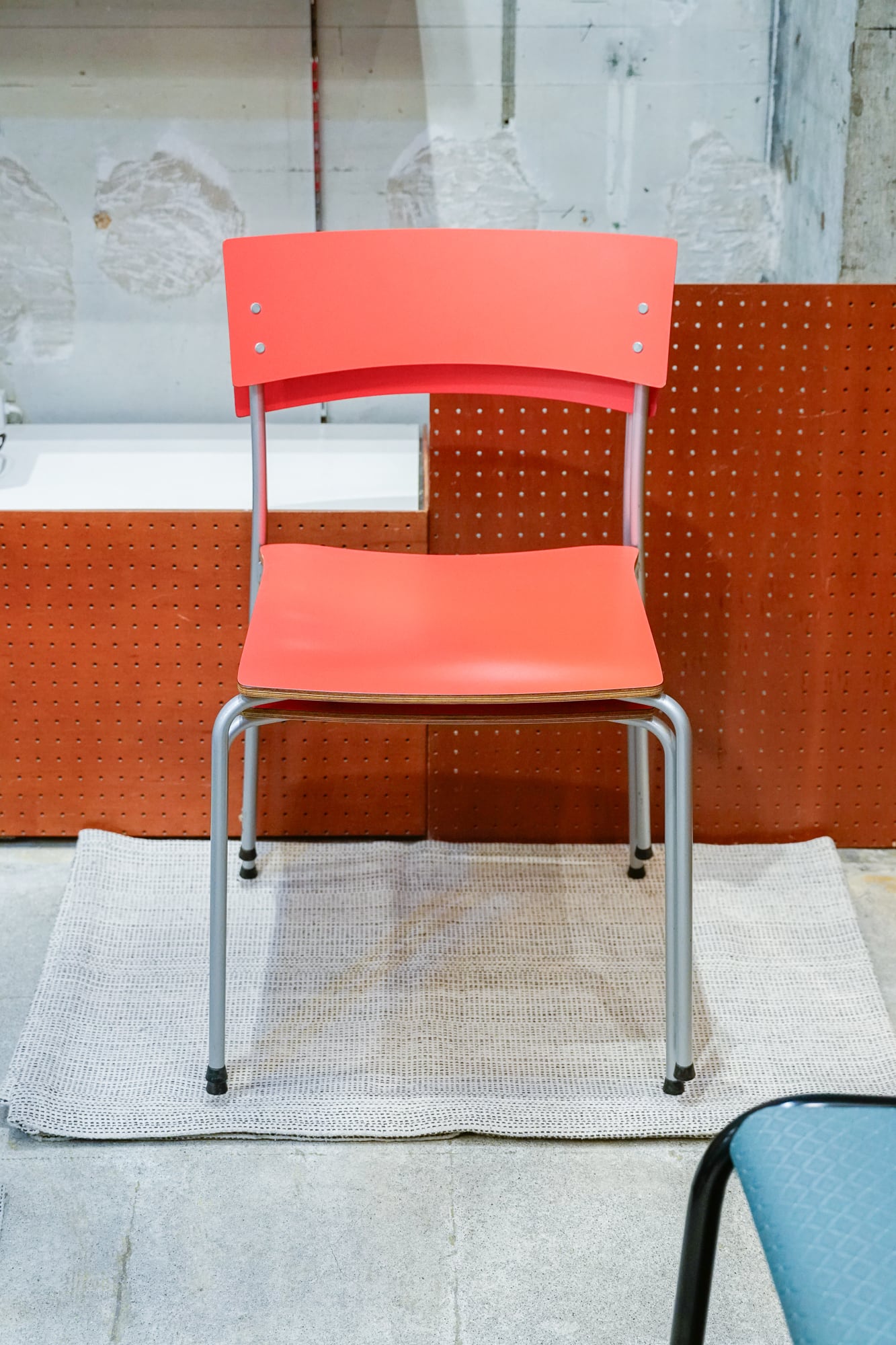 合板素材にパイプの脚。まるで学校の椅子みたいな組み合わせのチェアです。