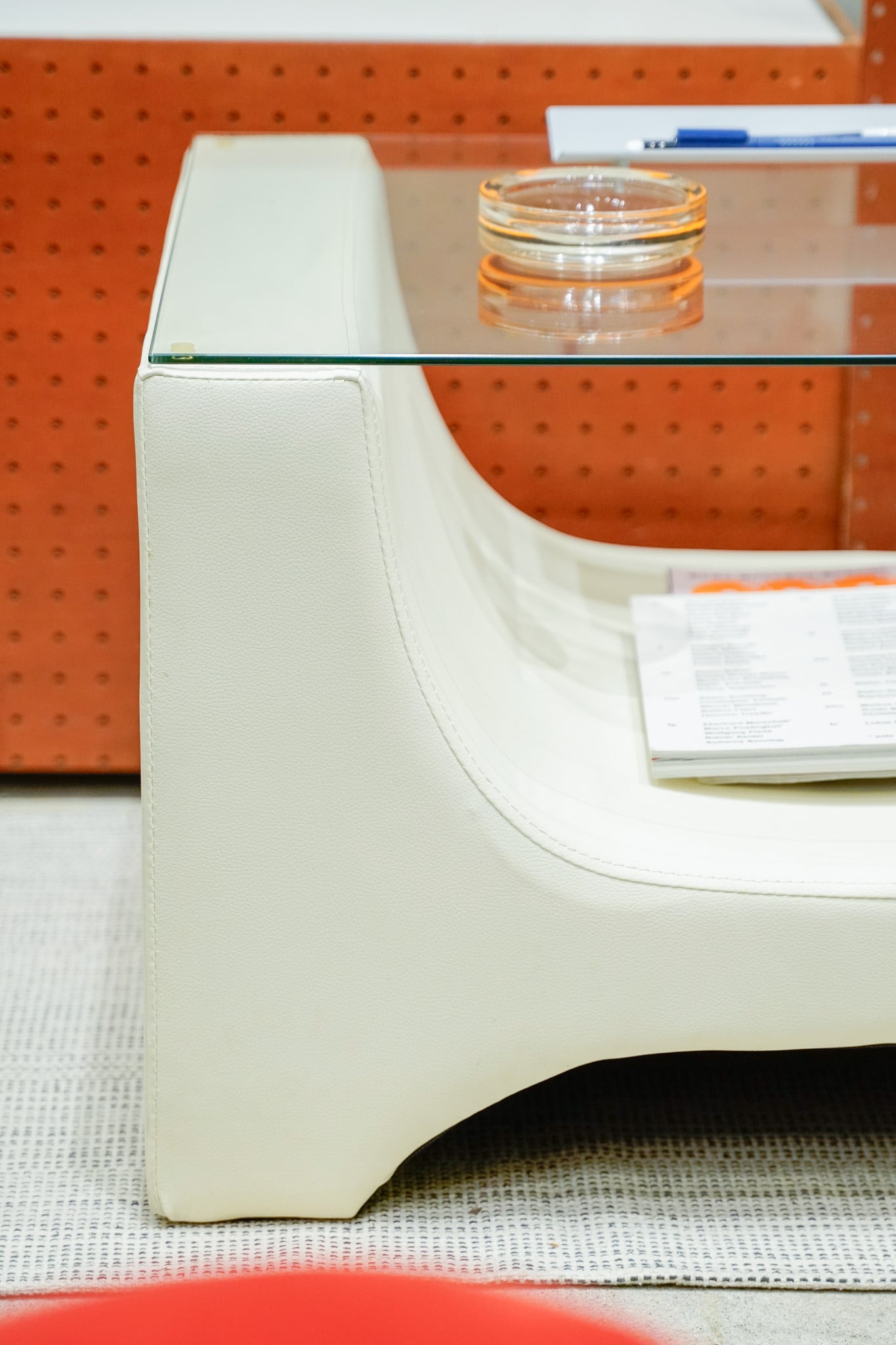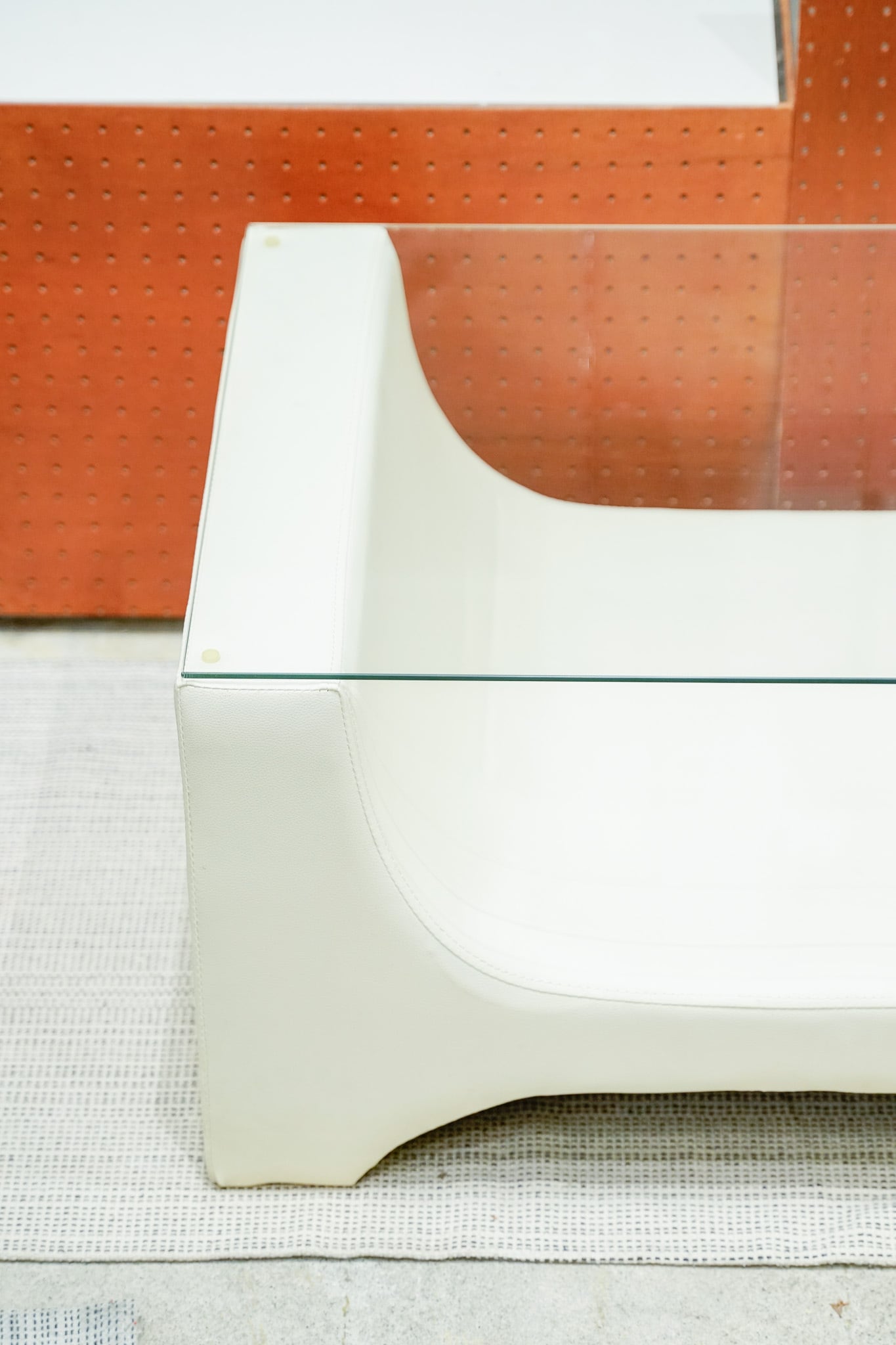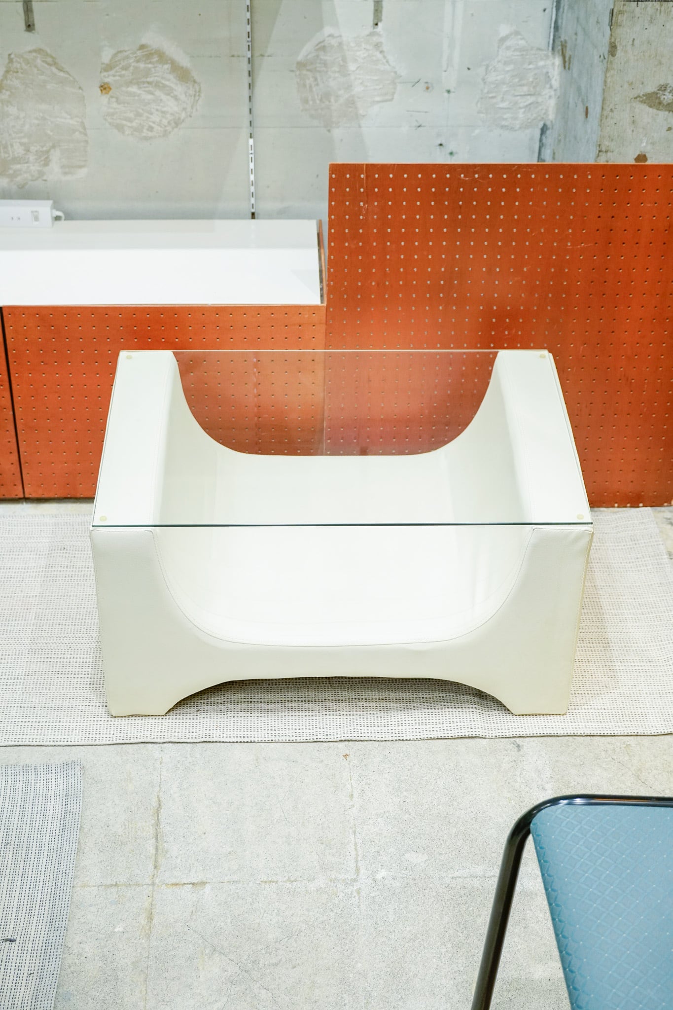 オフホワイトの合皮でできた土台にガラスが乗った、シンプルなセンターテーブルです。