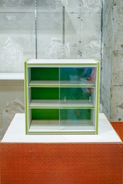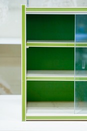 フロント部分に入っている緑のラインがよいアクセント。棚の背の部分(内側)も緑になっているので、置いたものの後ろが緑バックになります。(伝われ)