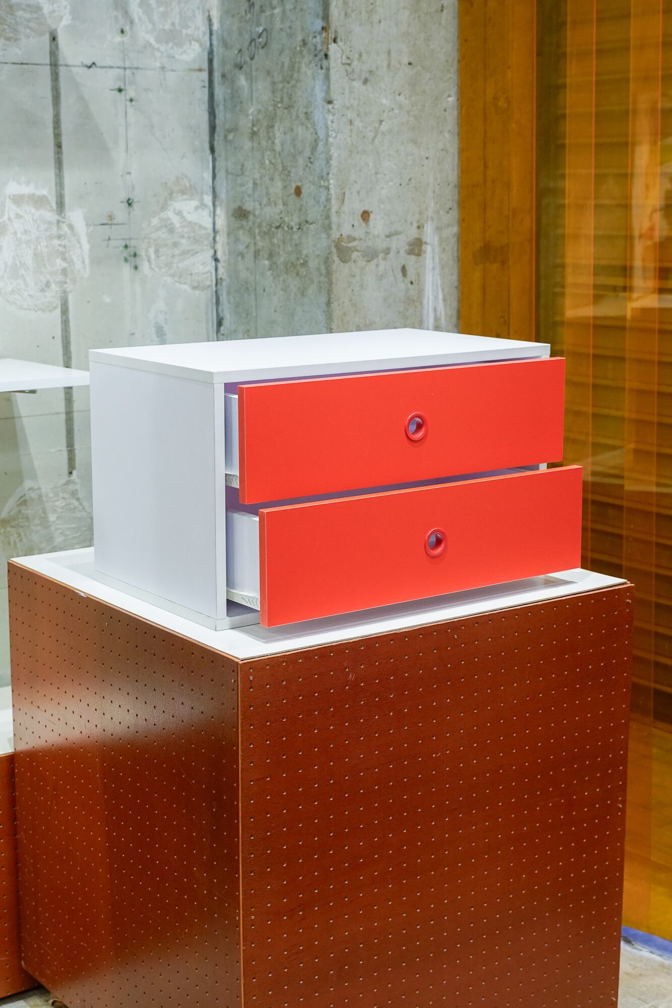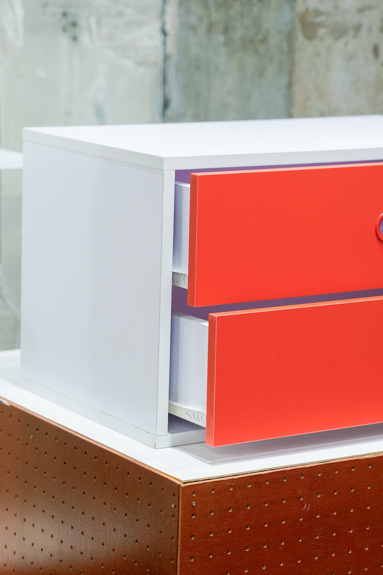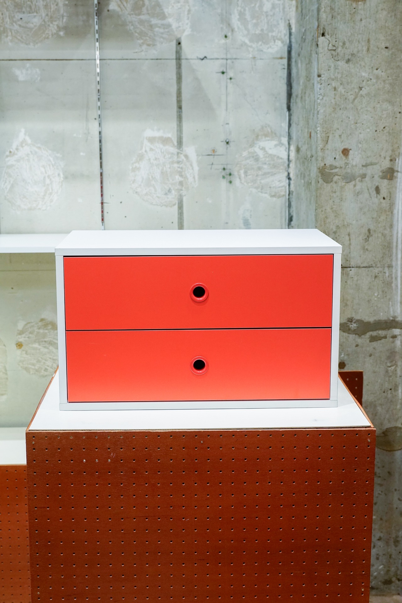 パッキリした紅白カラーと、引き出すところ(なんていえばいいの)の丸い穴がかわいい引き出し。おしゃれに言うならキャビネットです。