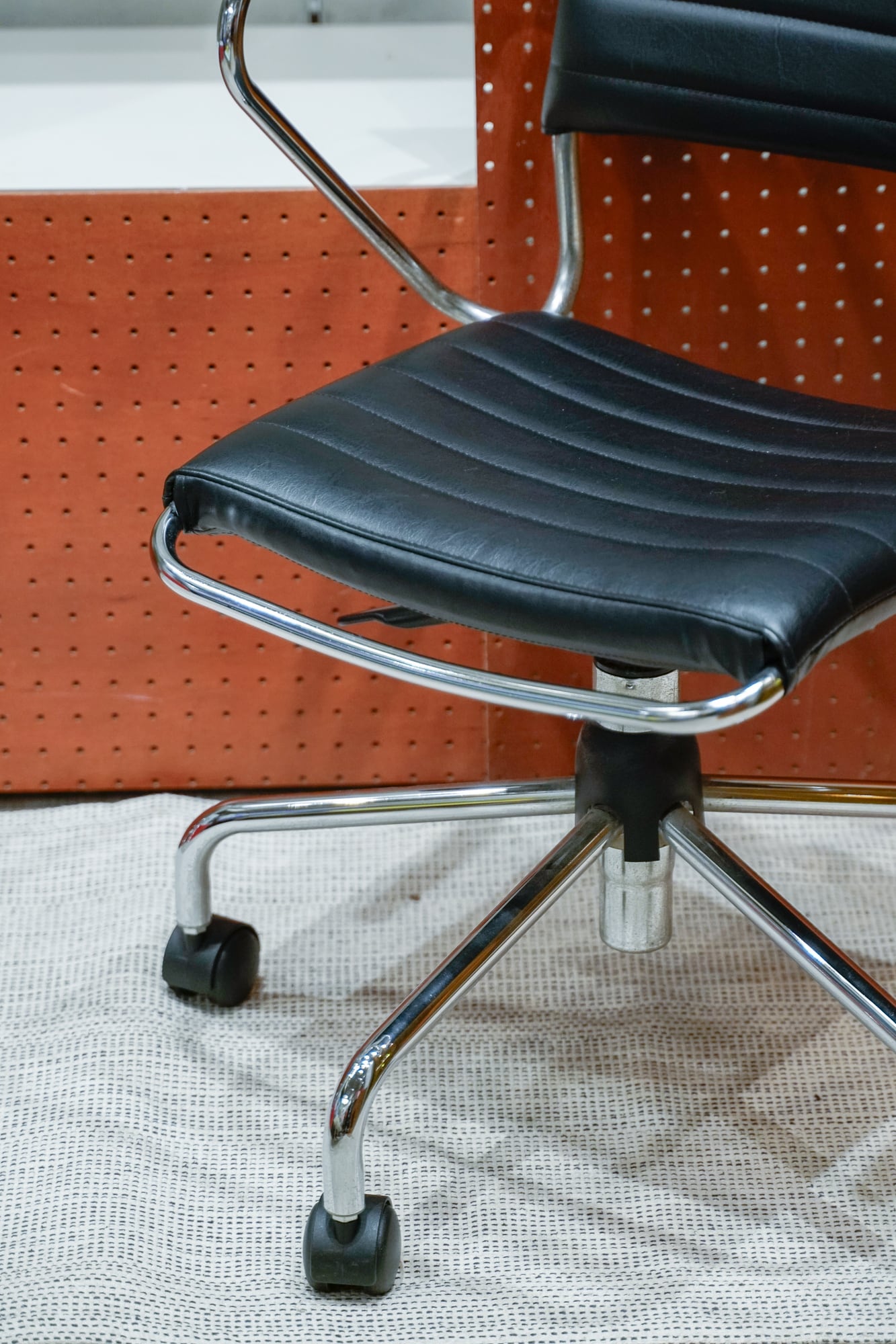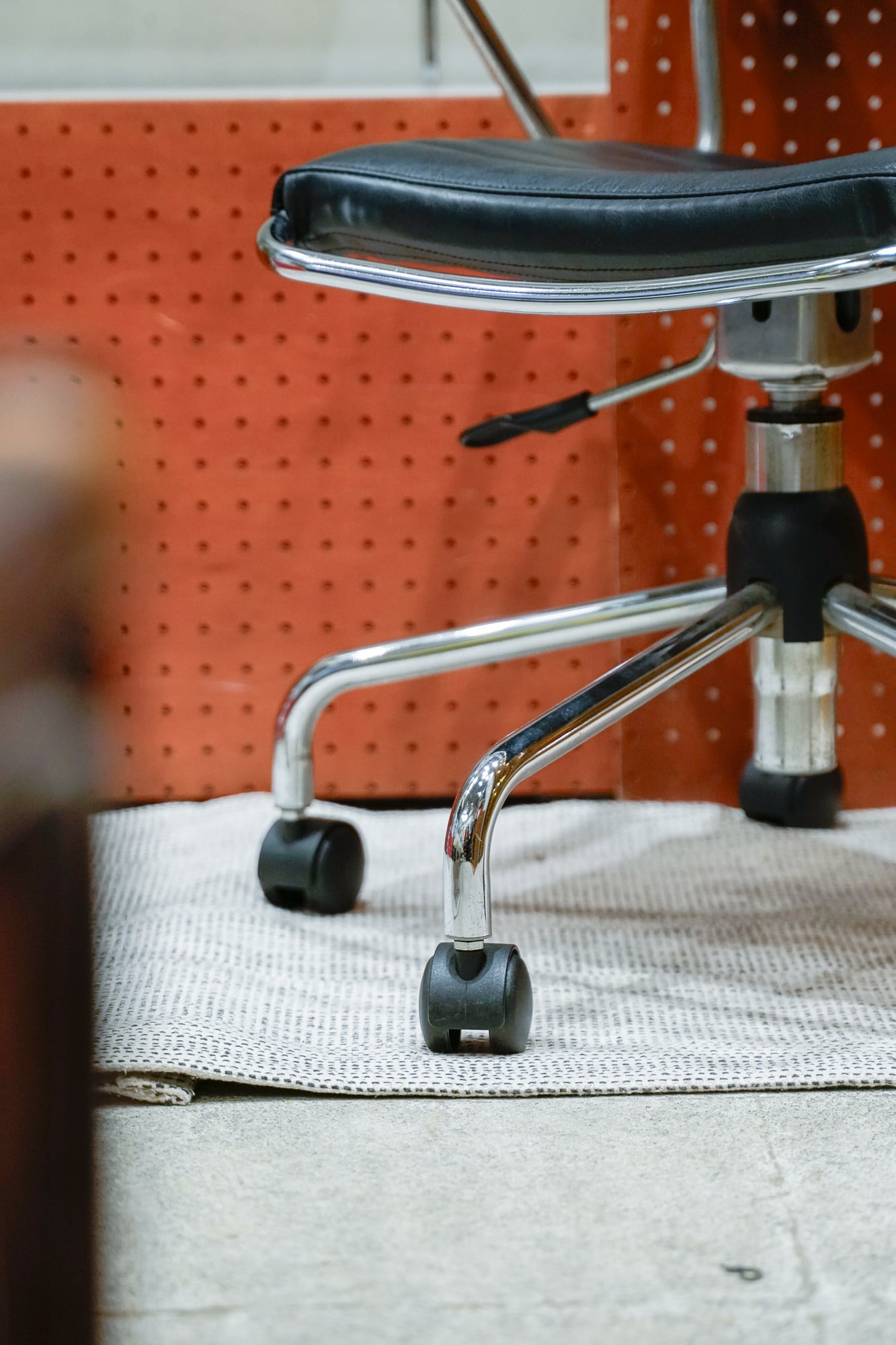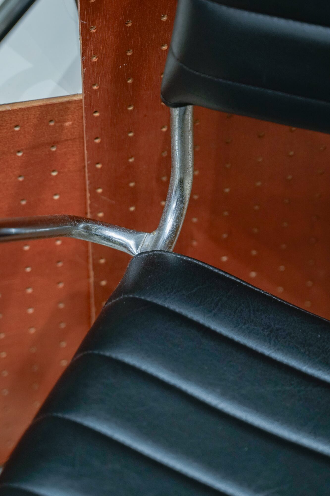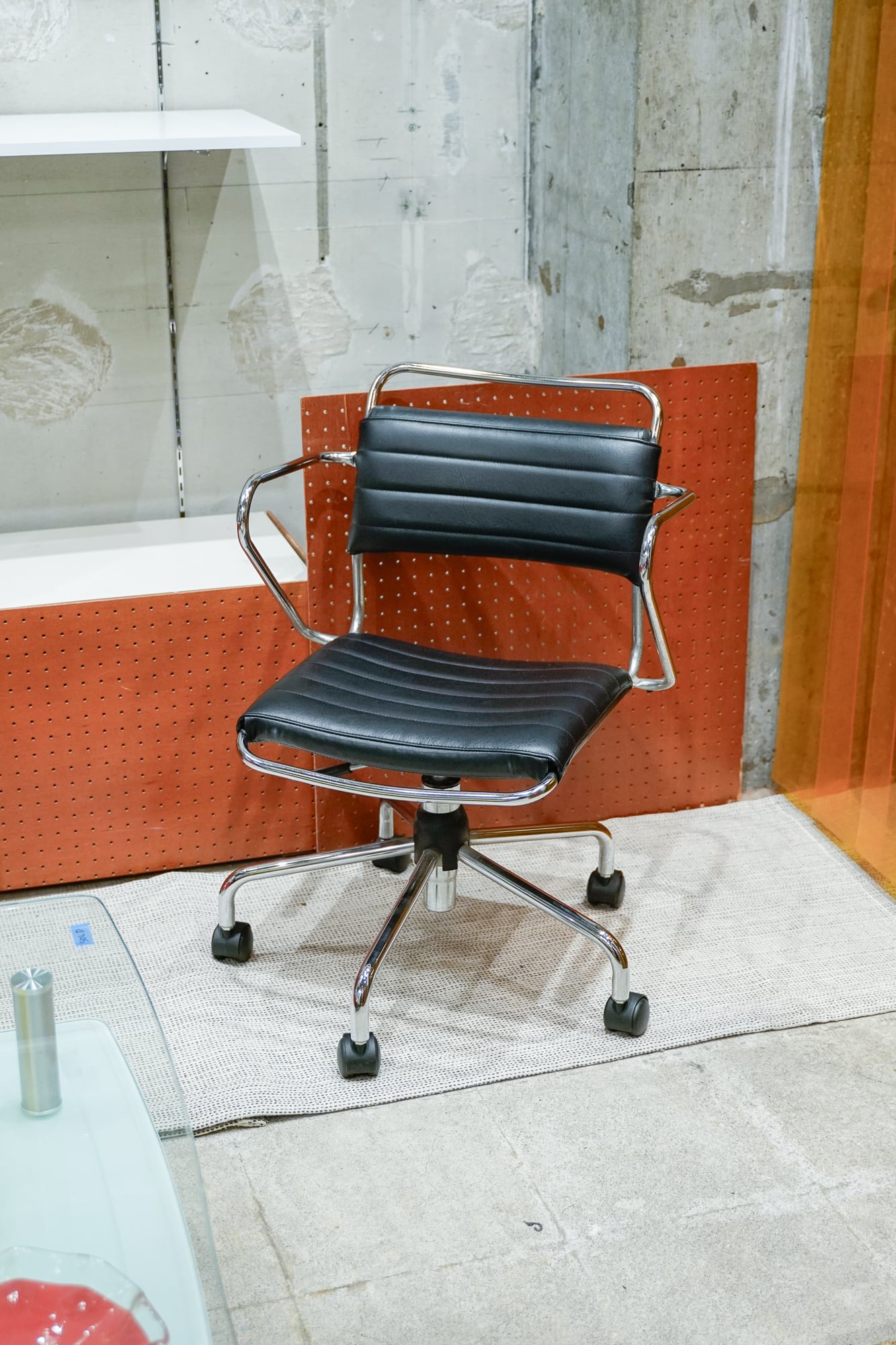 しっとりした黒の合皮とメタルの組み合わせ、かっこいいですね。肘掛けの曲線もよい雰囲気。