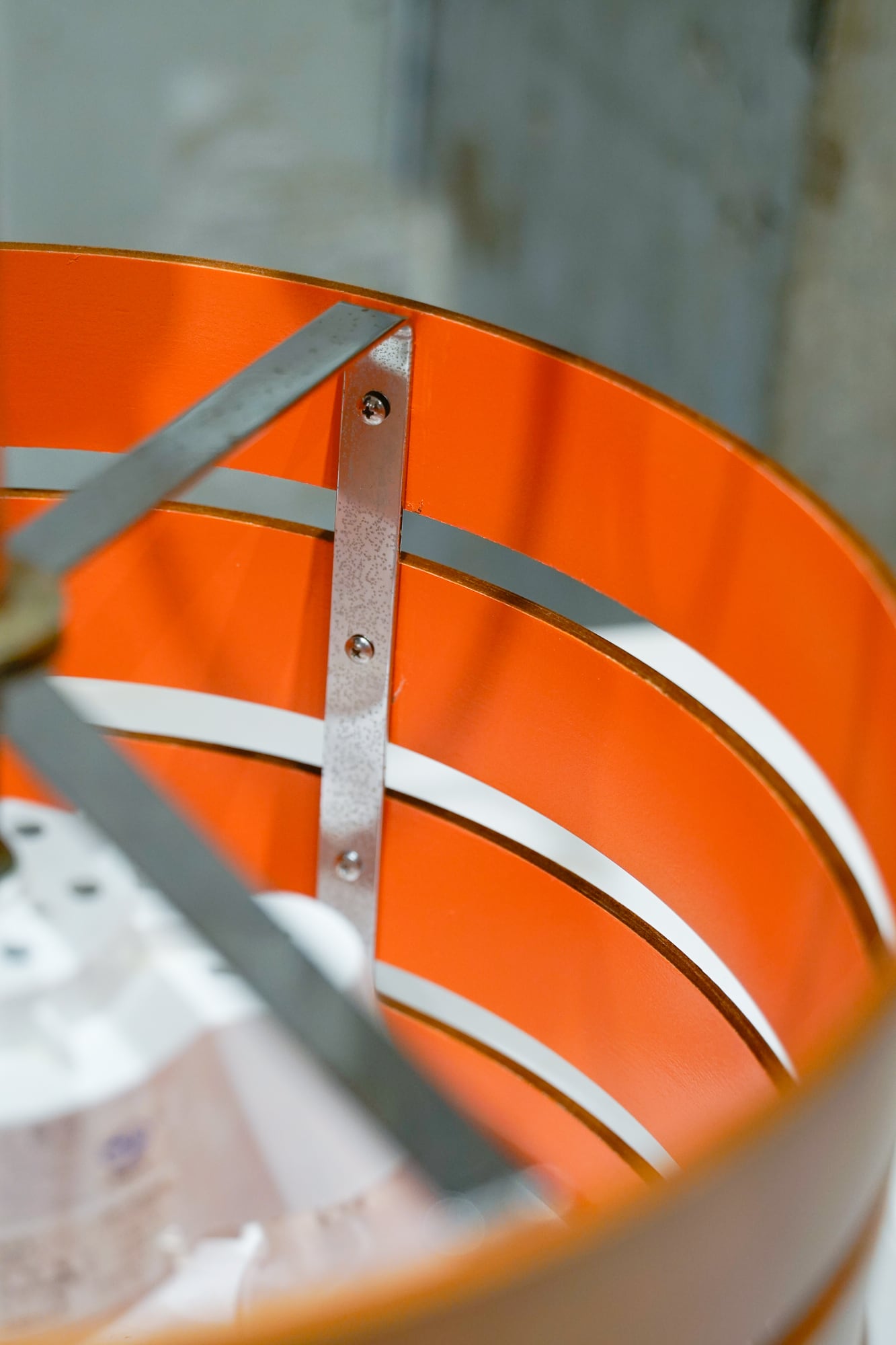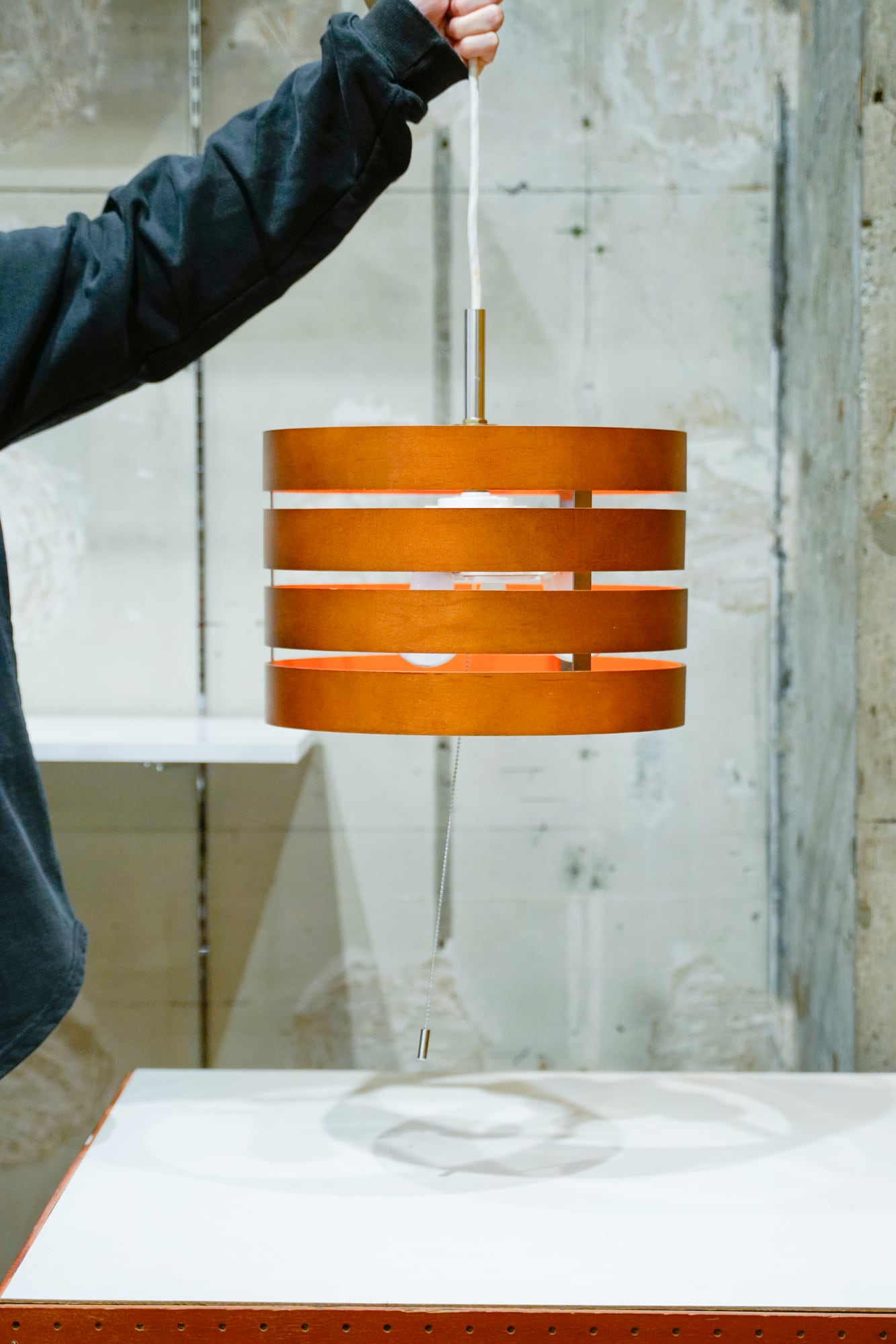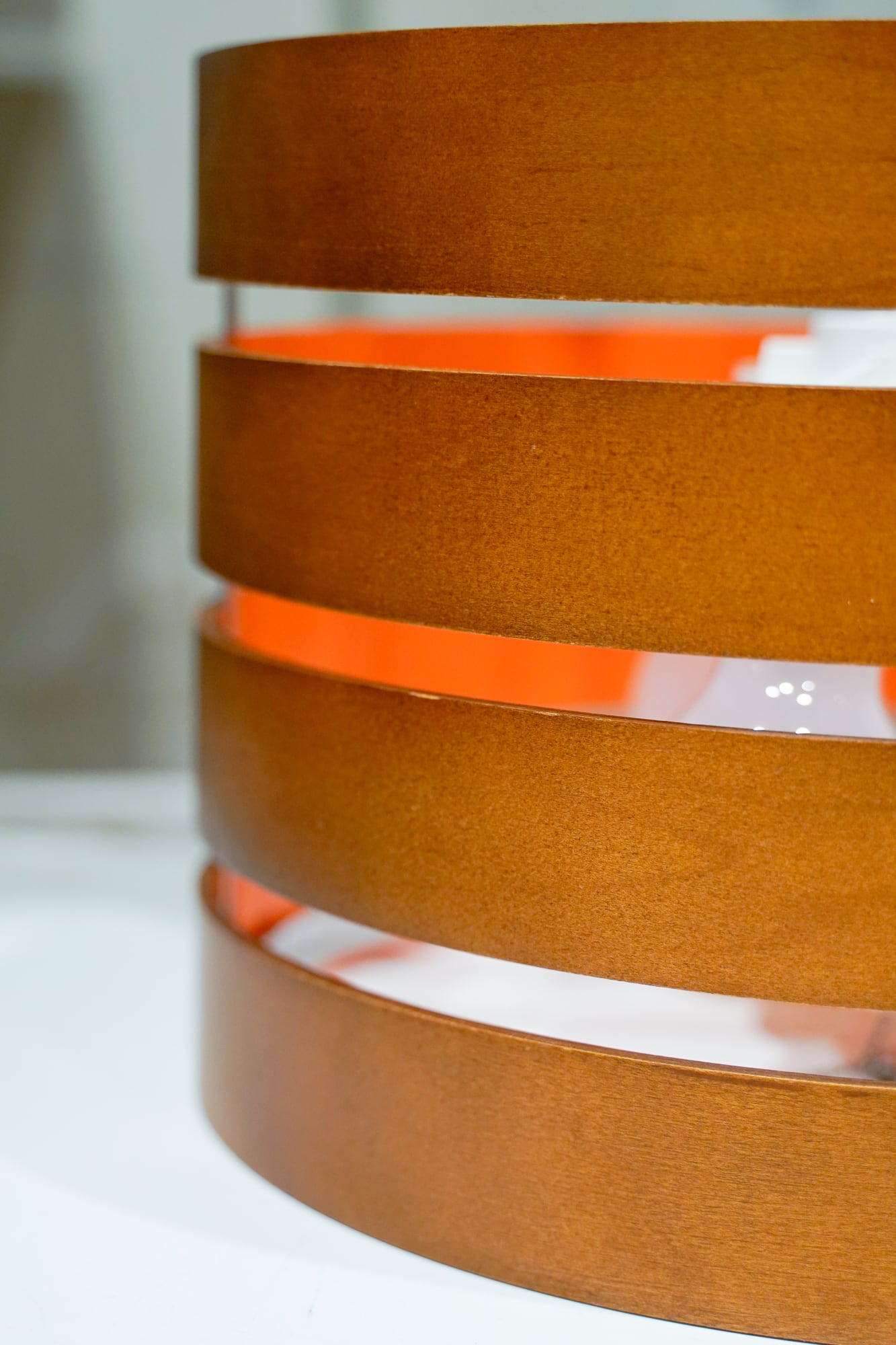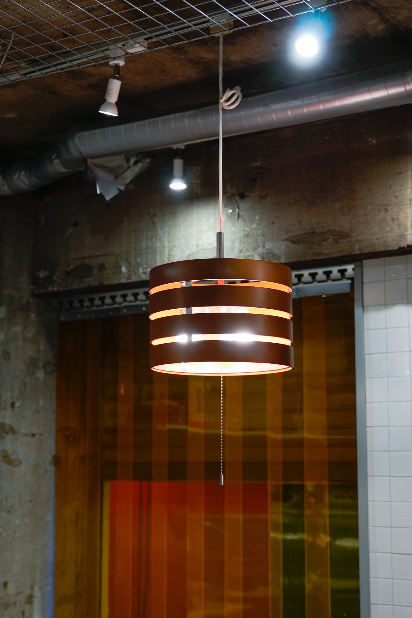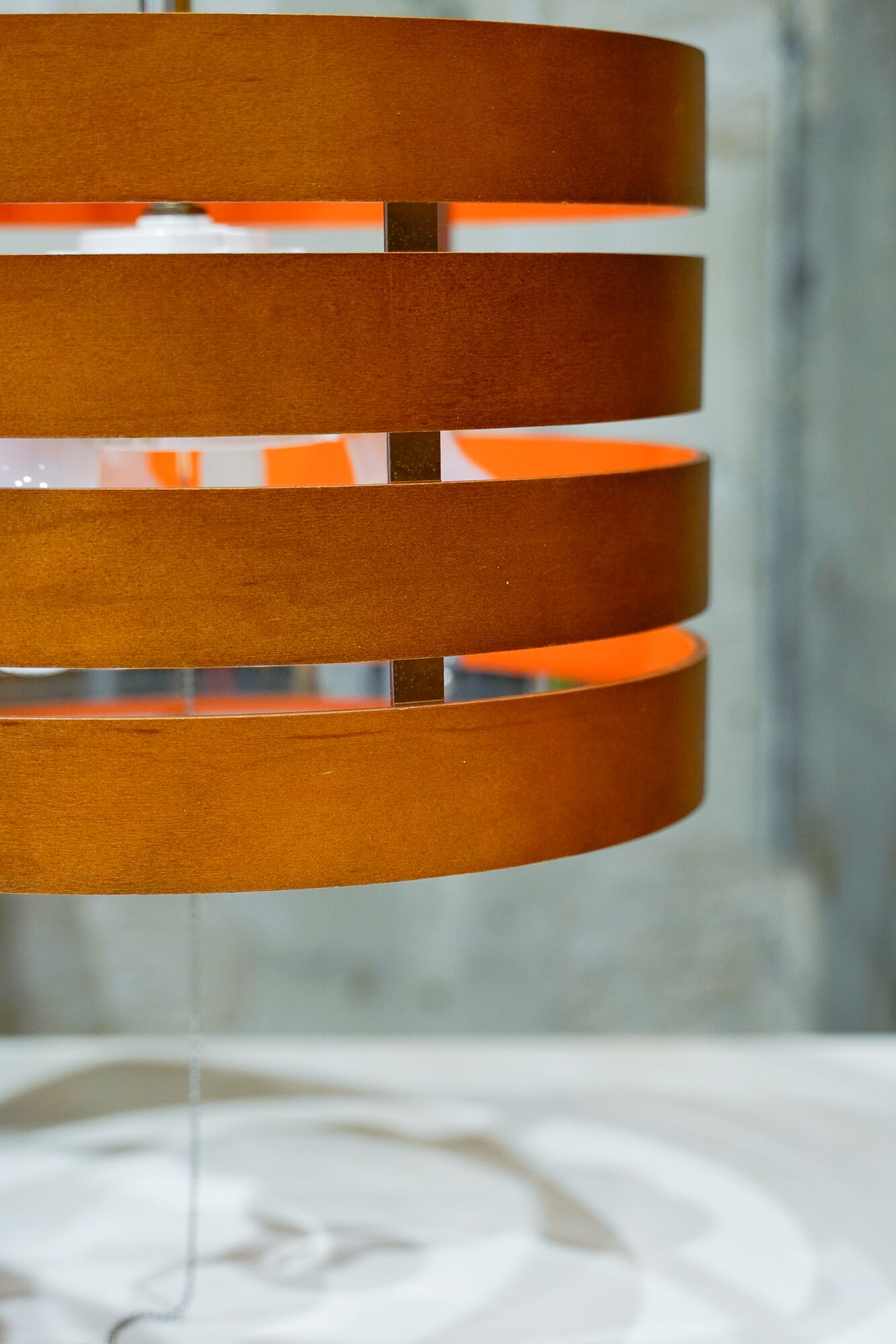 木製のリングが4層になった作りのペンダントライトです。もとは木製の無塗装だったものを、カラー塗装でHIIKI仕様に、ポップに仕上げてみました!