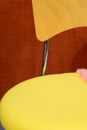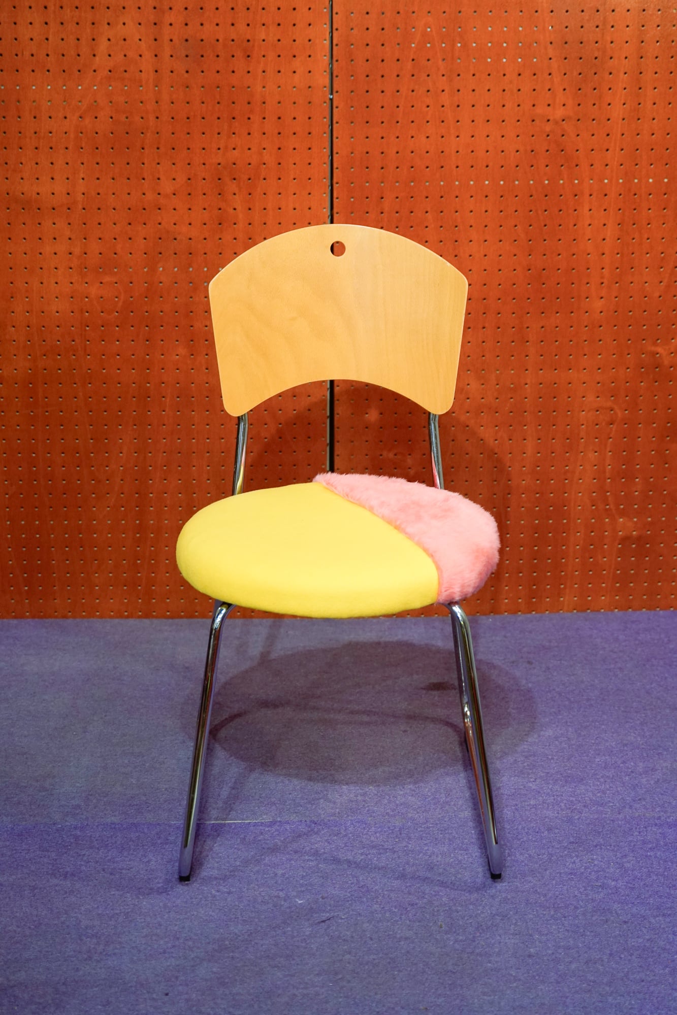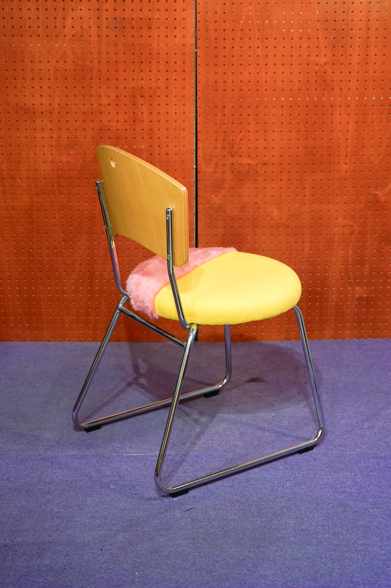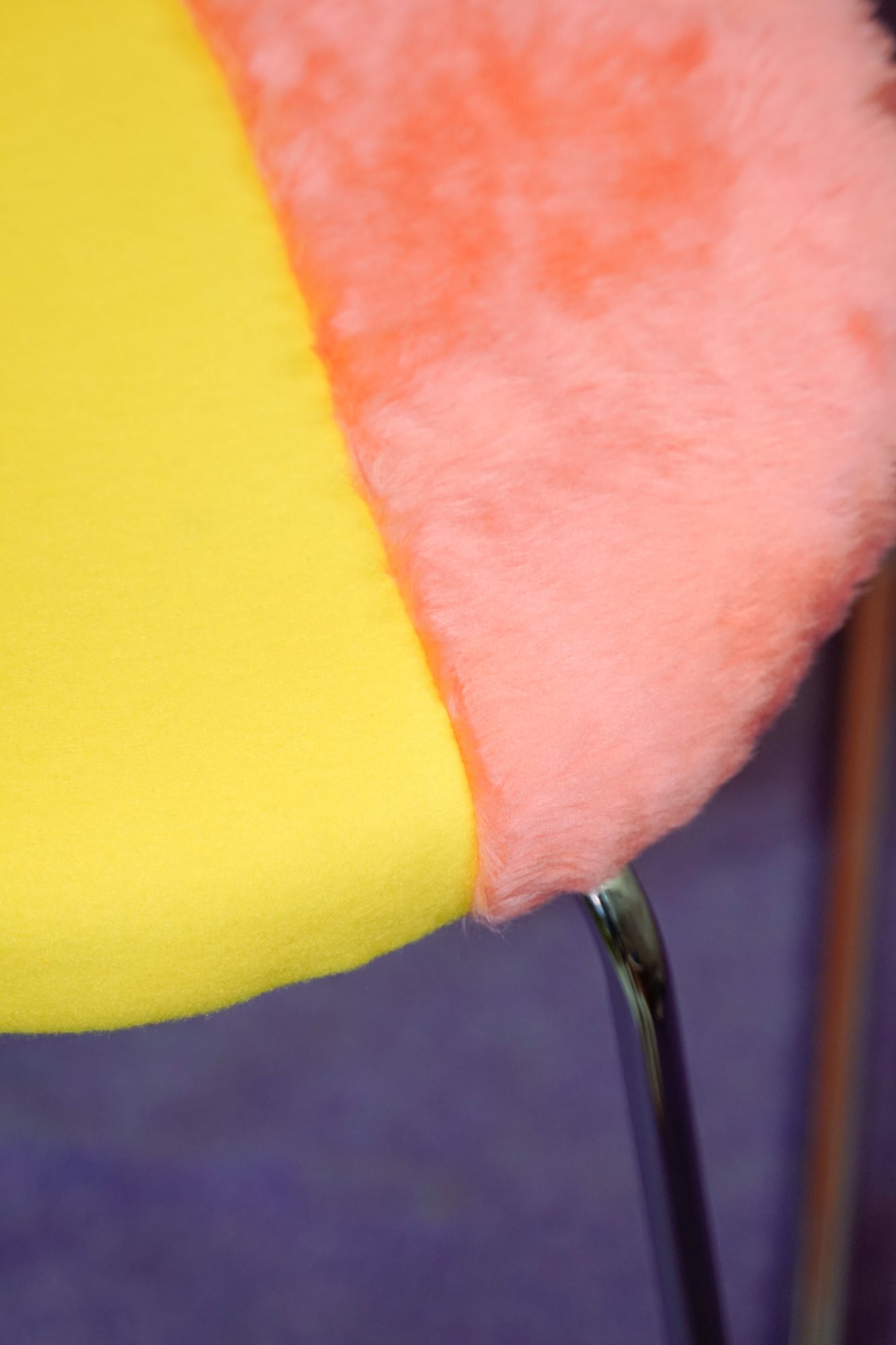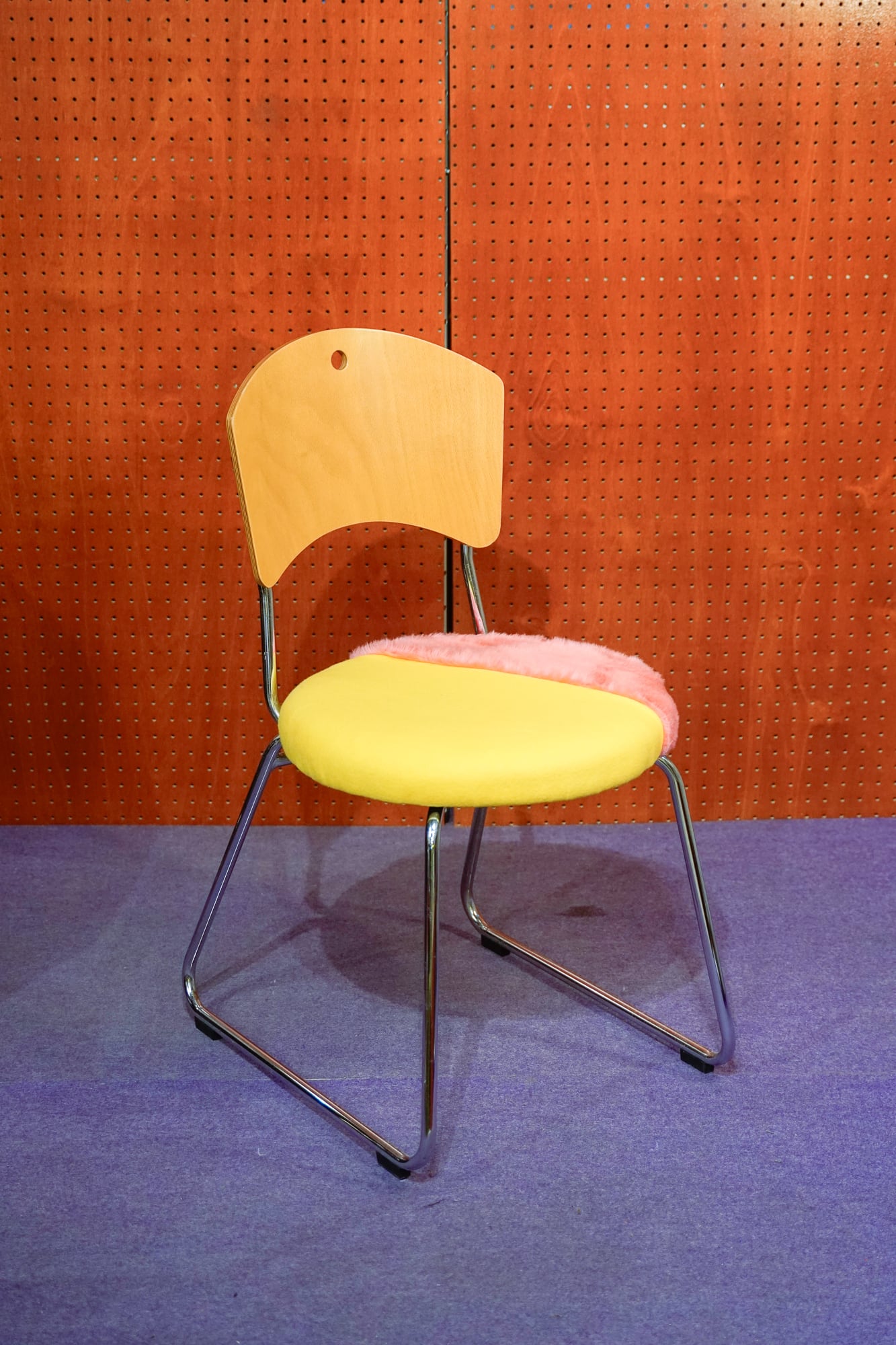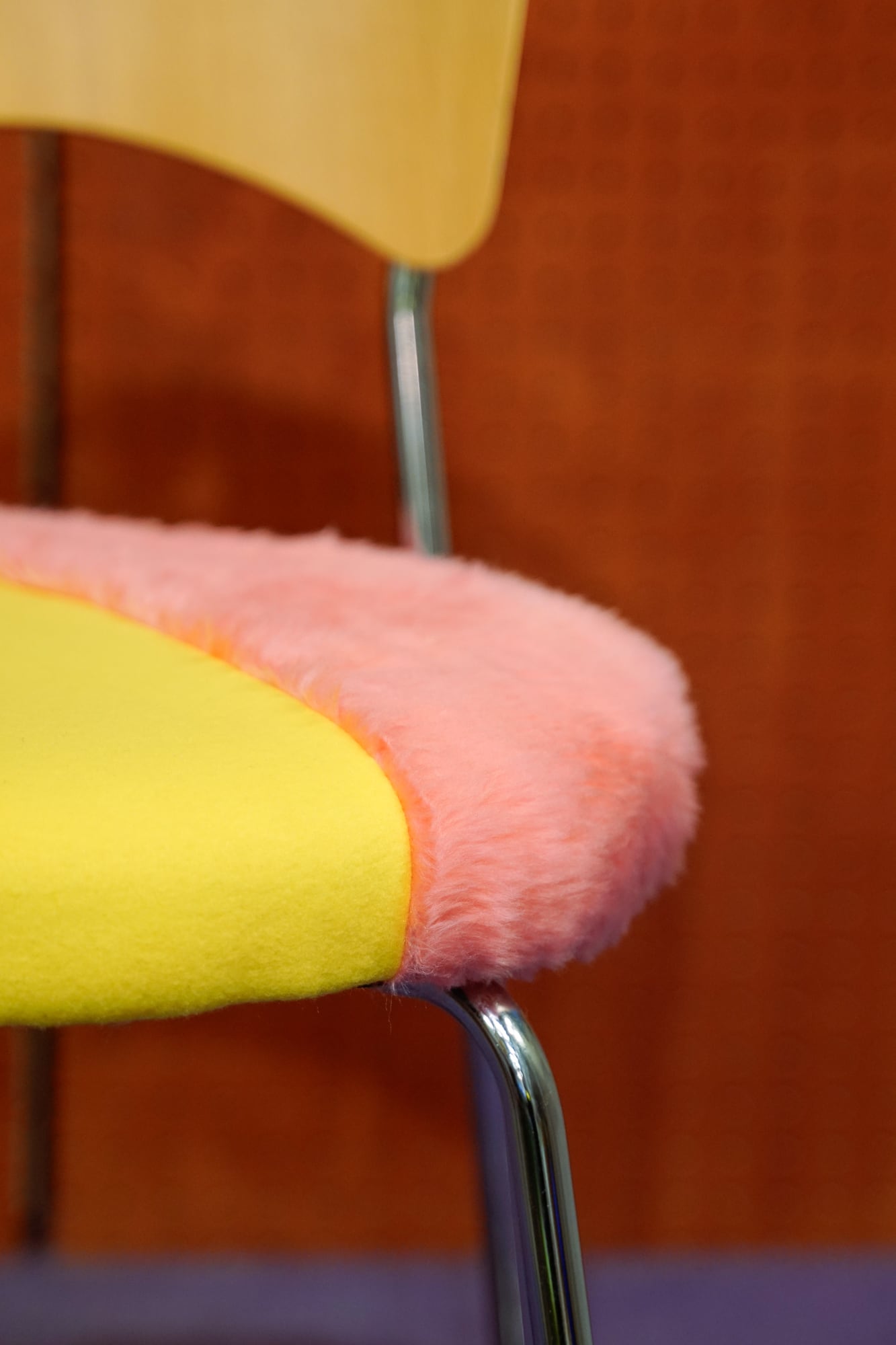 木の背もたれ、ピンクファー×黄色フリース生地の組み合わせ。