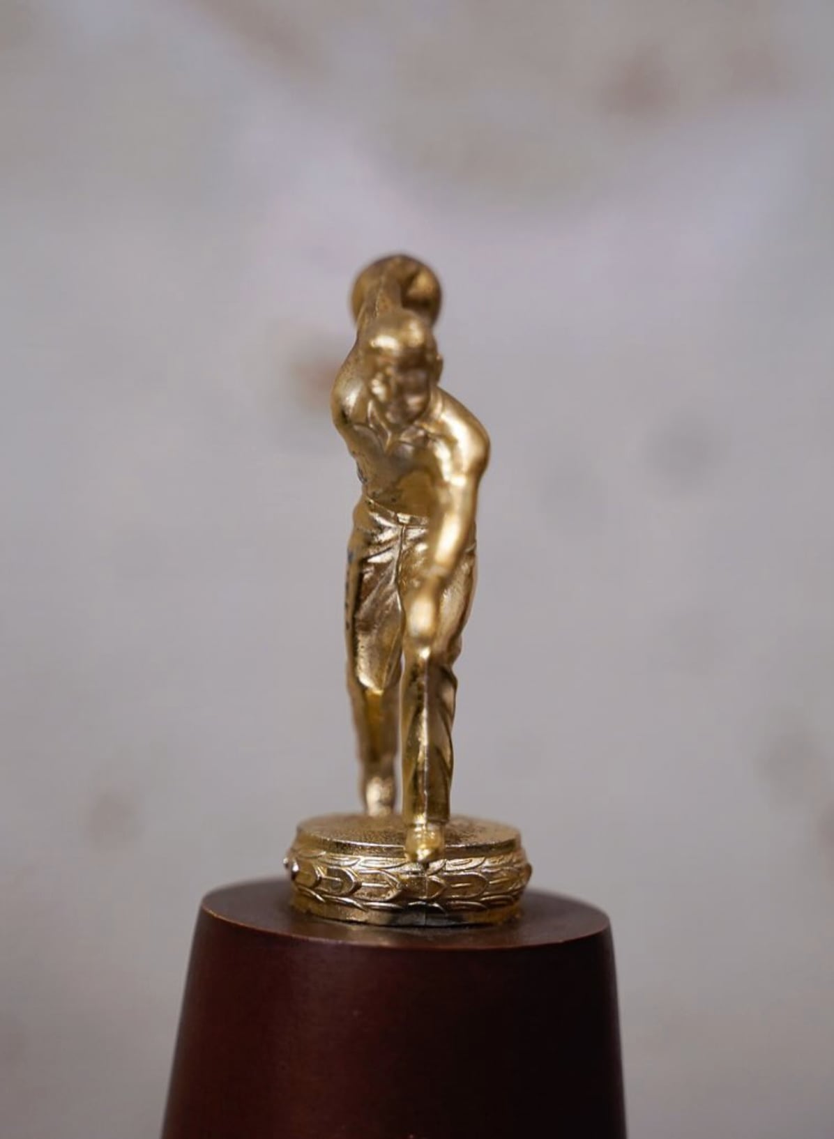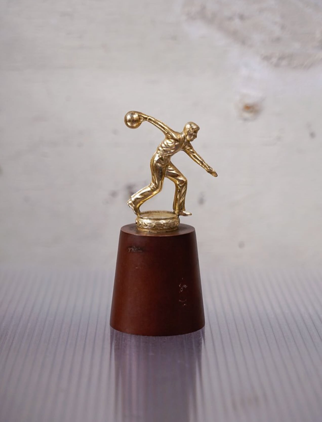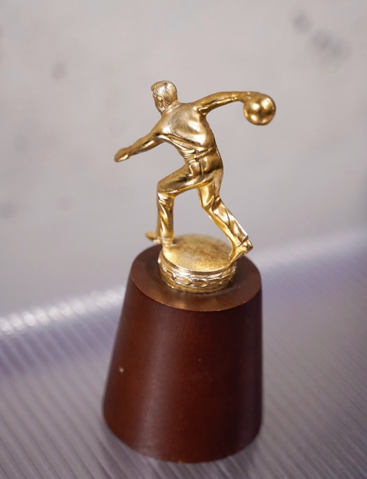 どこからどう見てもトロフィーです。ただ、台座に貼られていたであろう賞の名前や、受賞者の名前の書いてあるプレートは外されています。せっかくのトロフィーは手放すとしても、プライバシーは守りたかったのでしょうか。