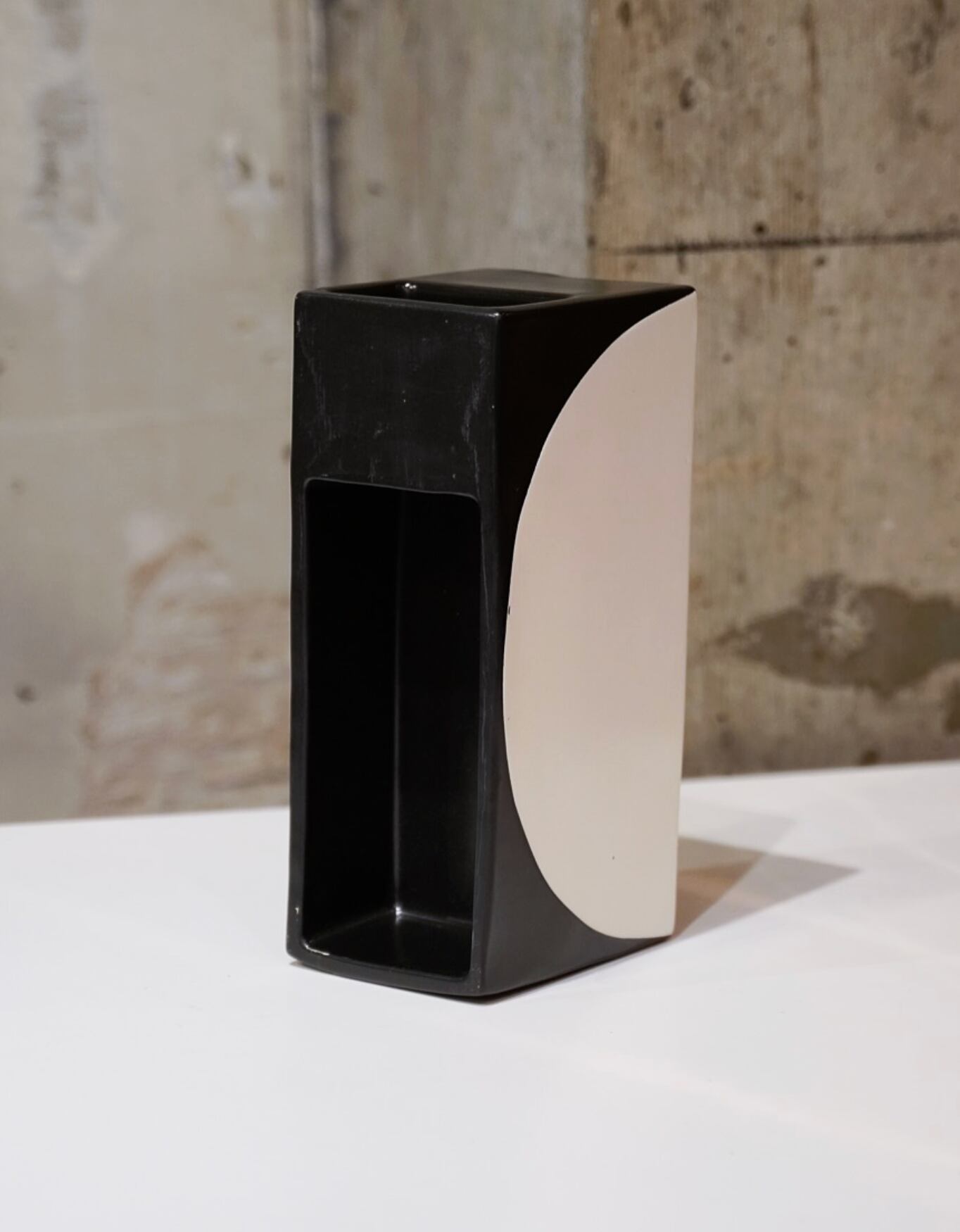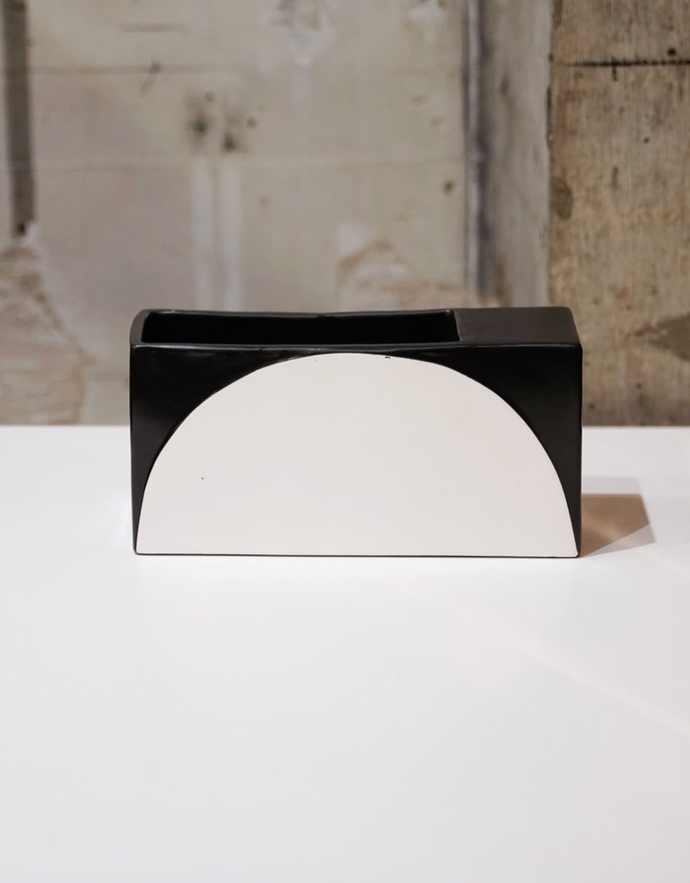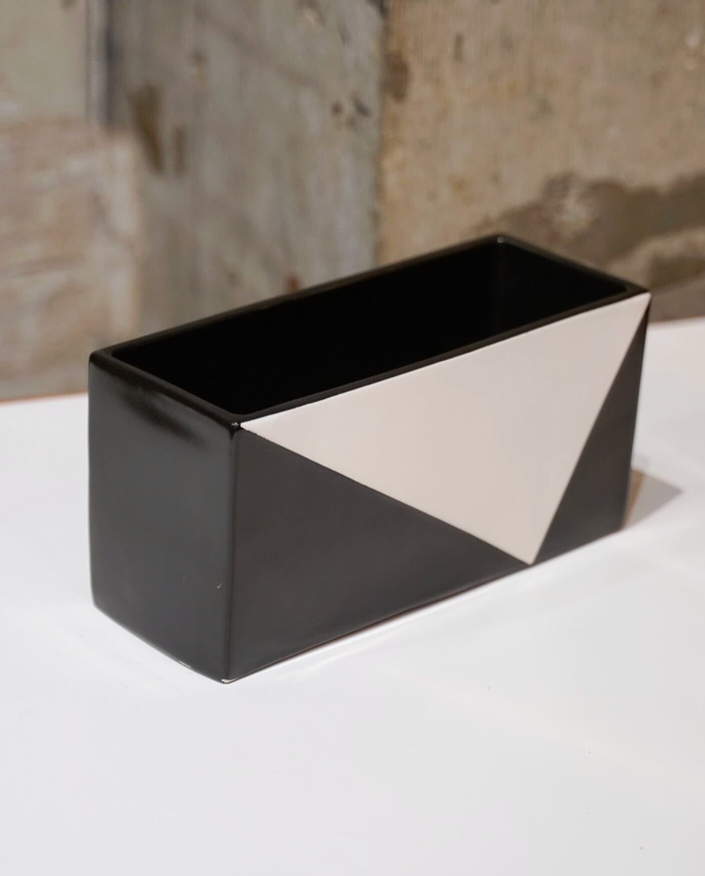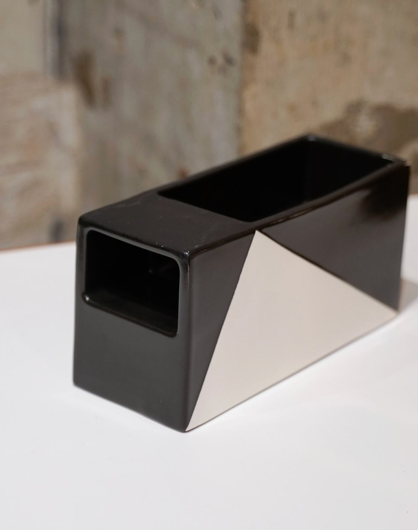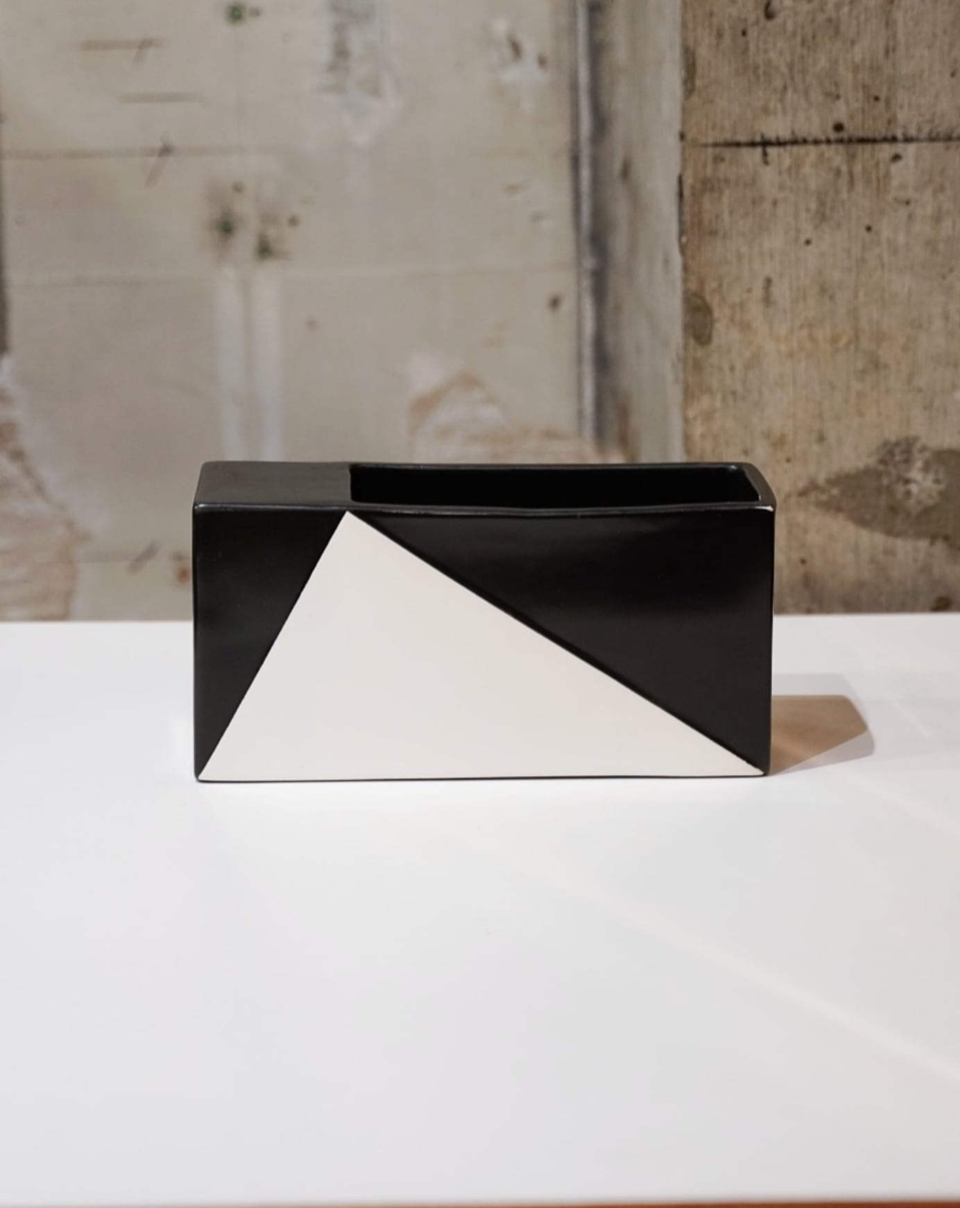 一見ふつうの花器かな〜と思ったのですが、よくみると片方は三角のもよう、もう片方は半円のもよう。そして片方にはくぼみ、もう片方はもっと大きなくぼみ、短辺にもくぼみ。置き方によっていろいろ楽しめる作りになっています。