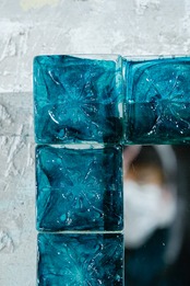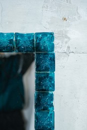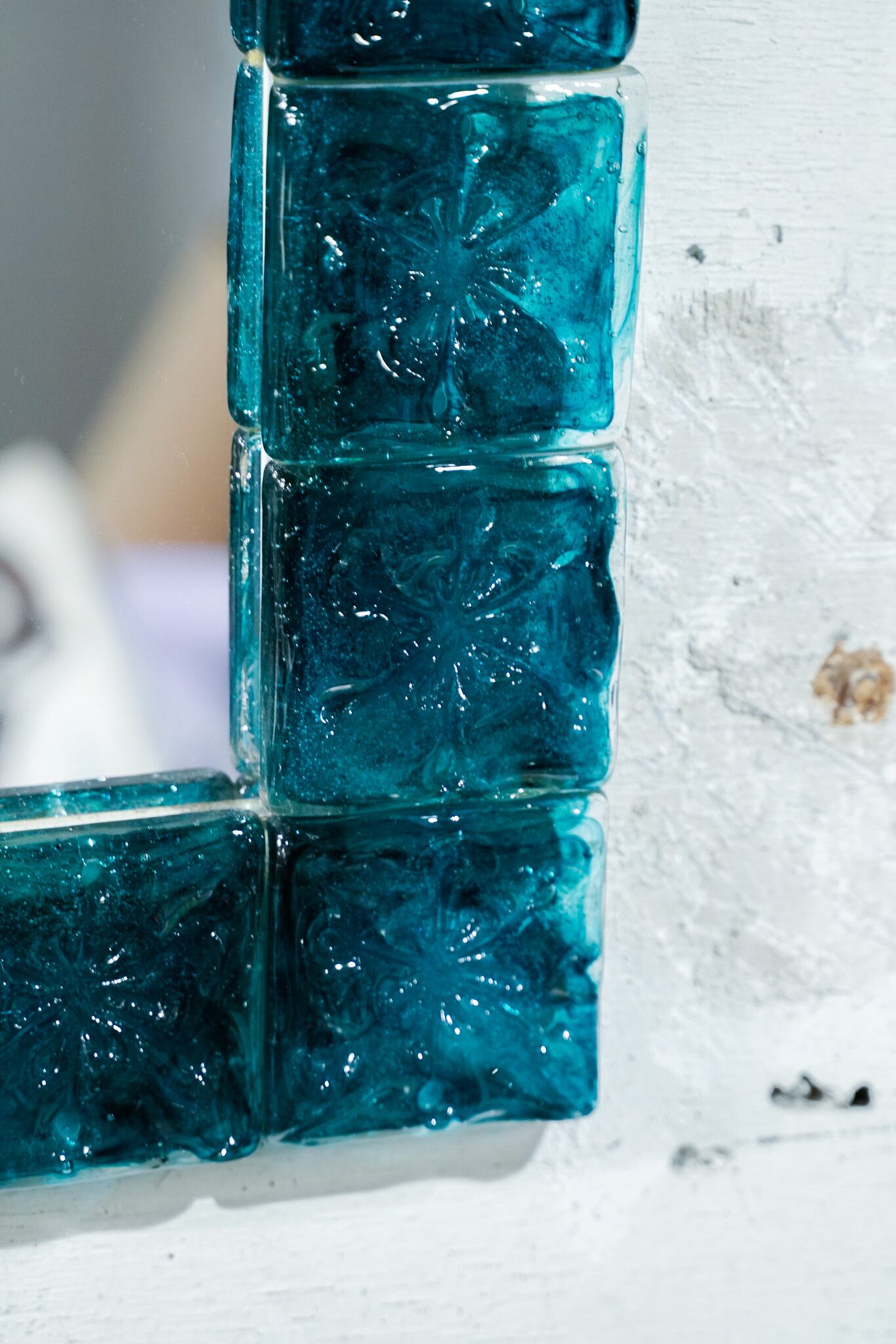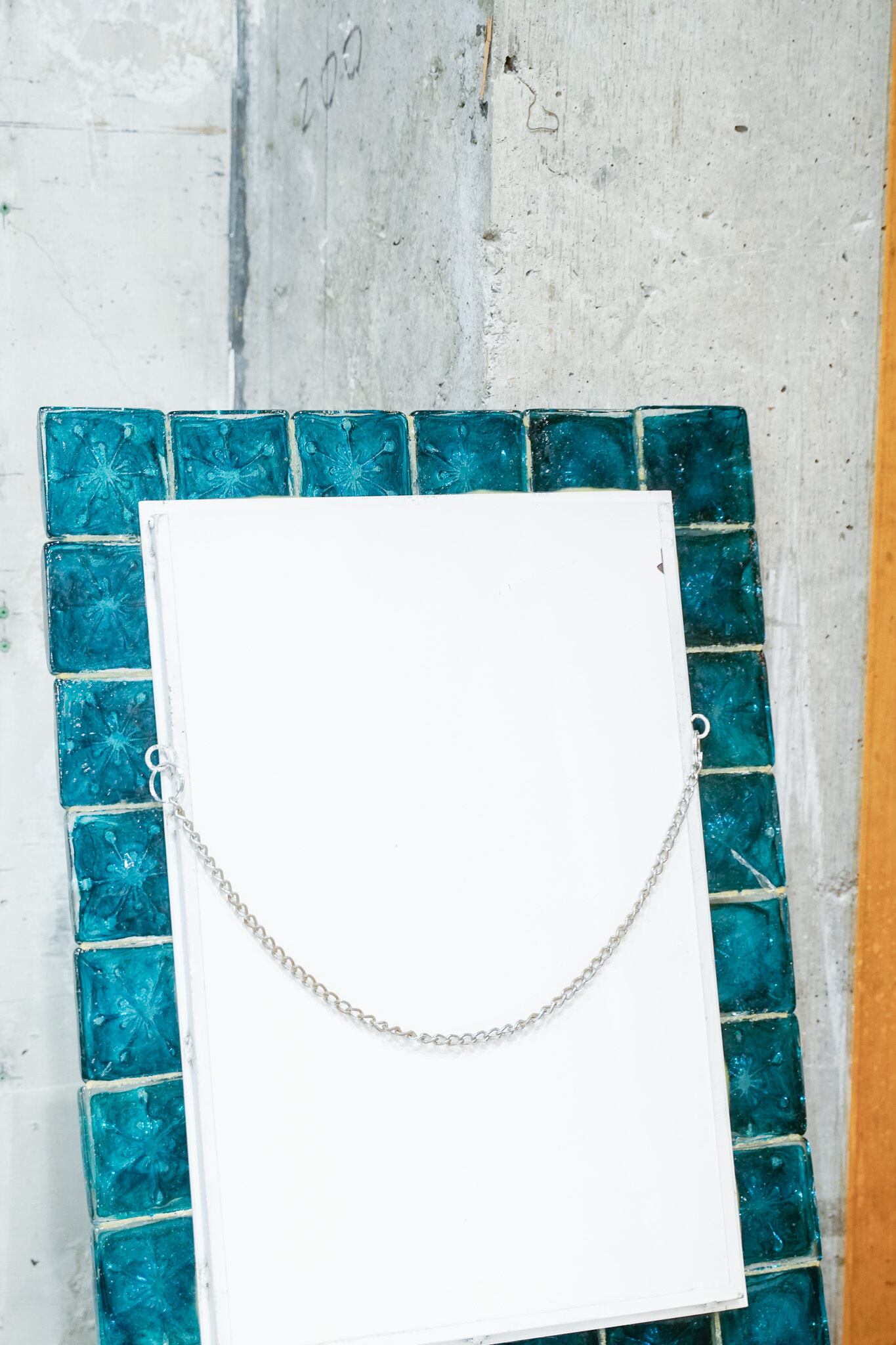 分厚いガラスでできた、ずっしりした枠のついたミラー。裏面にチェーンがついているので、壁掛けにすることができます。