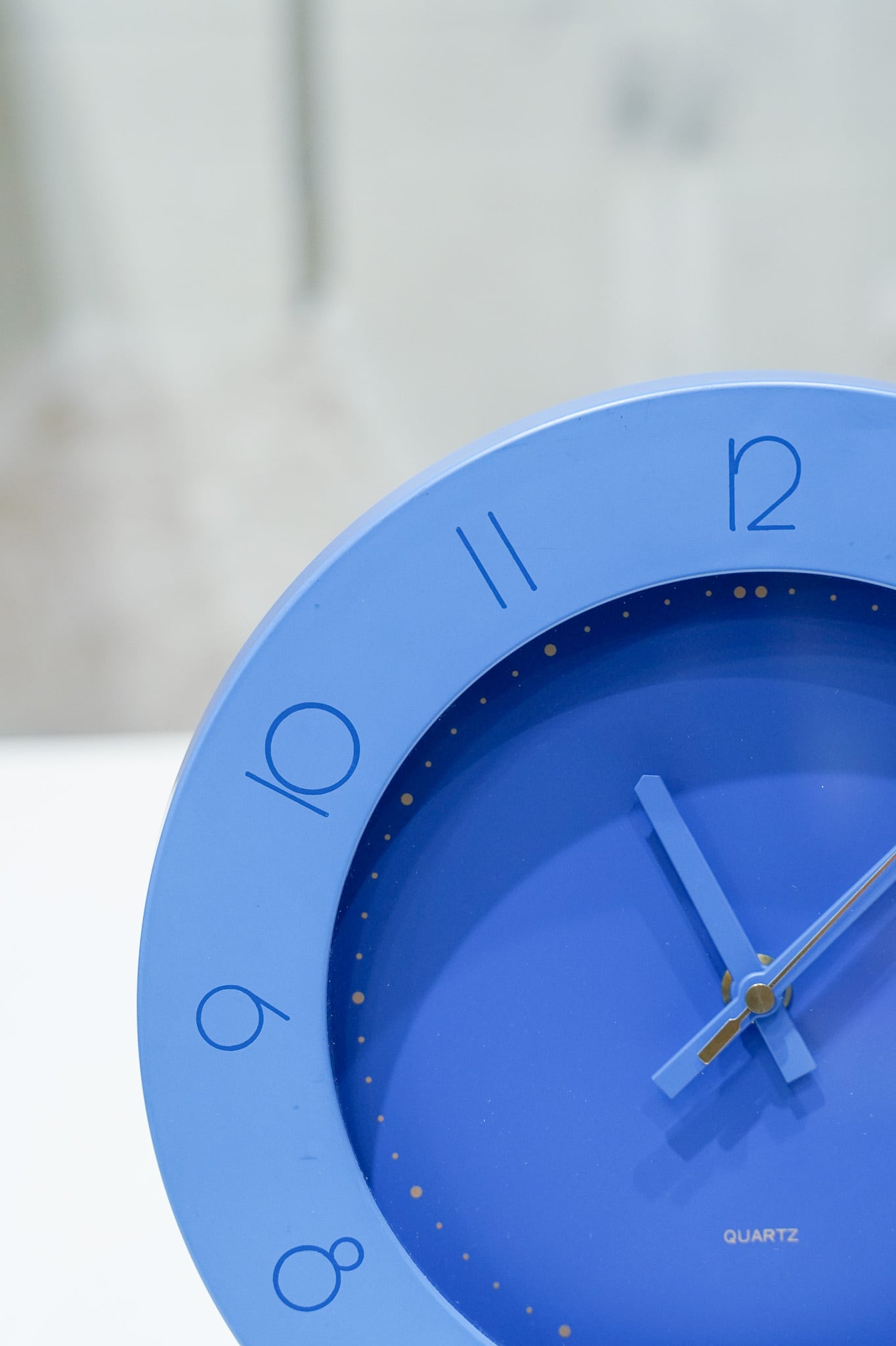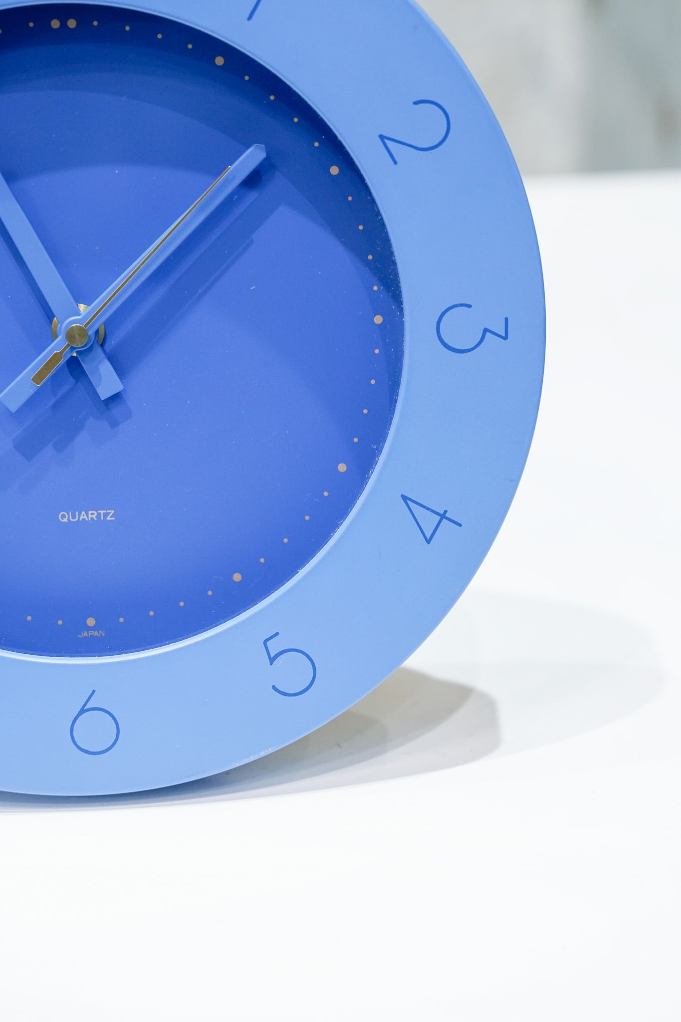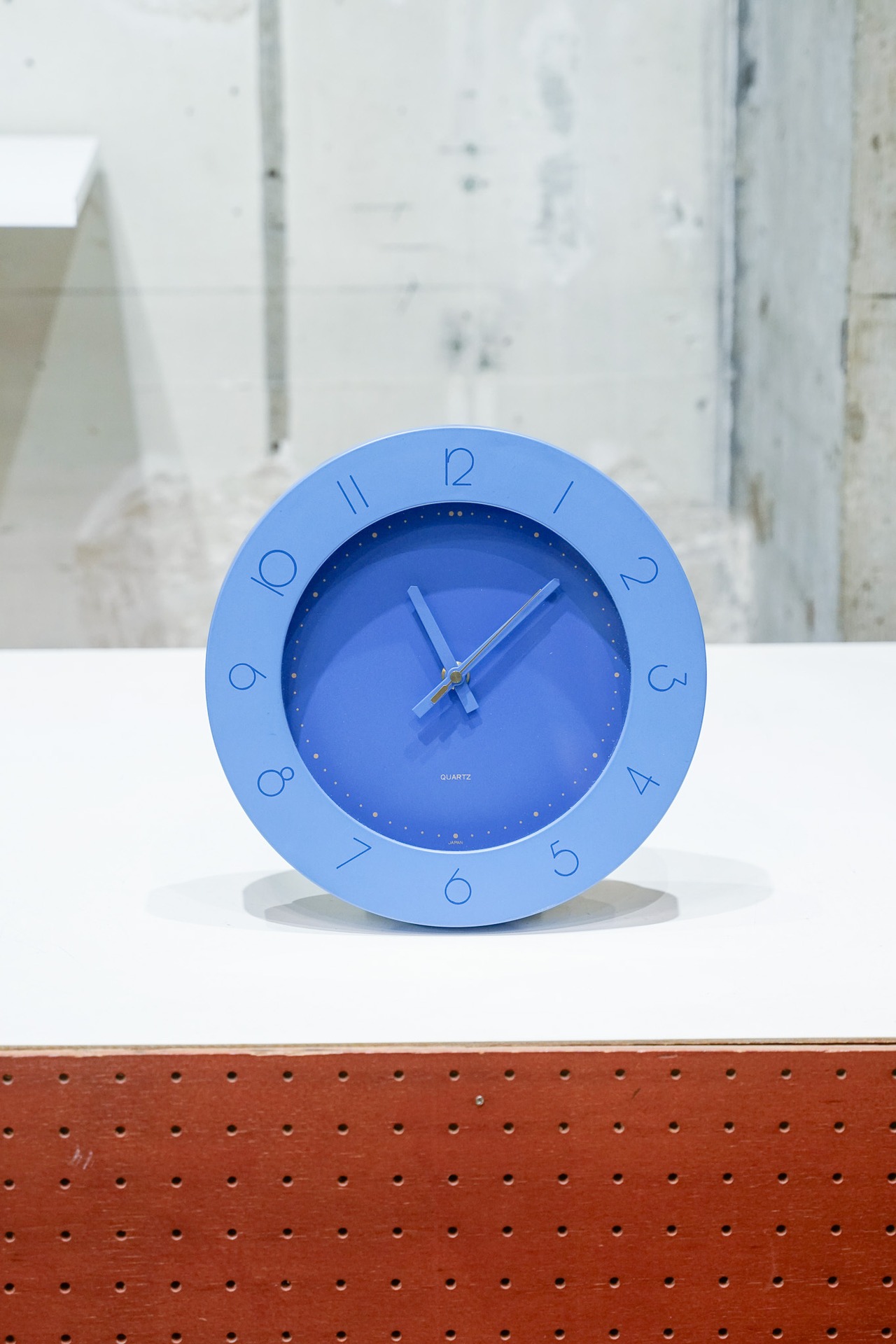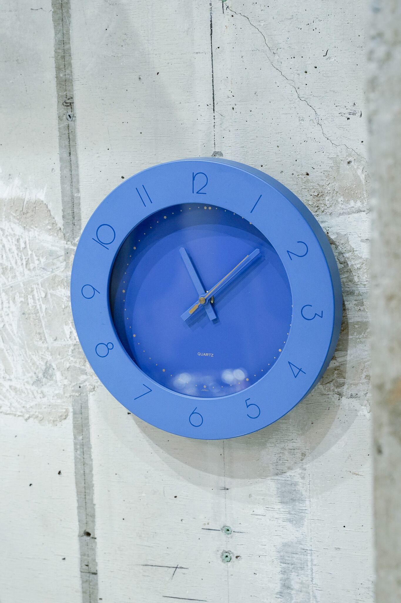 ブルーで構成された時計。かわよいフォントの数字が外側の枠におさまってるのがグッドです。内側にも分数を示す点々があるので、時間はちゃんとわかるようになっています◎