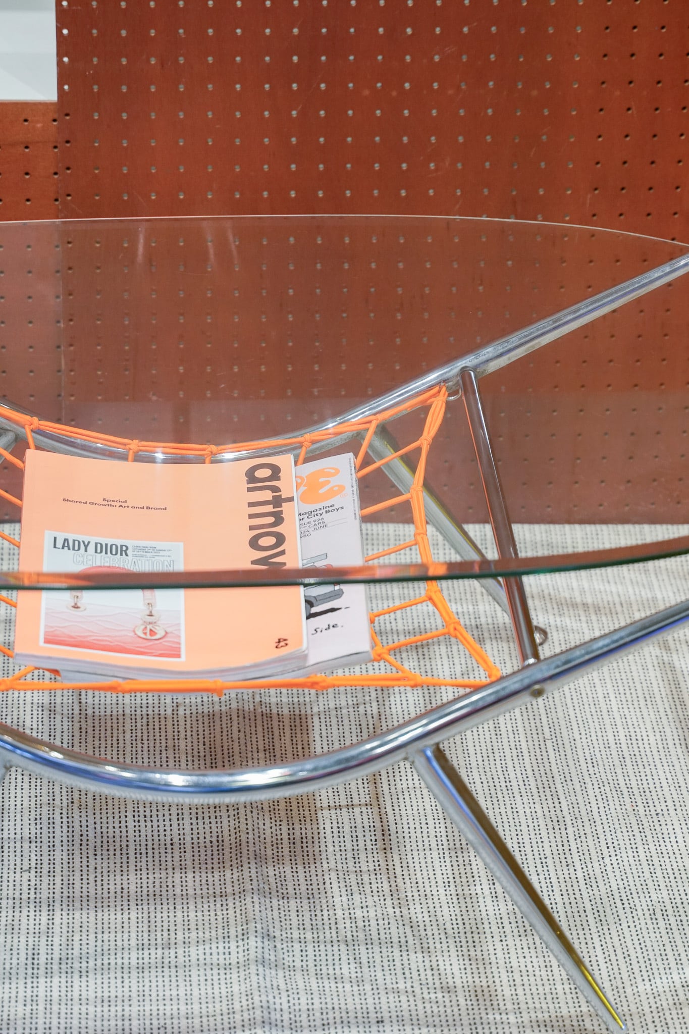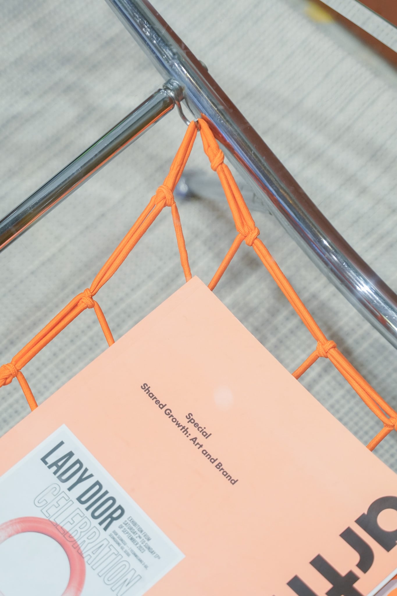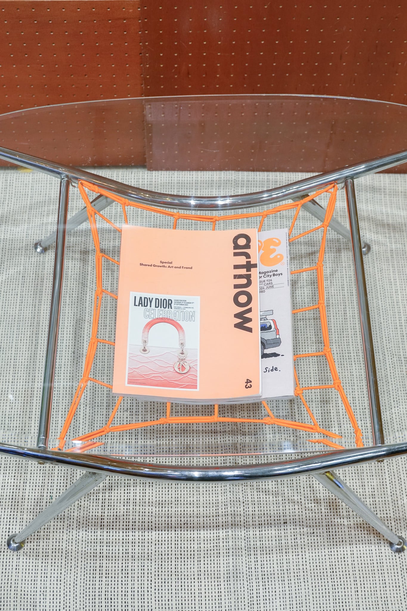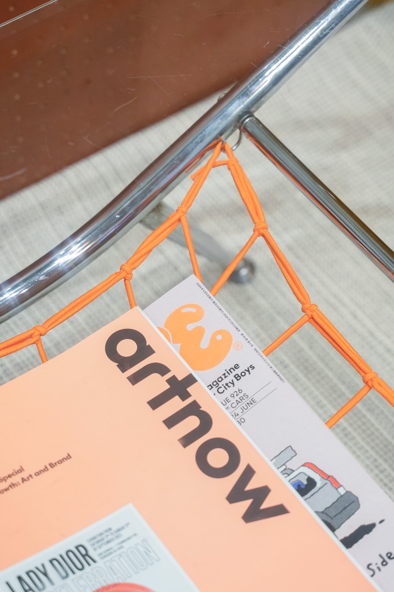 雑誌など、ものを置いた時に少したゆむネットがかわいい。絶妙な角度のスチールフレームから伸びる脚も、スペースデザイン感ある!