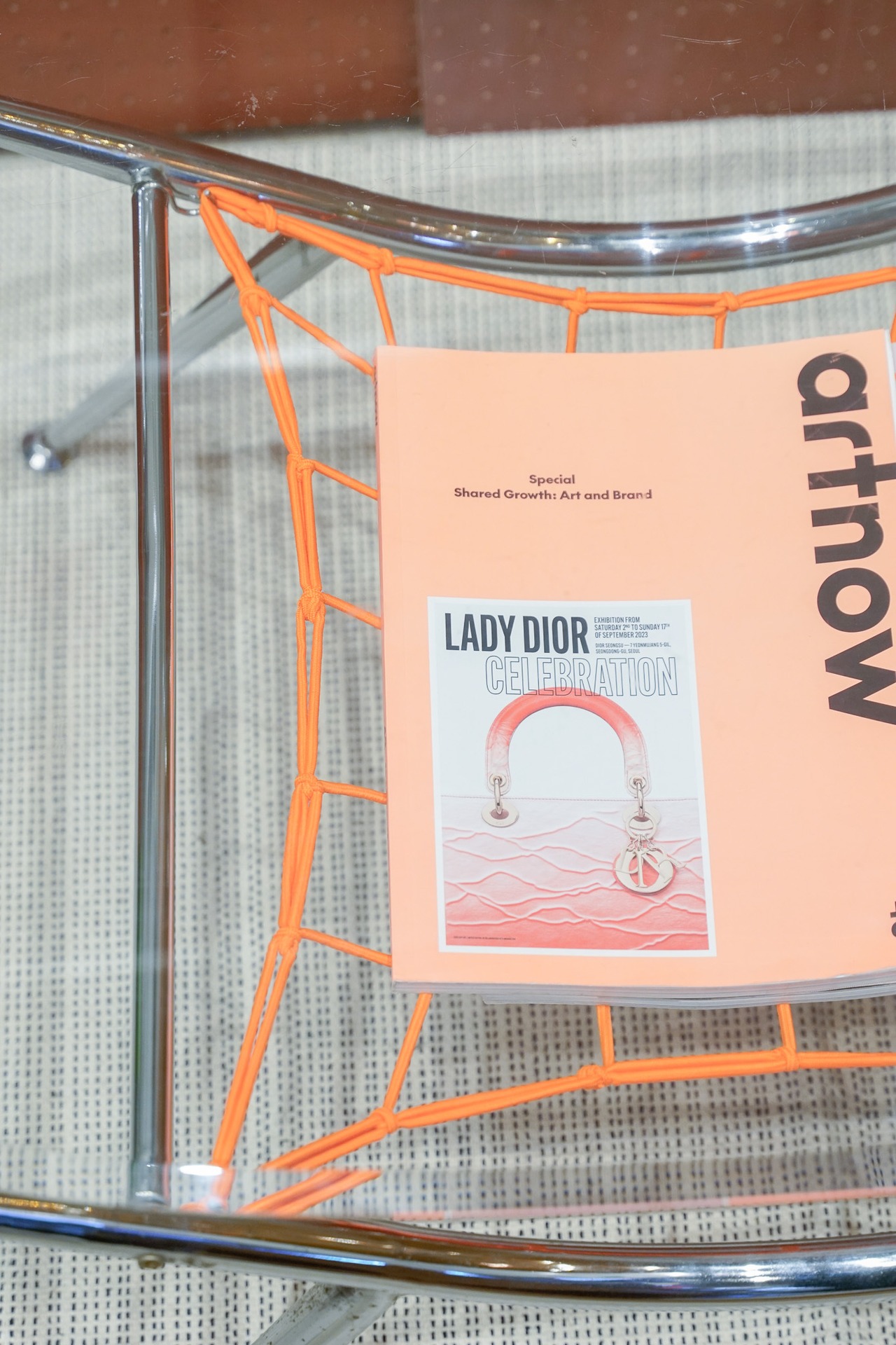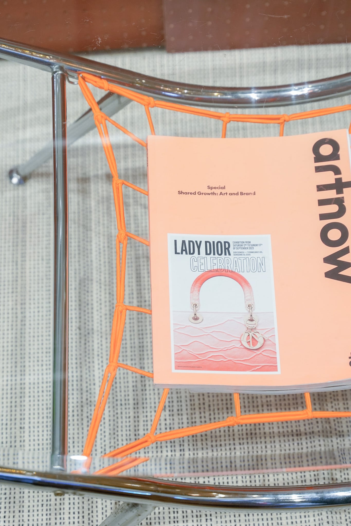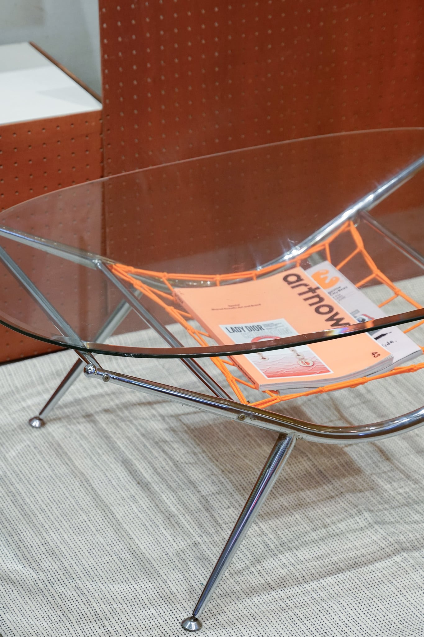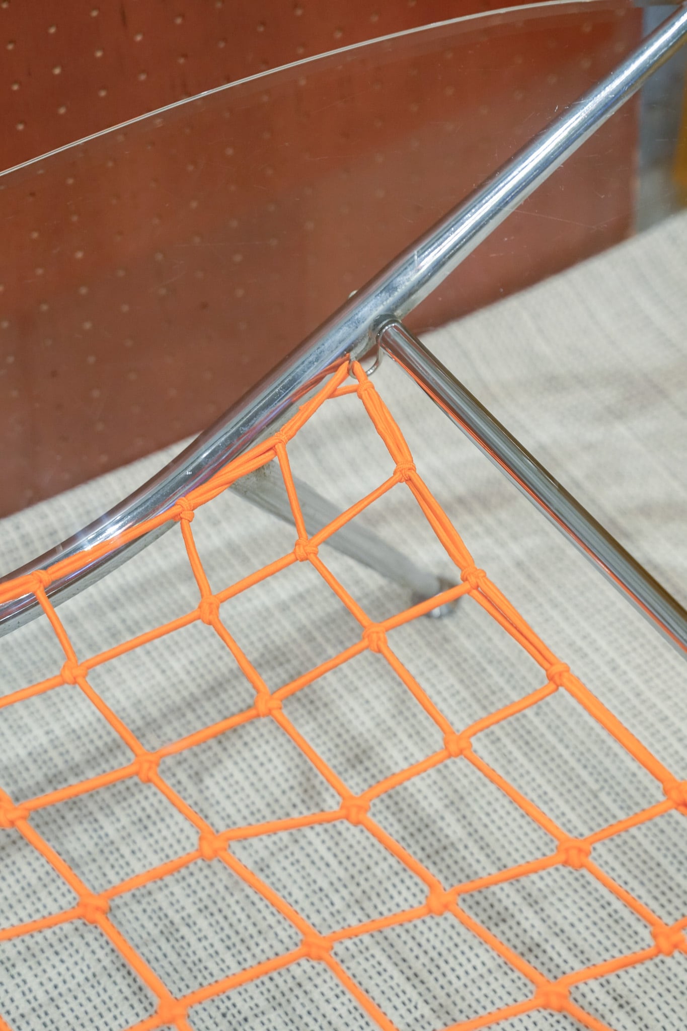 雑誌など、ものを置いた時に少したゆむネットがかわいい。絶妙な角度のスチールフレームから伸びる脚も、スペースデザイン感ある!