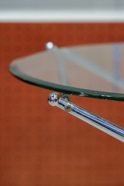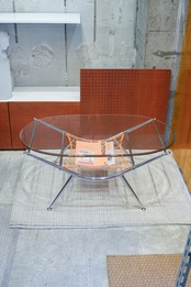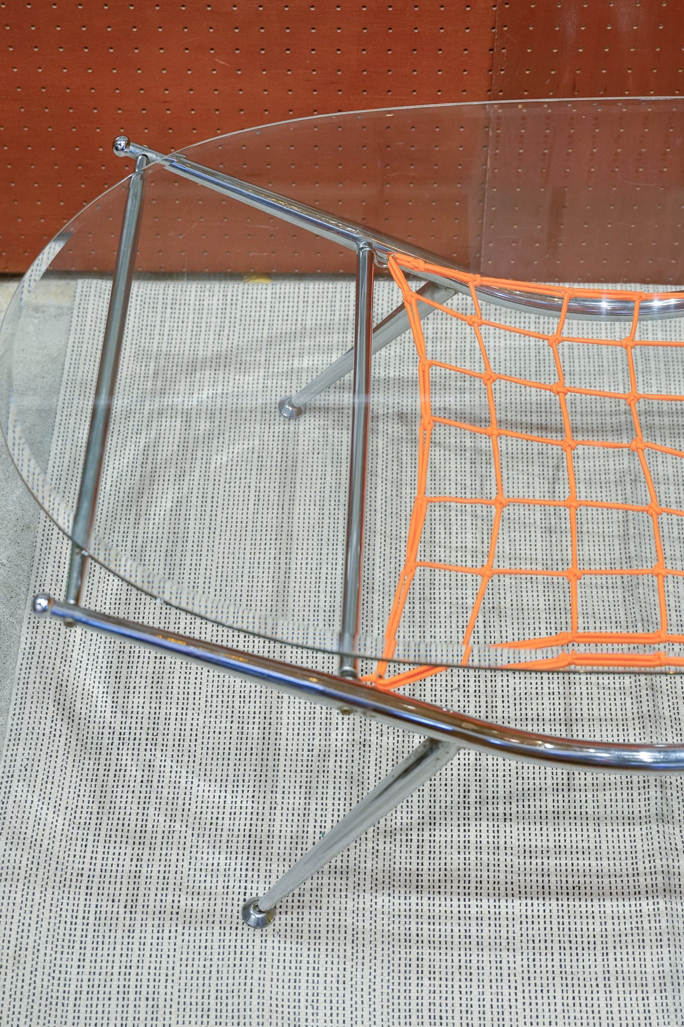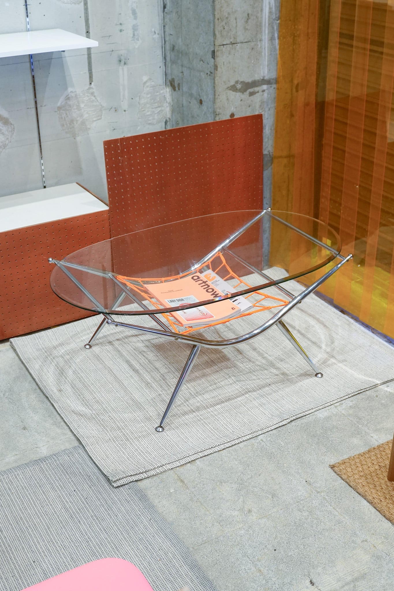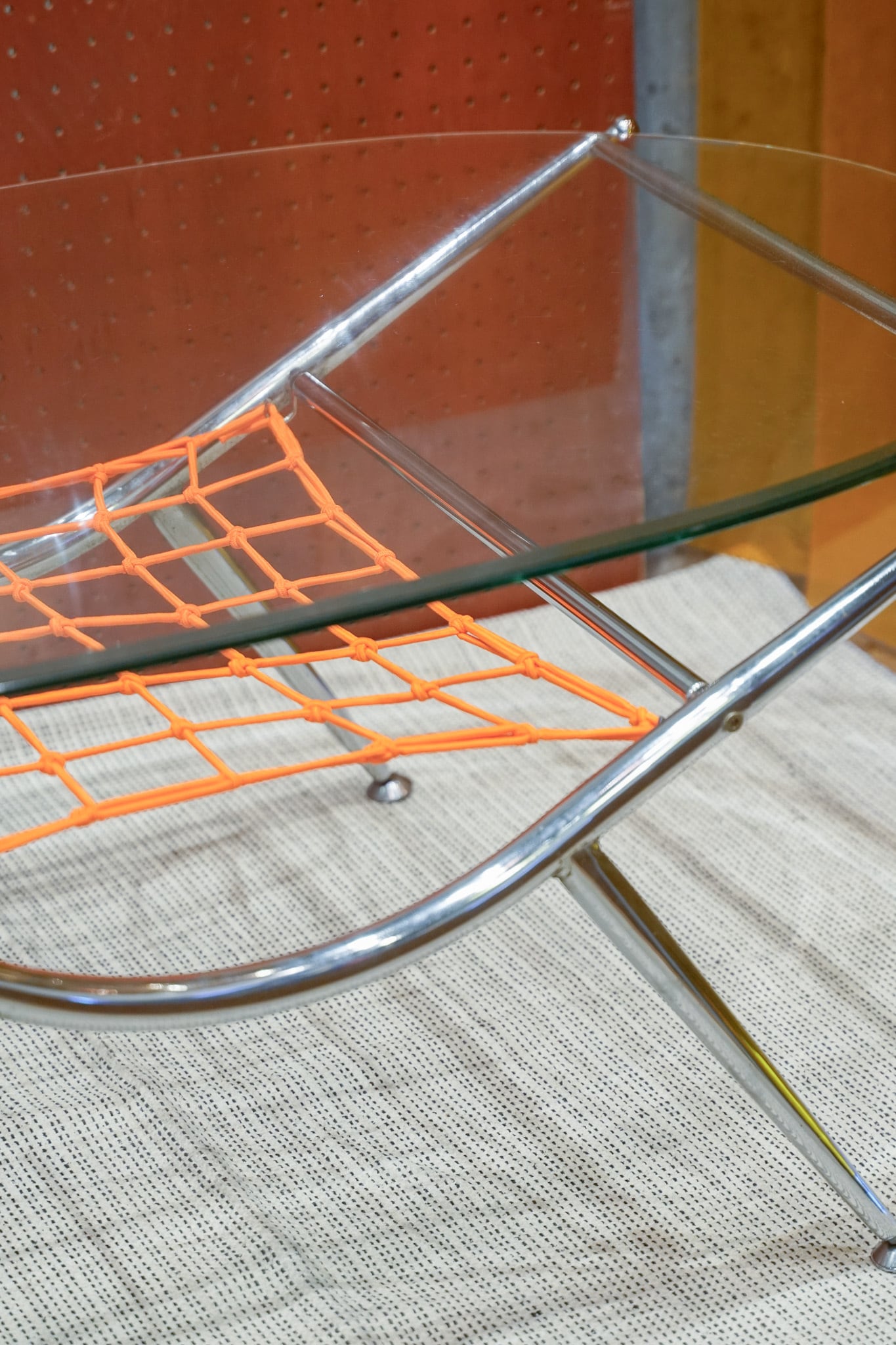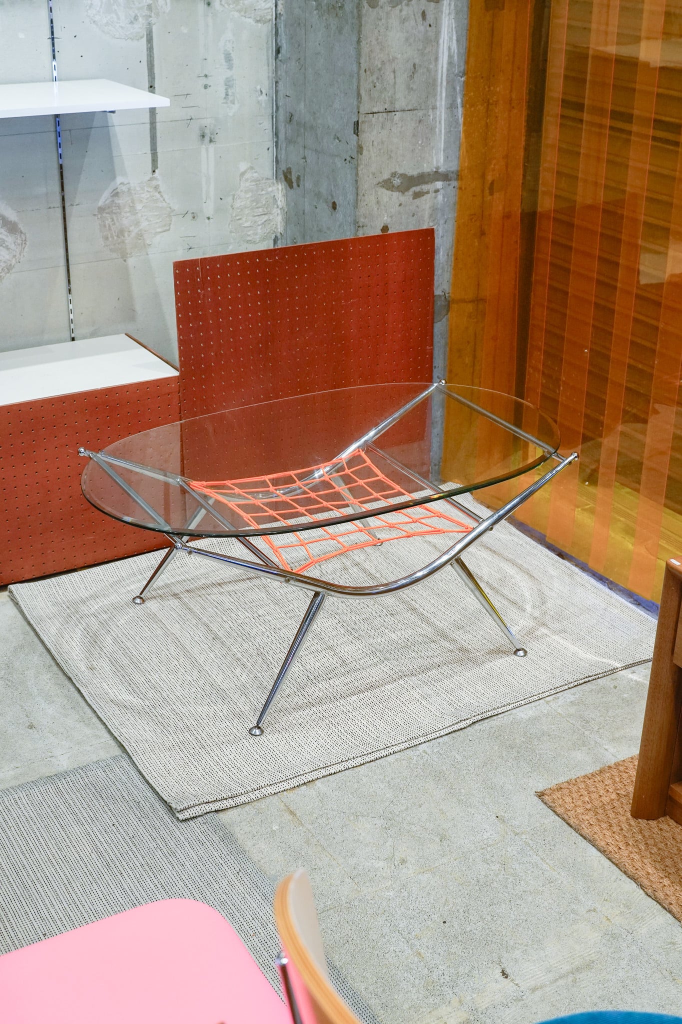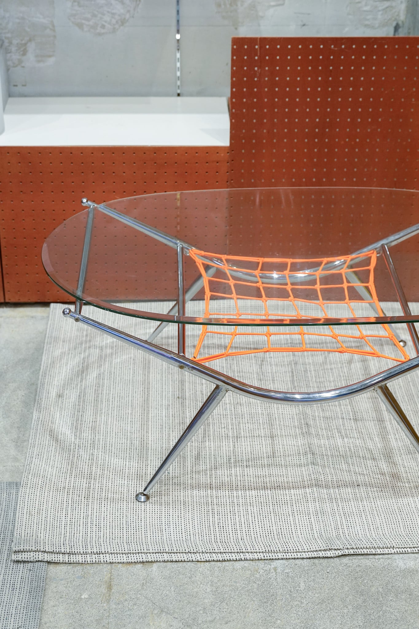 シンプルなオーバルガラステーブルの2段目を、パッキリオレンジのネットに替えてみました!