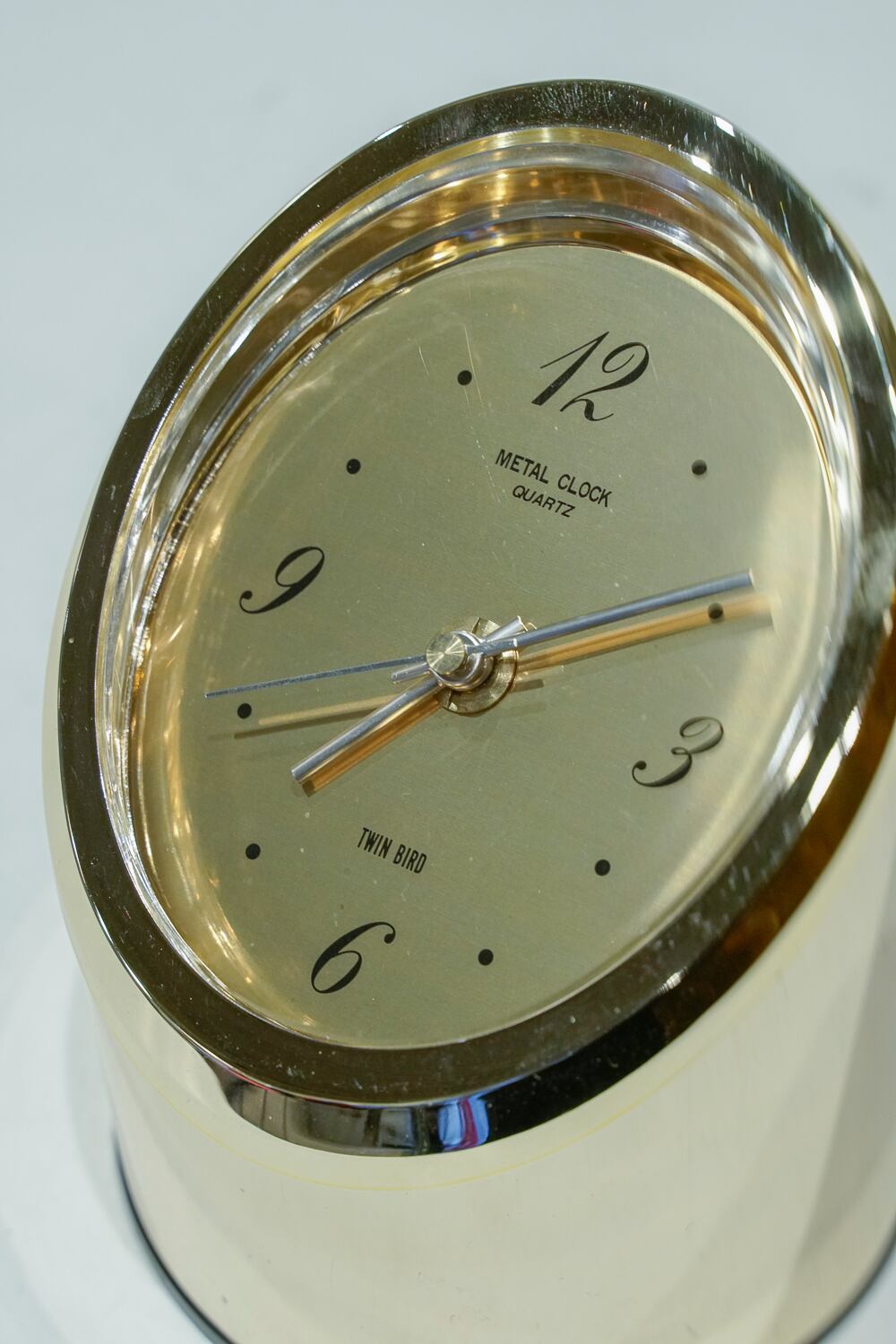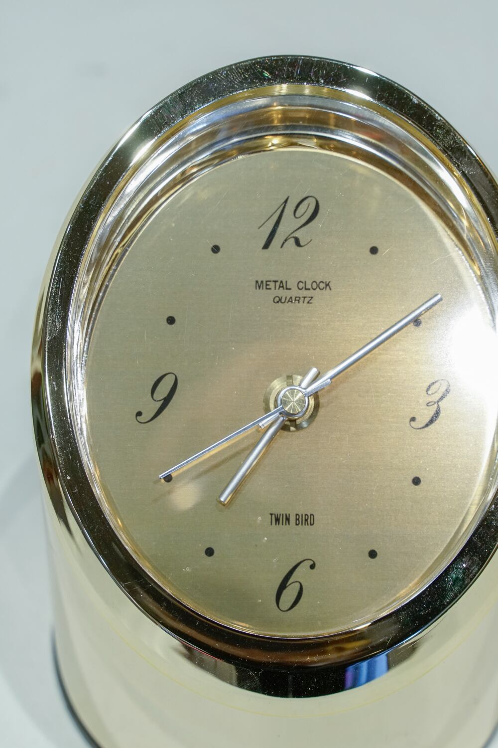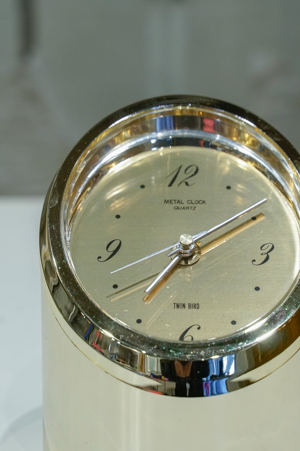 特徴のある時計をたくさん出していたでお馴染み(?)ツインバードの置き時計です。円柱を切り取ったような形状に、なんといっても金ピカのボディ。短針と長針も丸みがあって、こだわりを感じます。