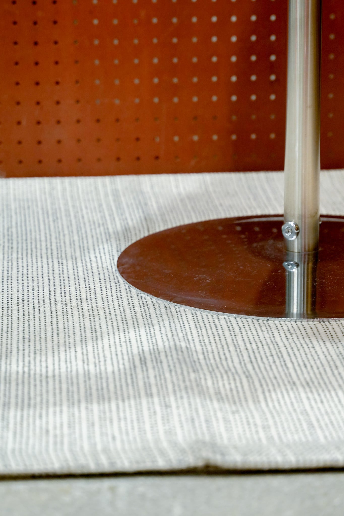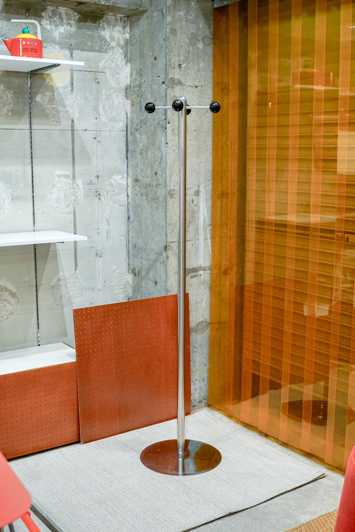スッと伸びた支柱、薄くて丸い板の土台、十字に設けられたハンガー部分の先端には黒い球が付いています。