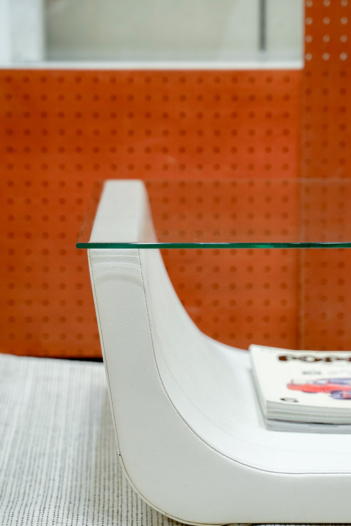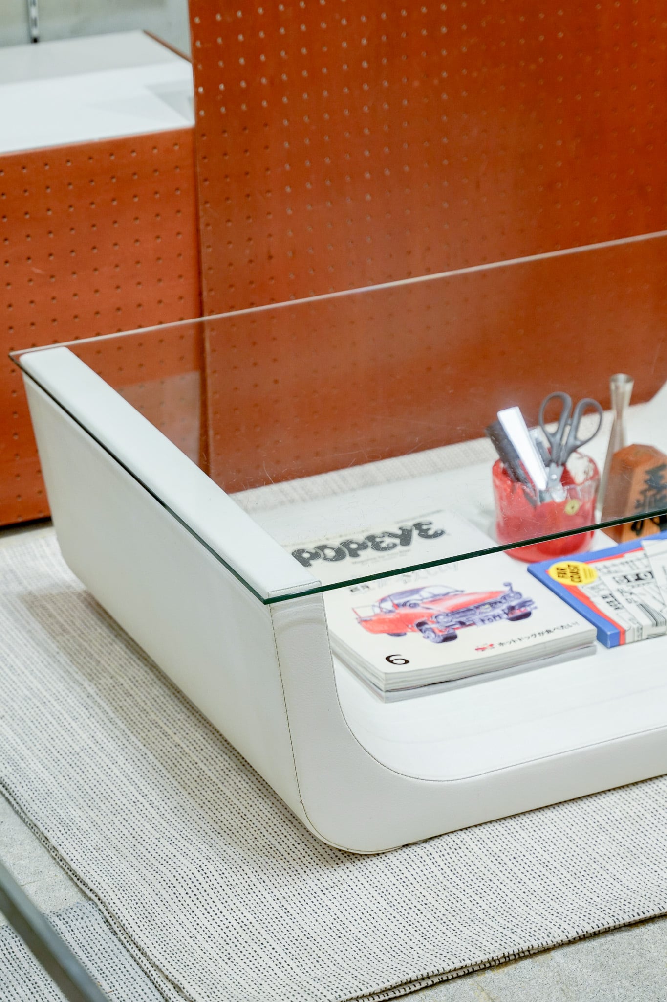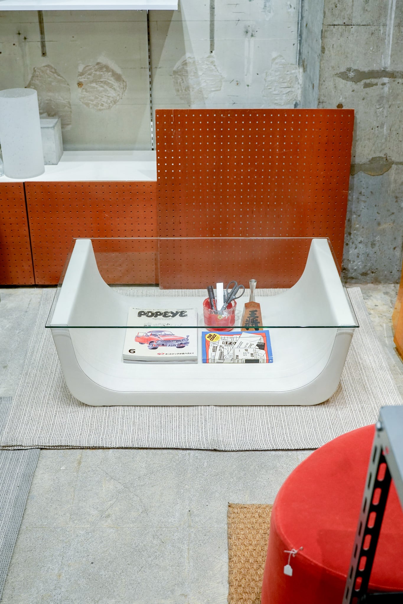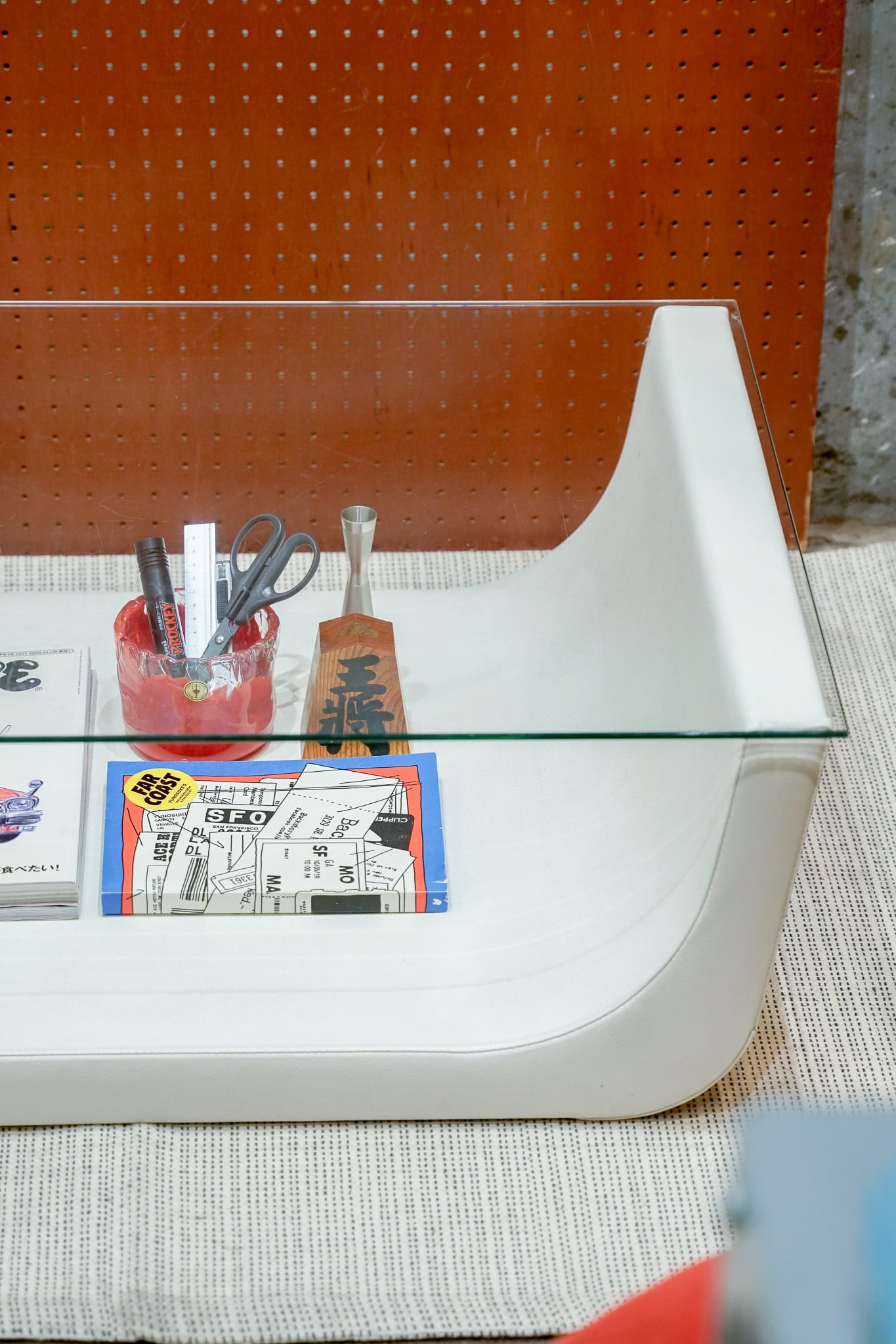 よい曲線ですね。ガラスとの間に大きなスペースがあるので、雑誌を置いたり、お気に入りのアイテムを飾ったりできます!