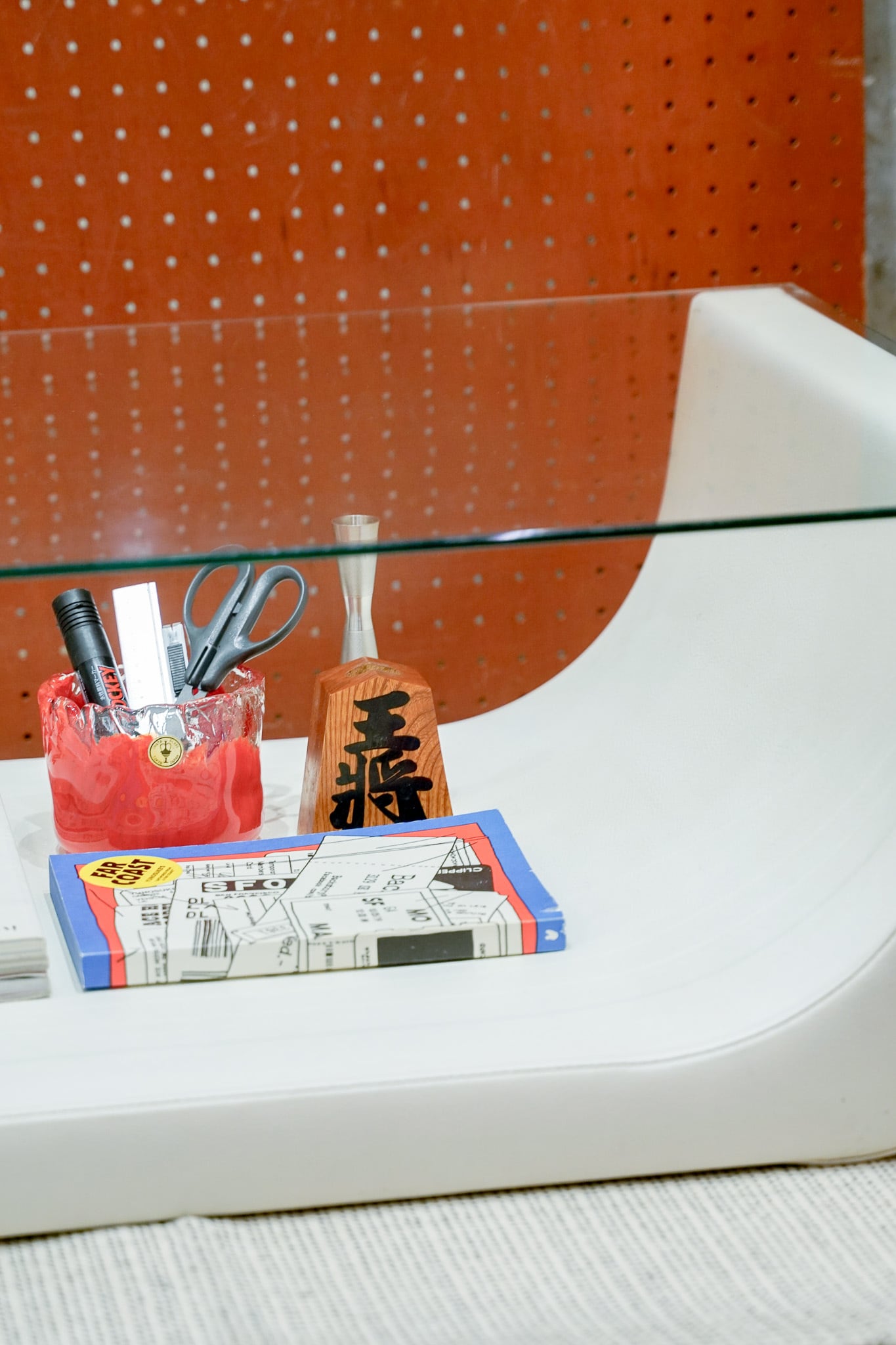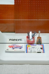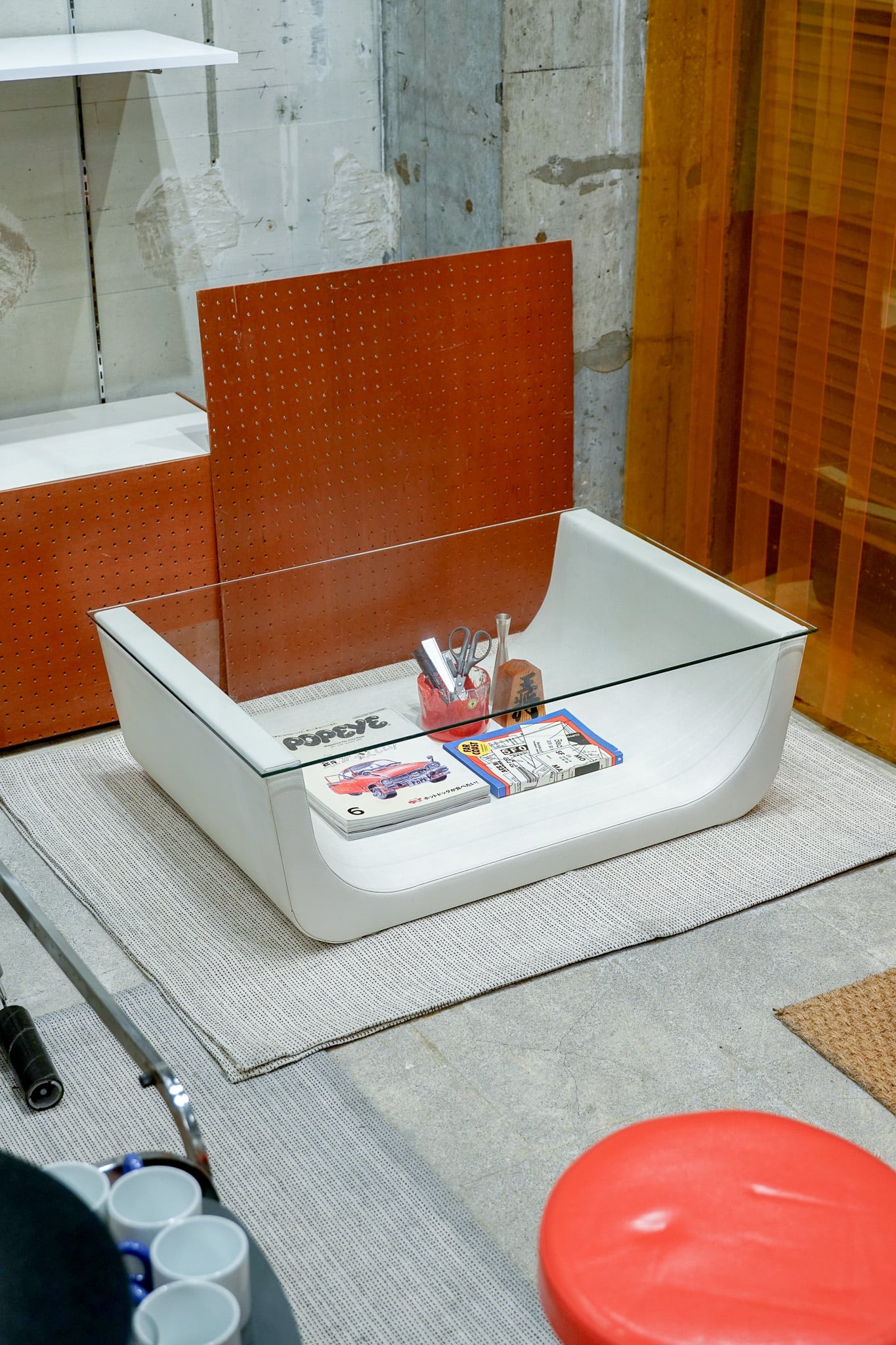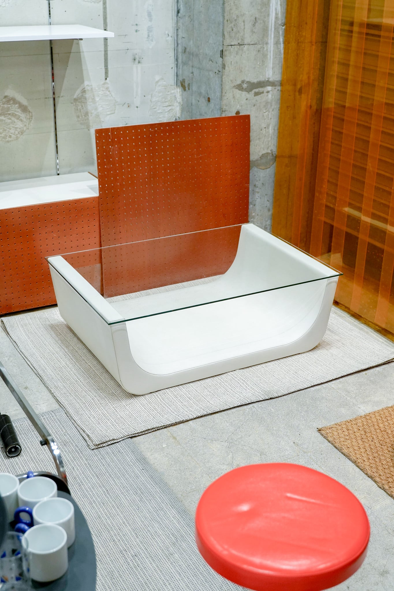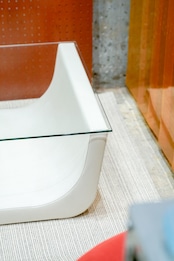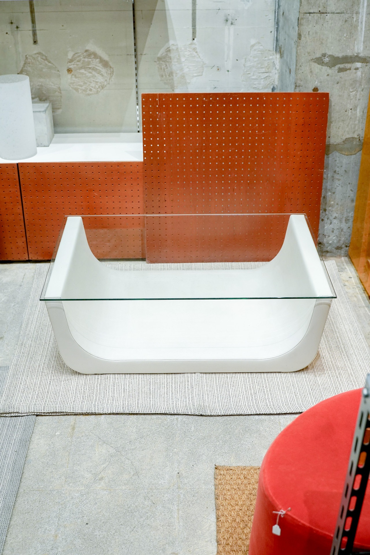 よい曲線ですね。ガラスとの間に大きなスペースがあるので、雑誌を置いたり、お気に入りのアイテムを飾ったりできます!