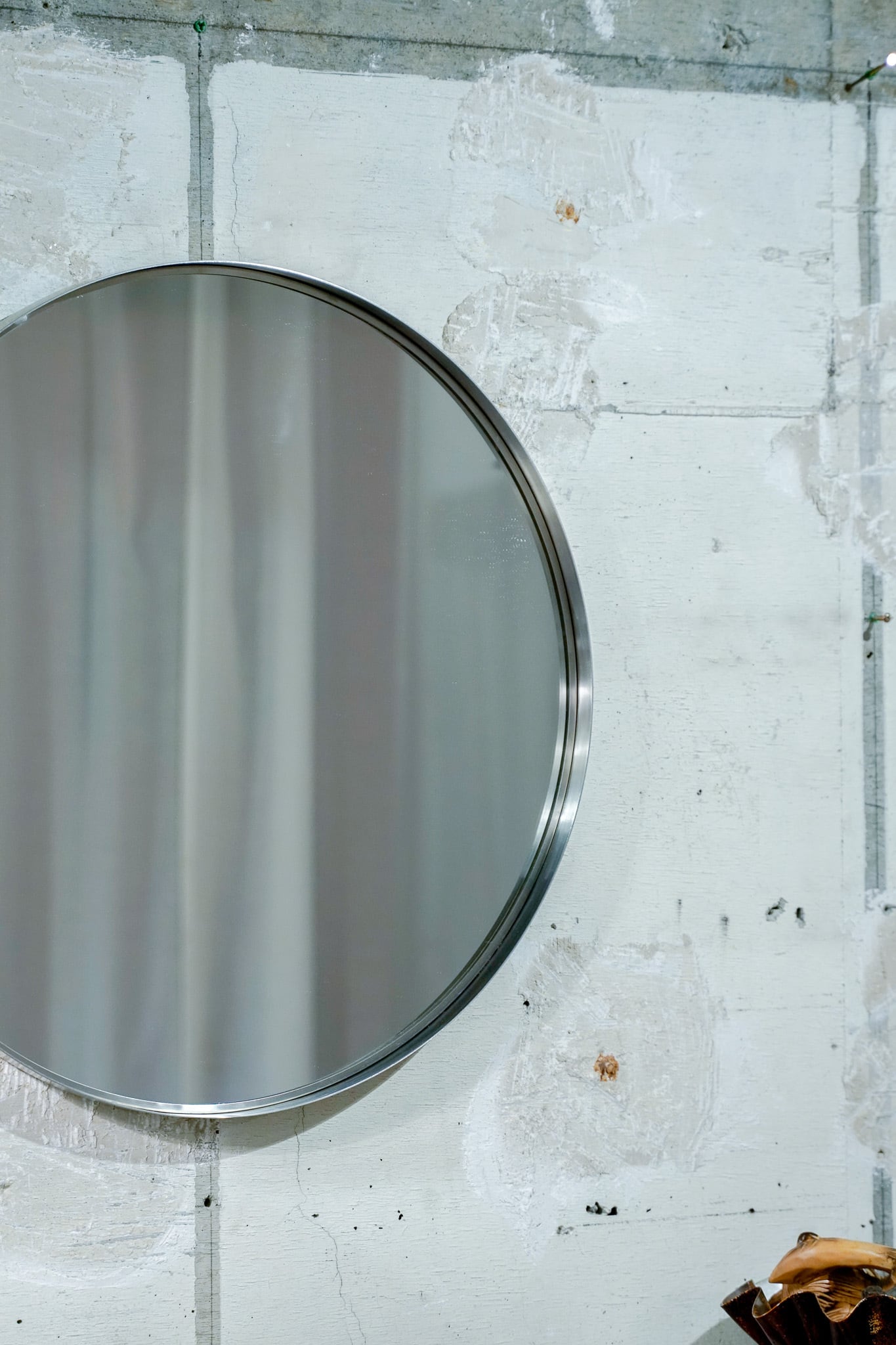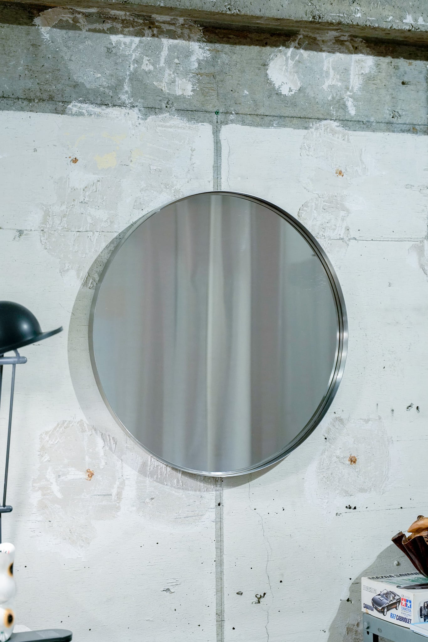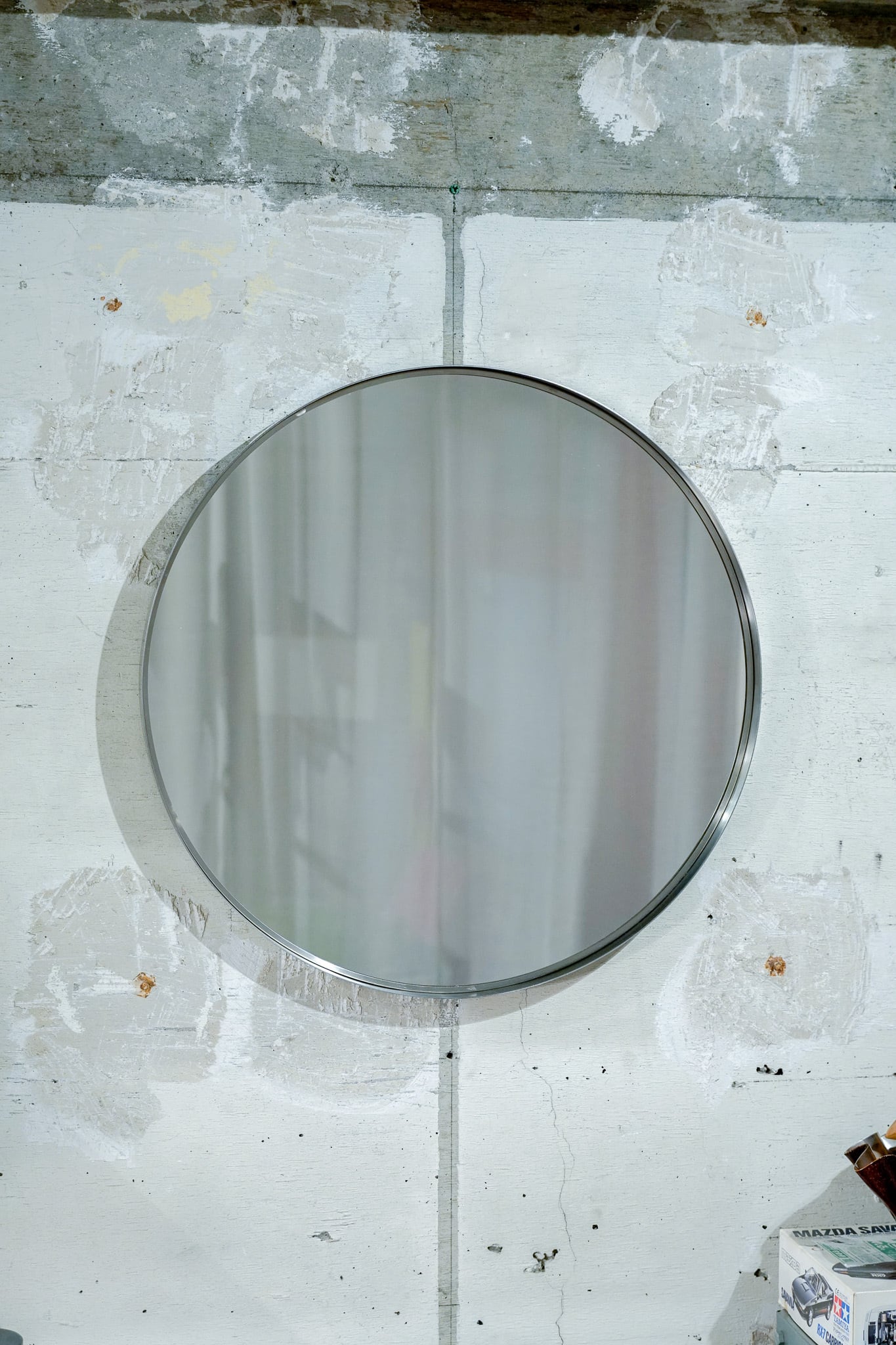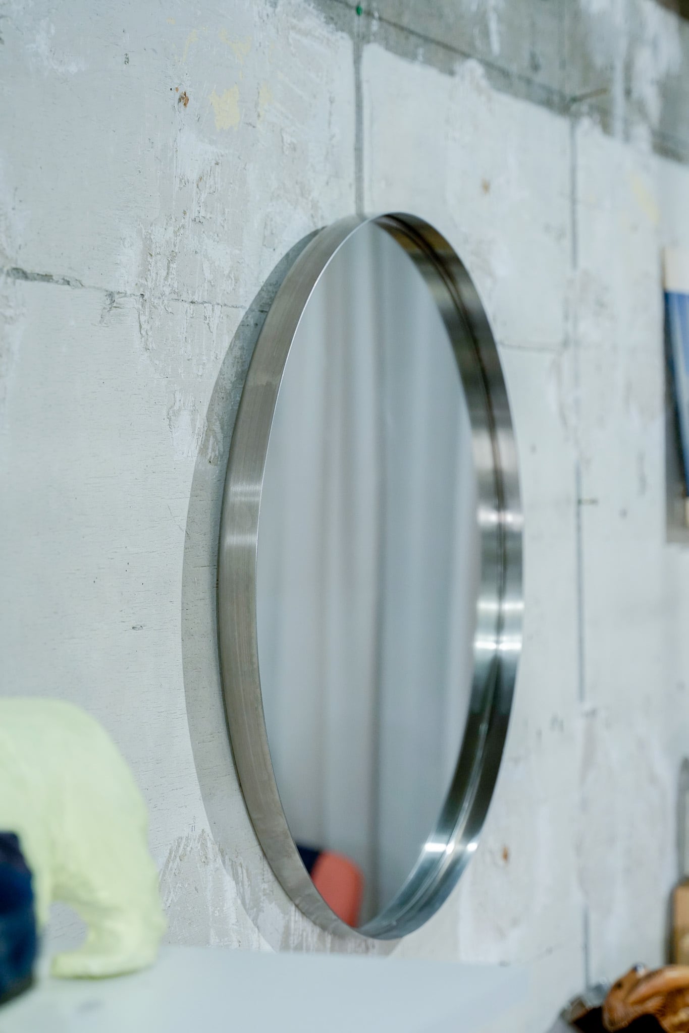 枠は約1ミリ、すごくクールな印象で、白い壁にもコンクリの壁にも似合います。掛けてもいいし、転がらないように工夫をしたら台に置いて使うのも良さそう。