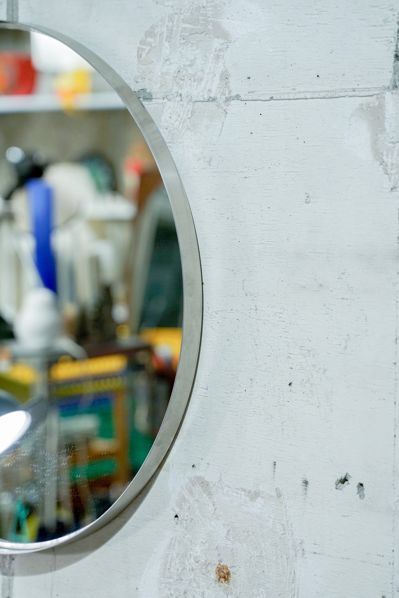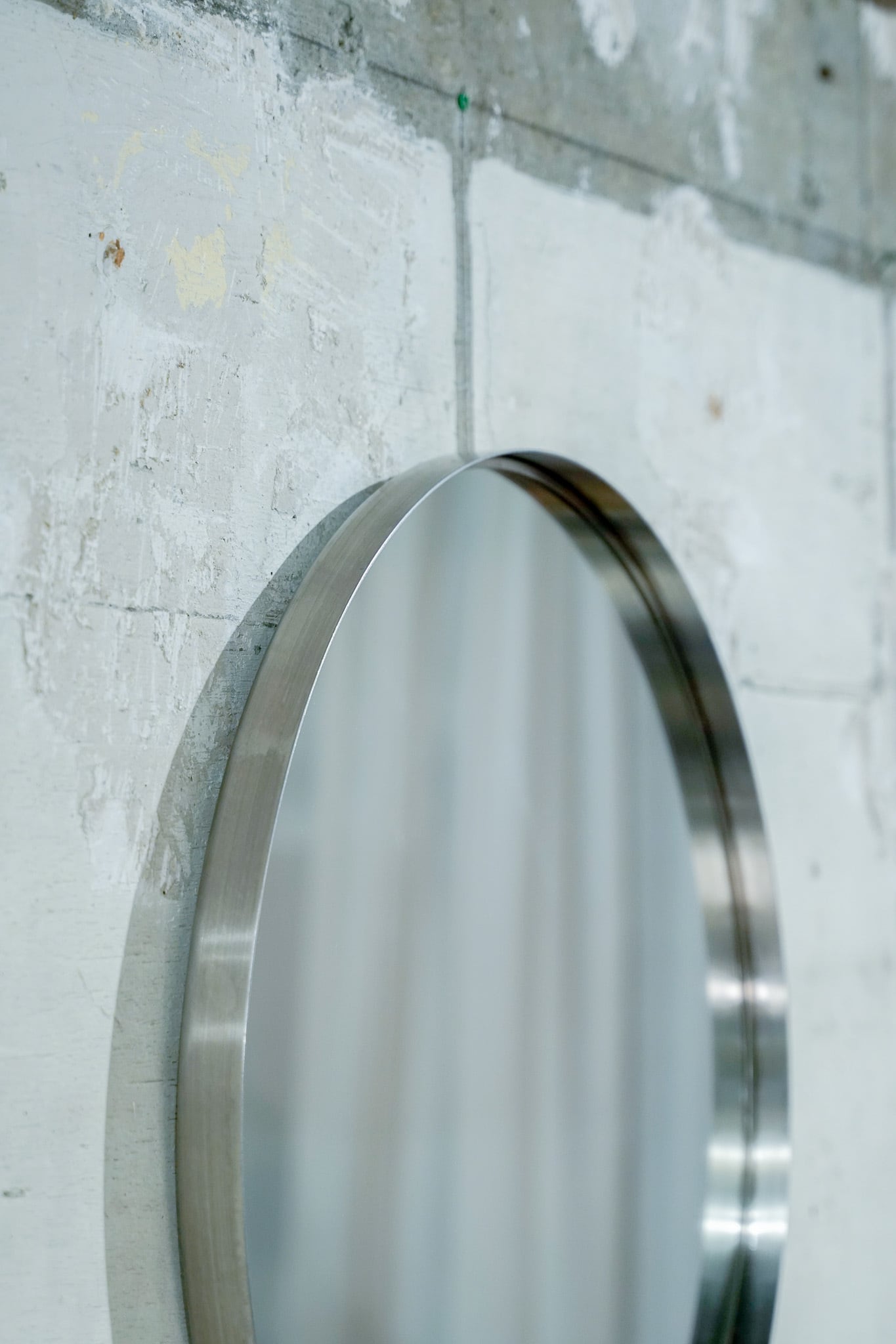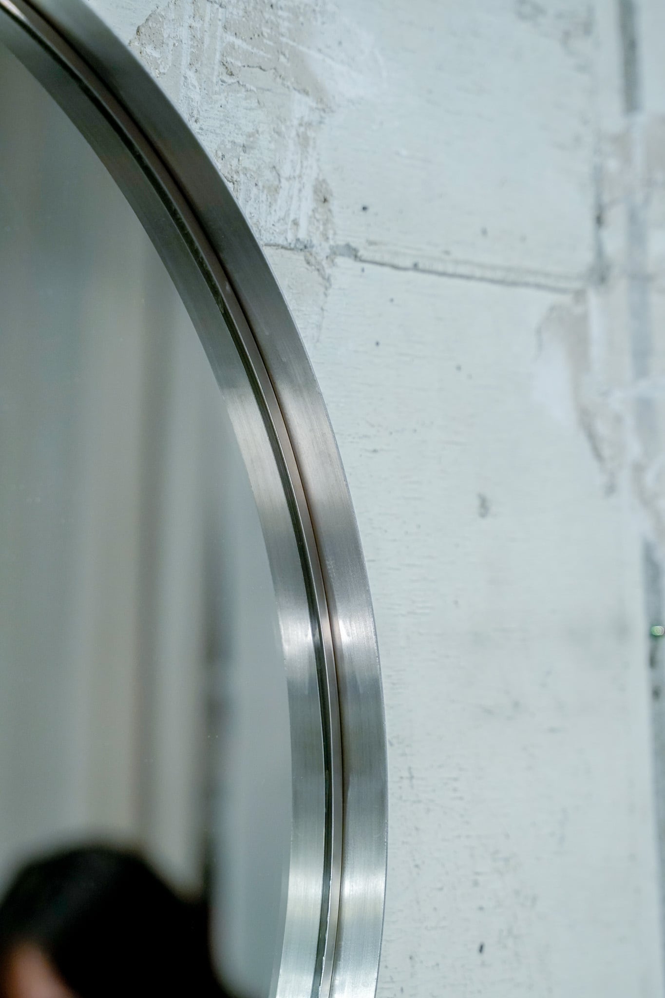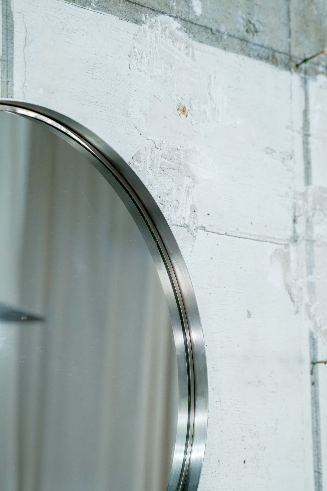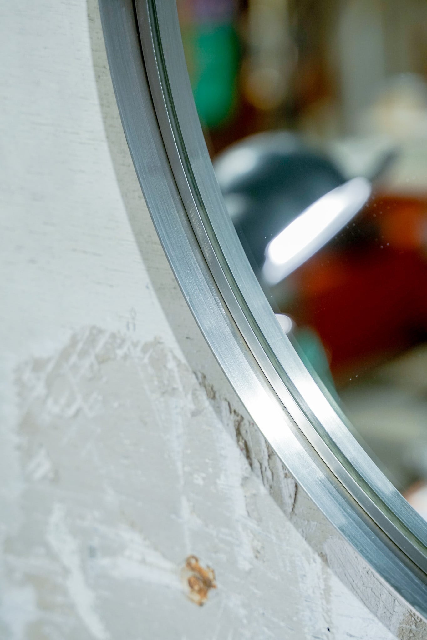 枠は約1ミリ、すごくクールな印象で、白い壁にもコンクリの壁にも似合います。掛けてもいいし、転がらないように工夫をしたら台に置いて使うのも良さそう。