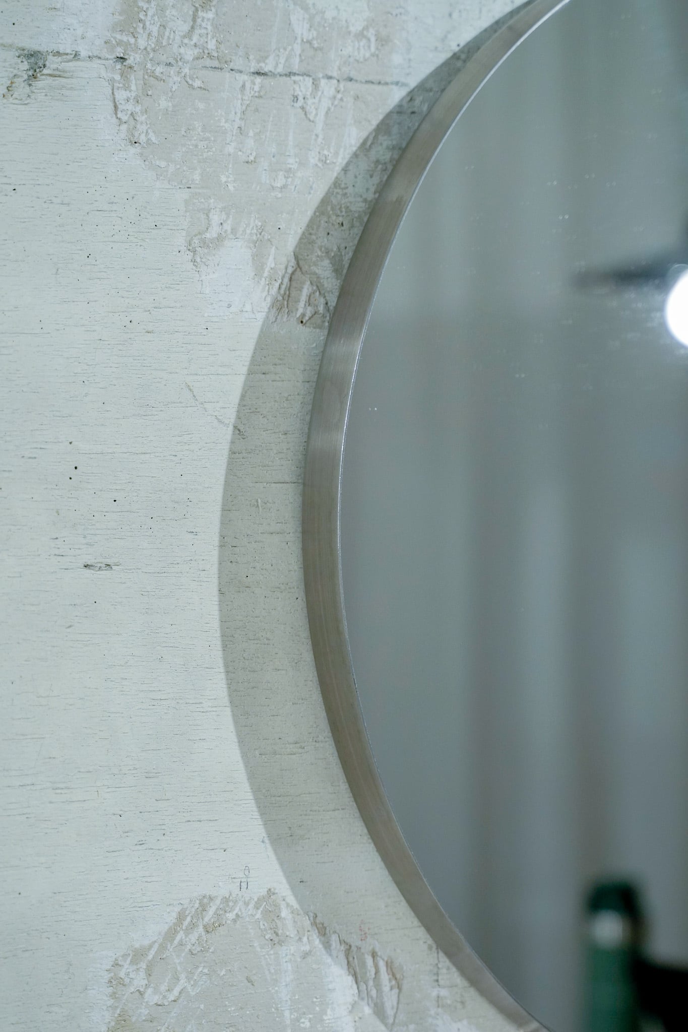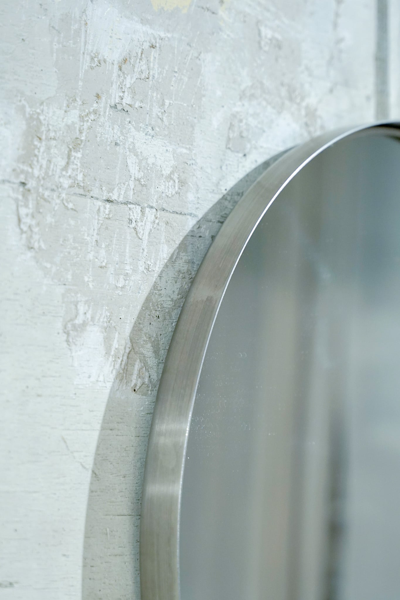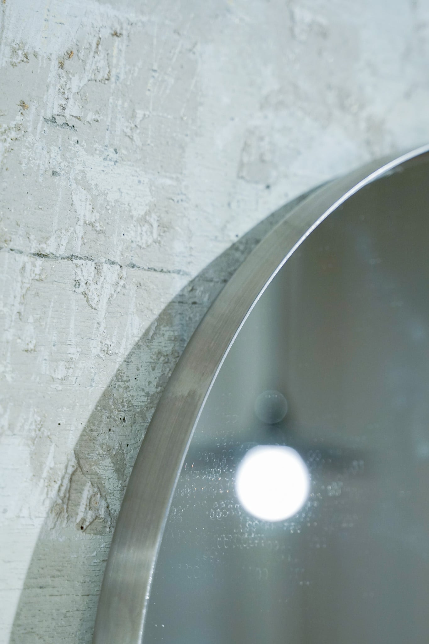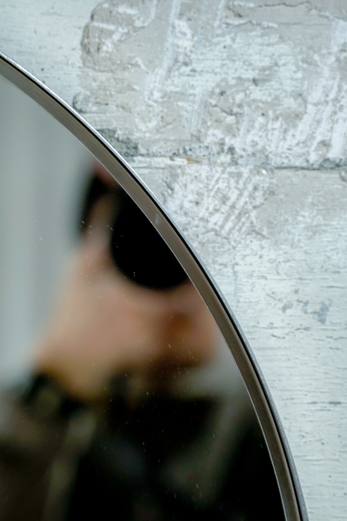 枠は約1ミリ、すごくクールな印象で、白い壁にもコンクリの壁にも似合います。掛けてもいいし、転がらないように工夫をしたら台に置いて使うのも良さそう。