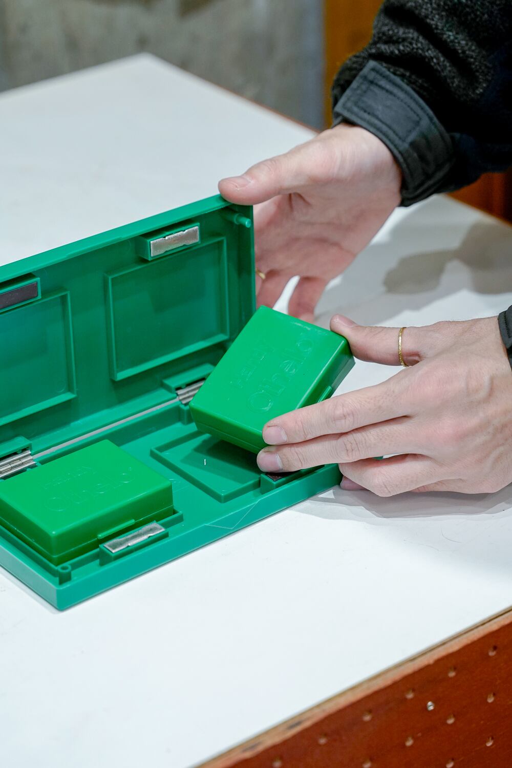 立体感があるロゴが刻まれた石ケース、開閉が気持ちいい外側ケース、ラインも印刷ではなく立体的な仕上がりです。