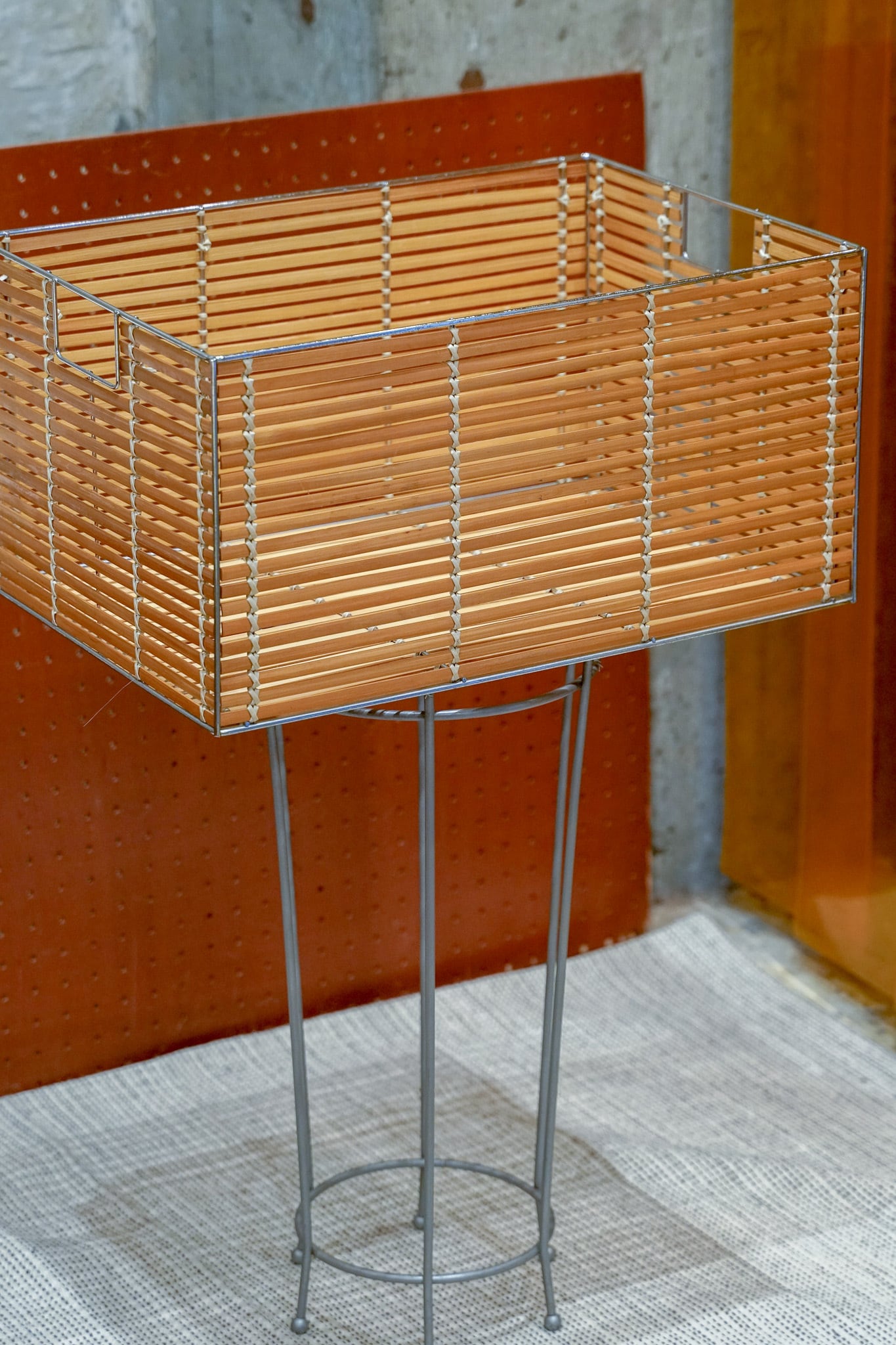おそらく、傘立てとカゴをわざわざドッキングして作成したであろう、脚付のカゴです。