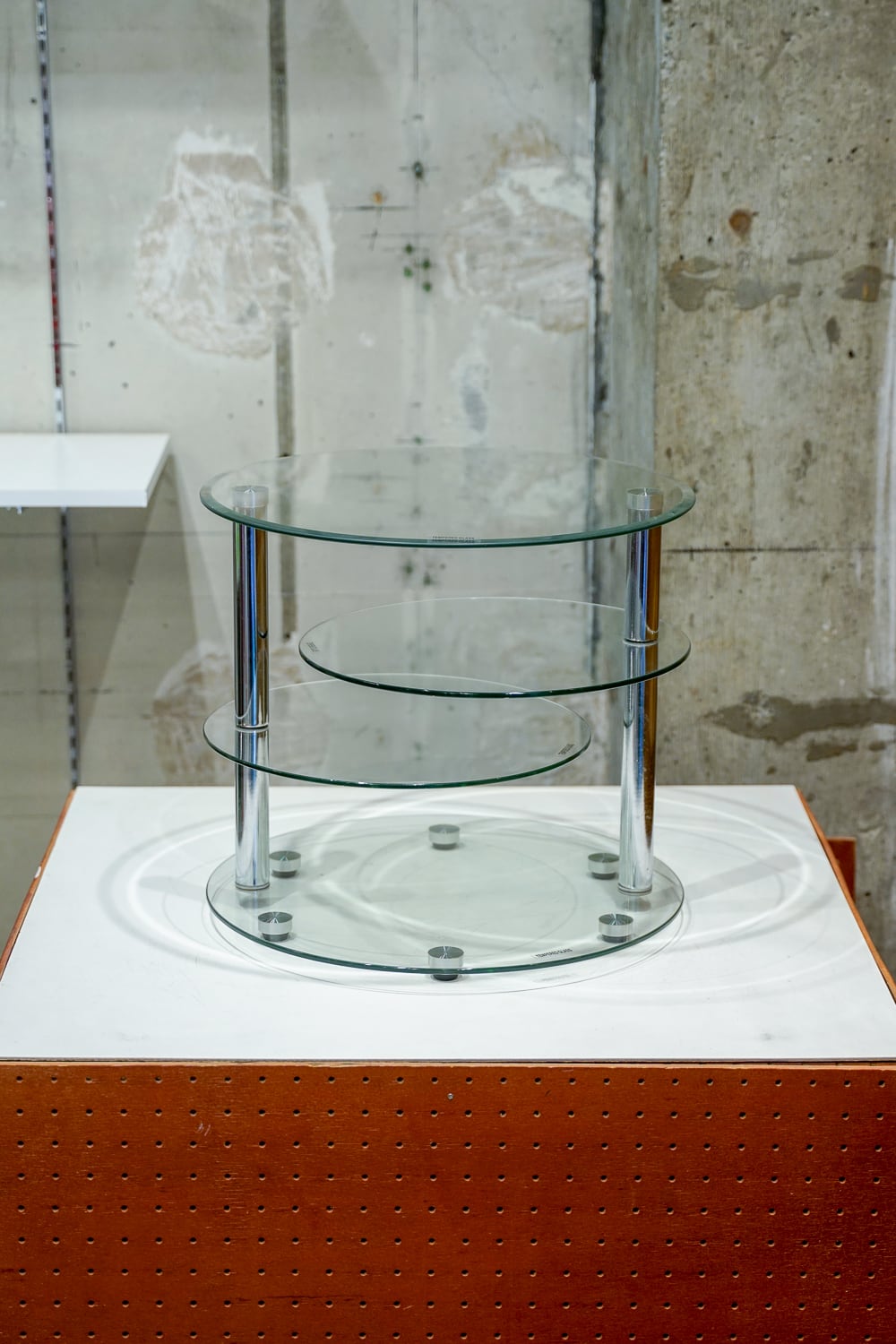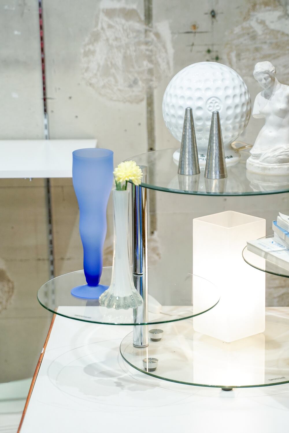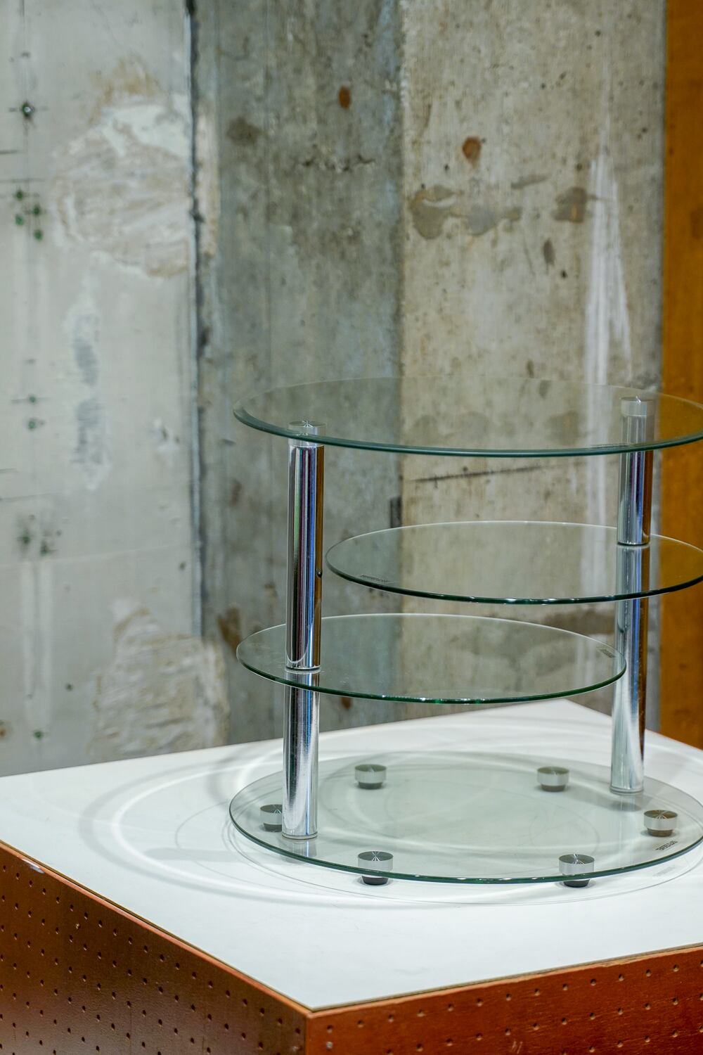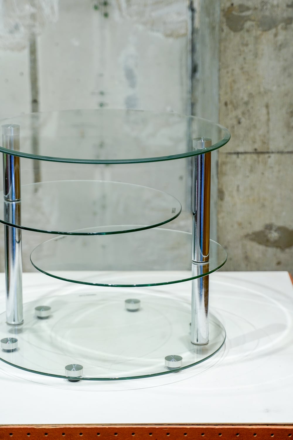 う〜ん、いいですね。枠のないガラスの円盤が4段になっている棚です。枠がない分、ほんとうにシンプルで浮遊感があります。