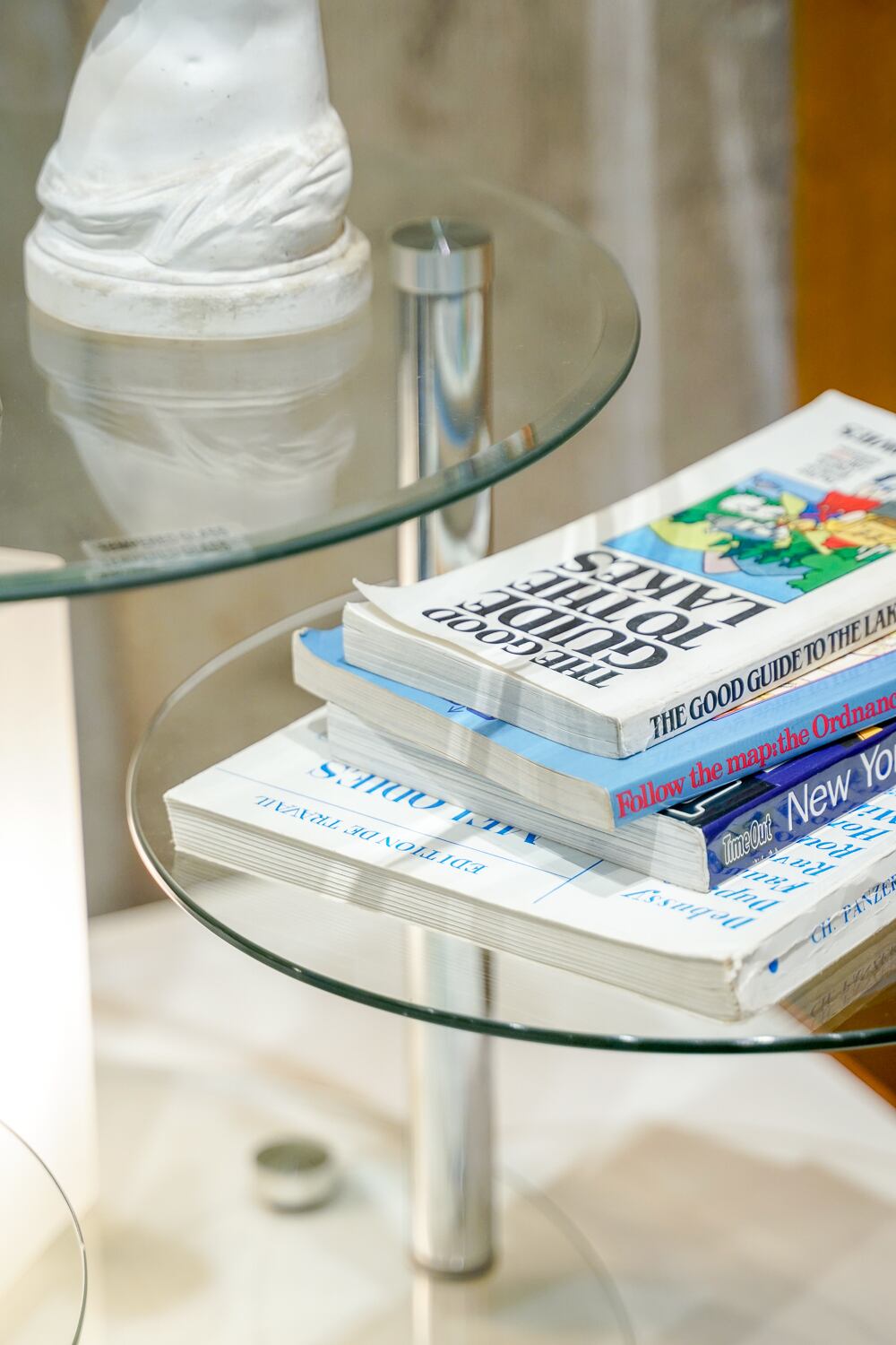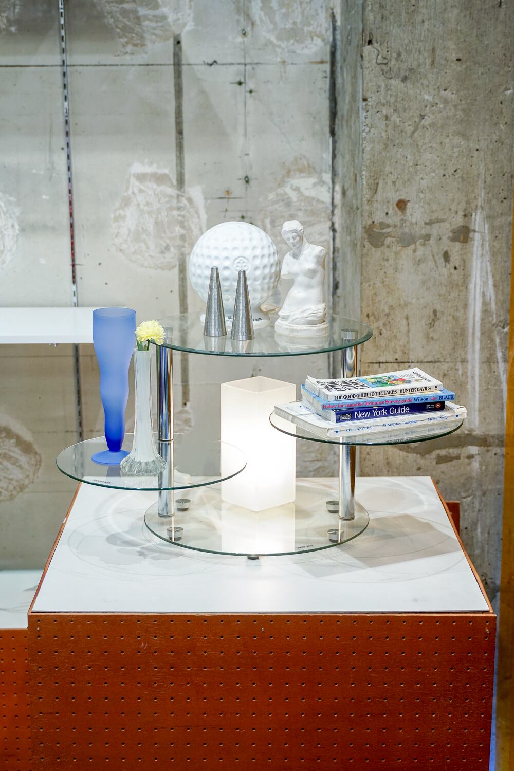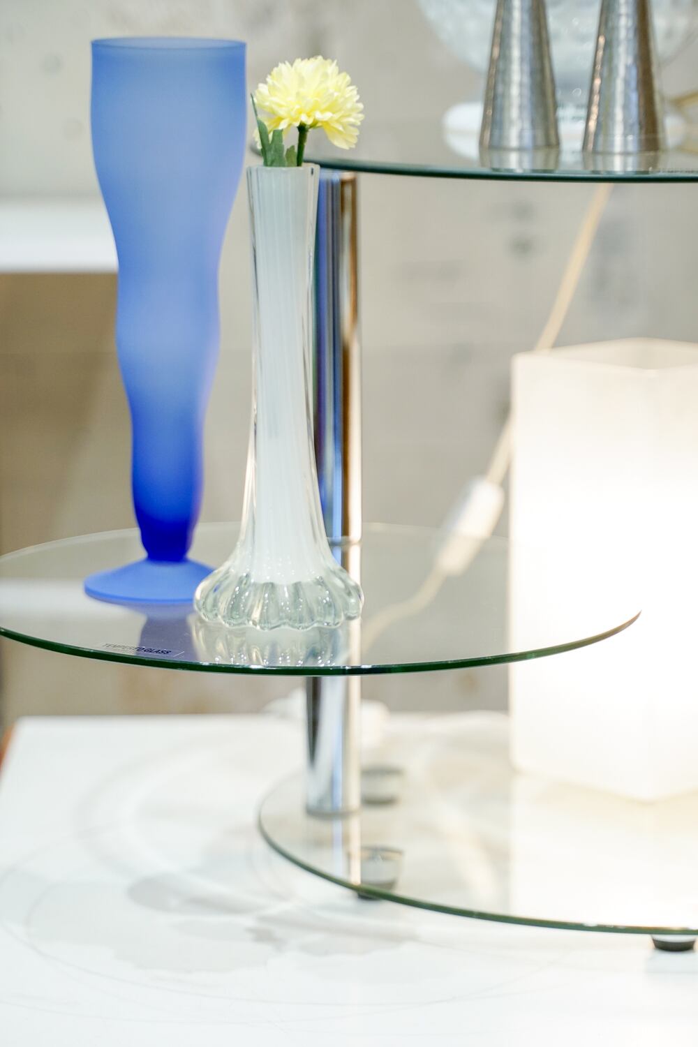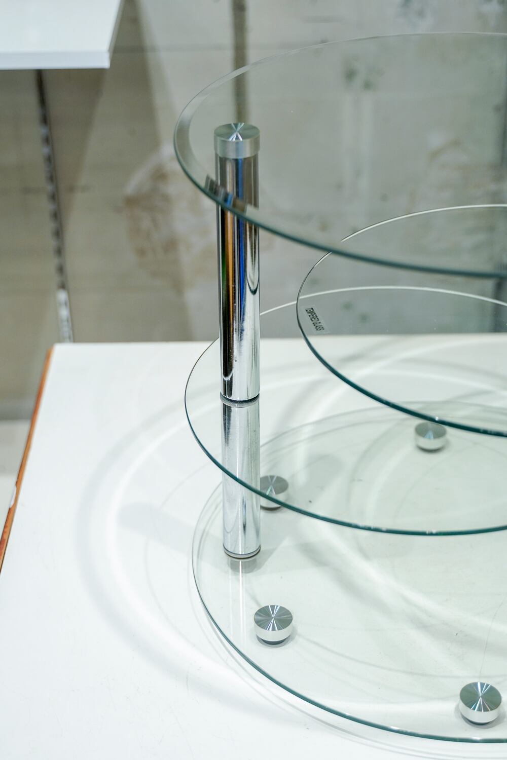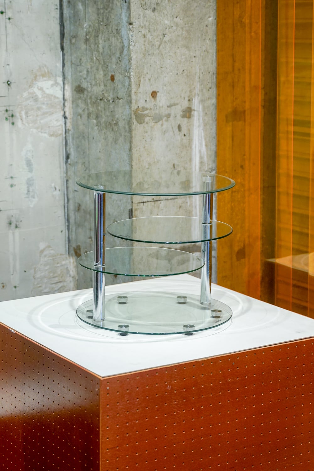 う〜ん、いいですね。枠のないガラスの円盤が4段になっている棚です。枠がない分、ほんとうにシンプルで浮遊感があります。
