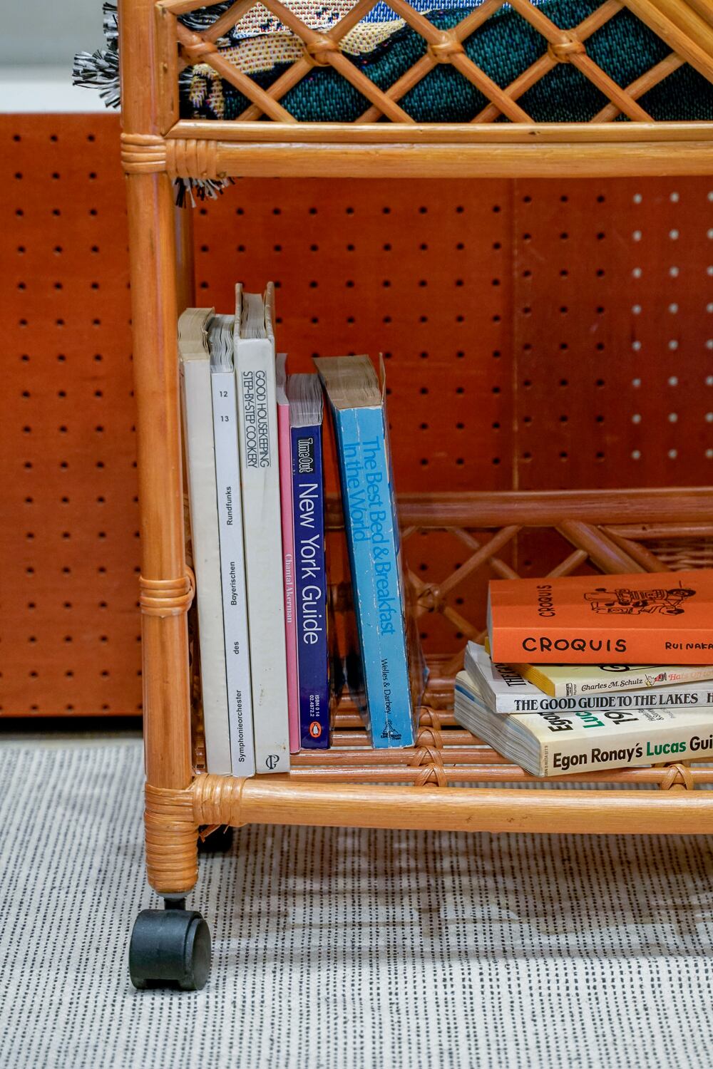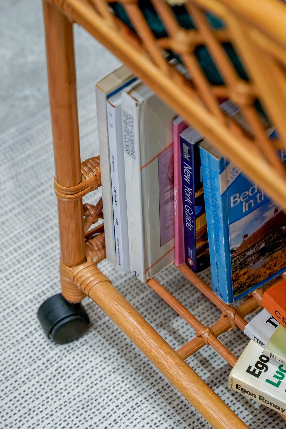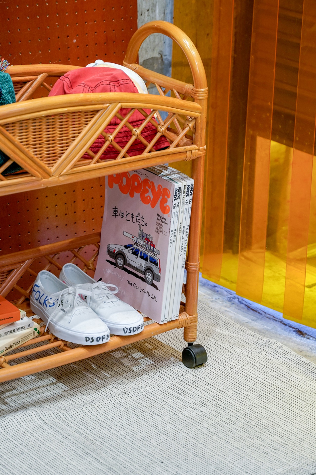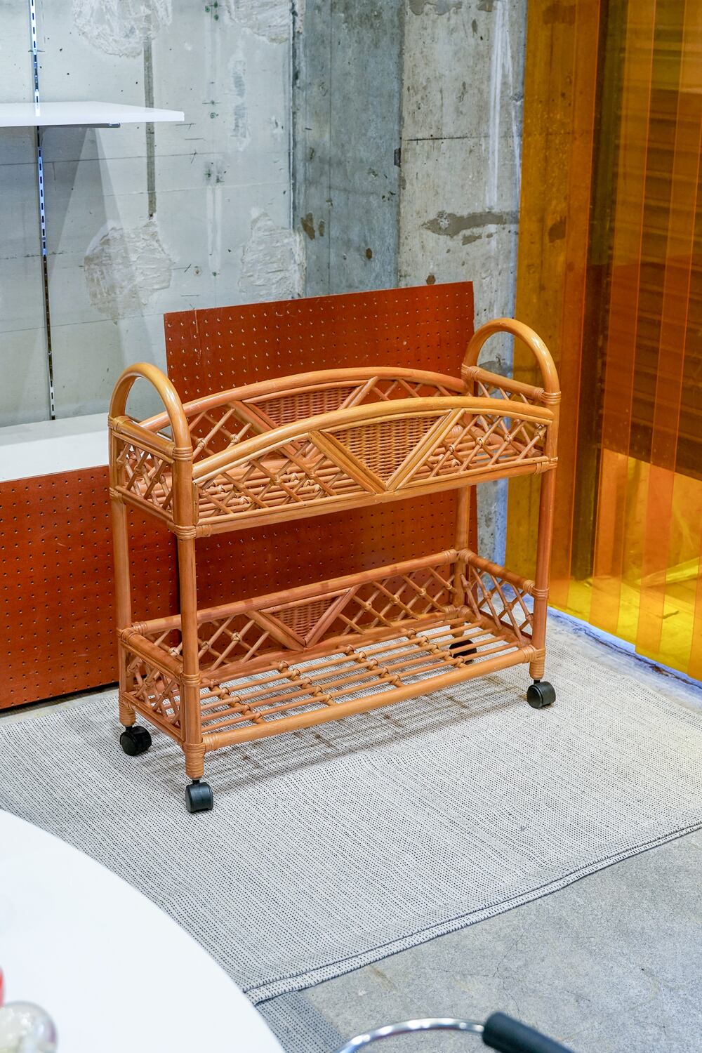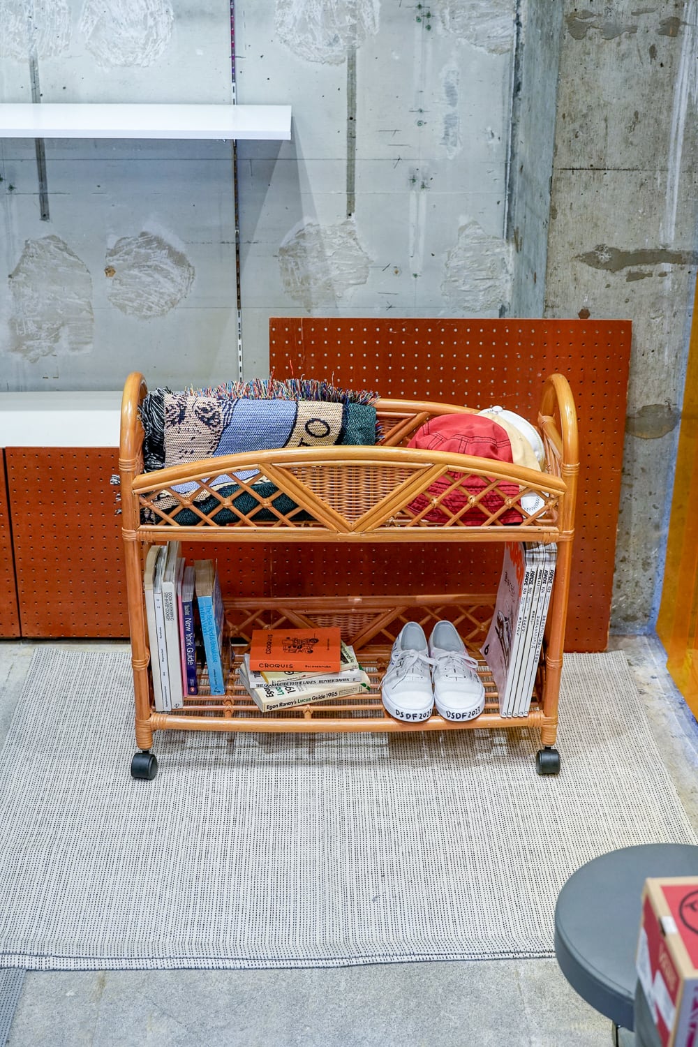 こういうラタンのかごってファブリックとか置きたくなりますよね〜。下段に植物も置けそう。好きにカスタマイズしちゃってください!