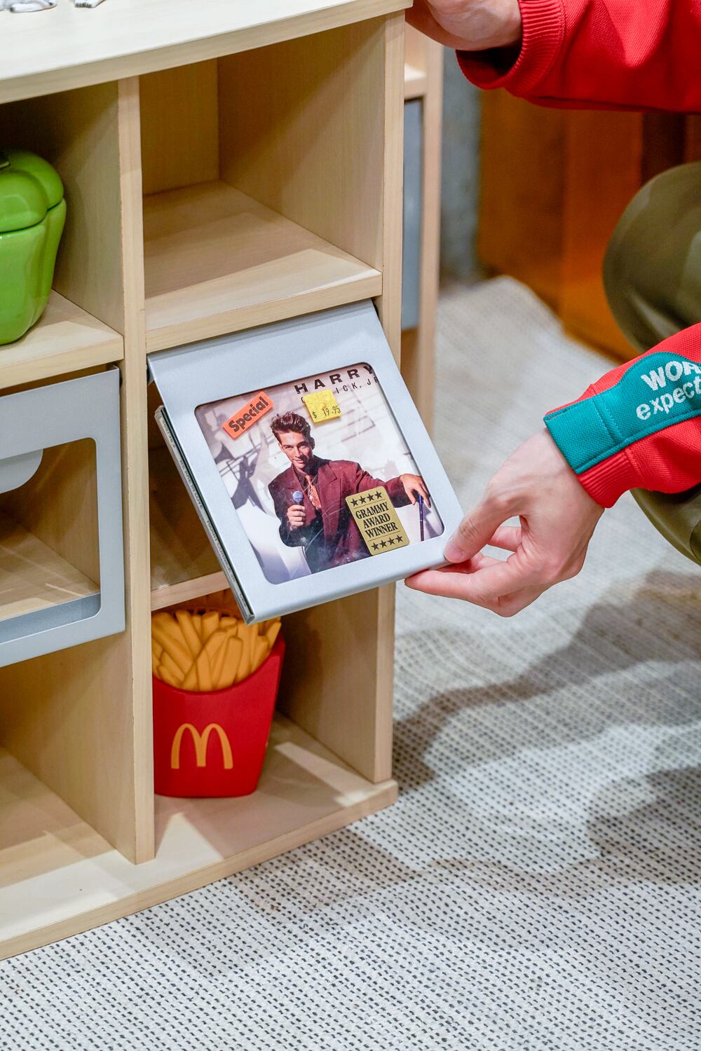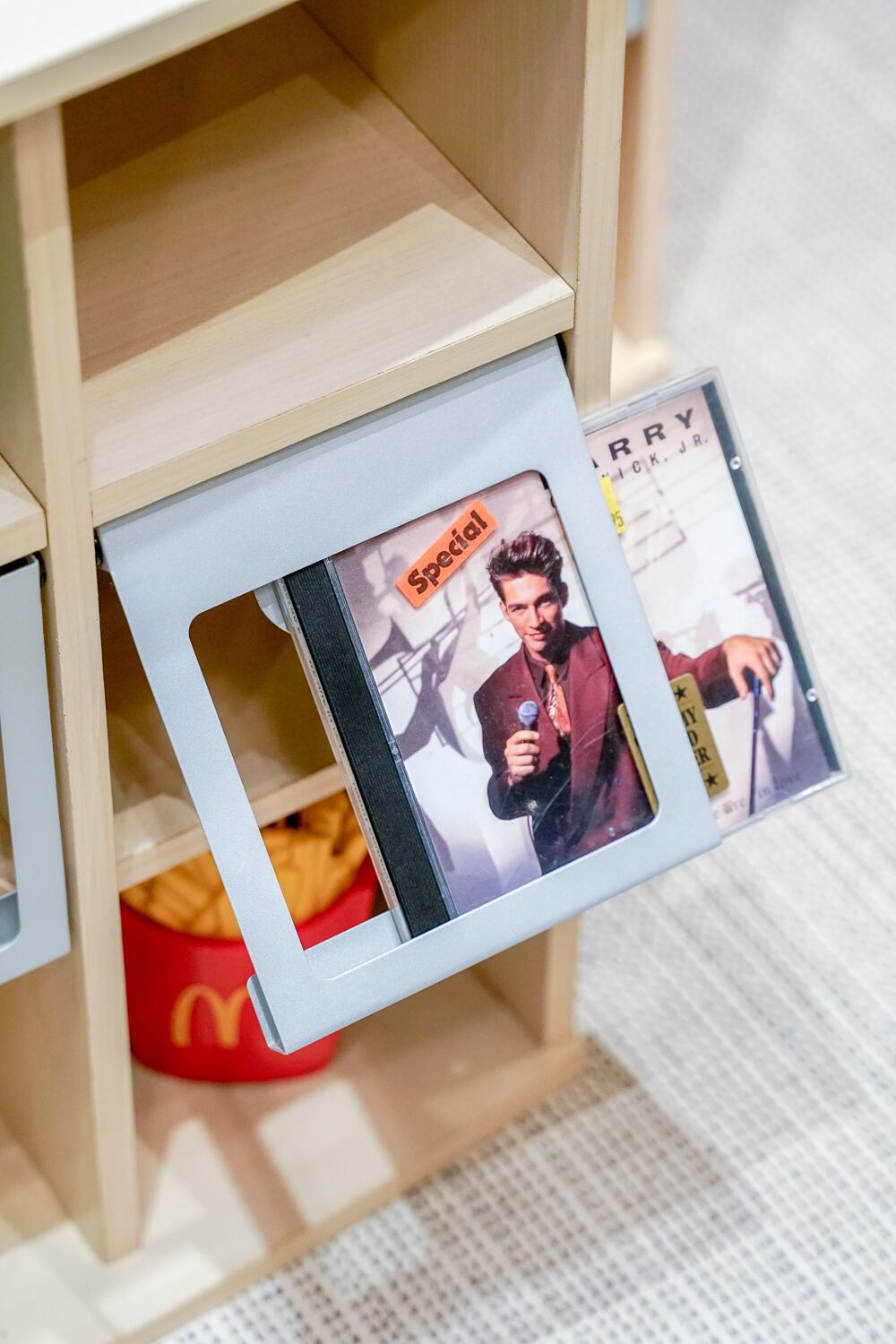 ポイントはシルバーの部分。こちらにお気に入りのCDを差し込んで、ジャケットを見せて飾ることができます。もちろんその奥の空間にも収納可能。